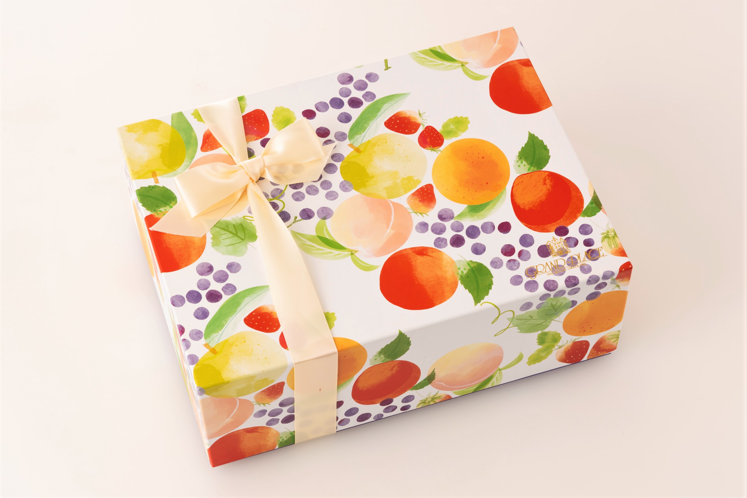 和素材フルーツゼリーを入れる化粧箱には、カラフルなフルーツを描き、華やかなパッケージに仕上げました。