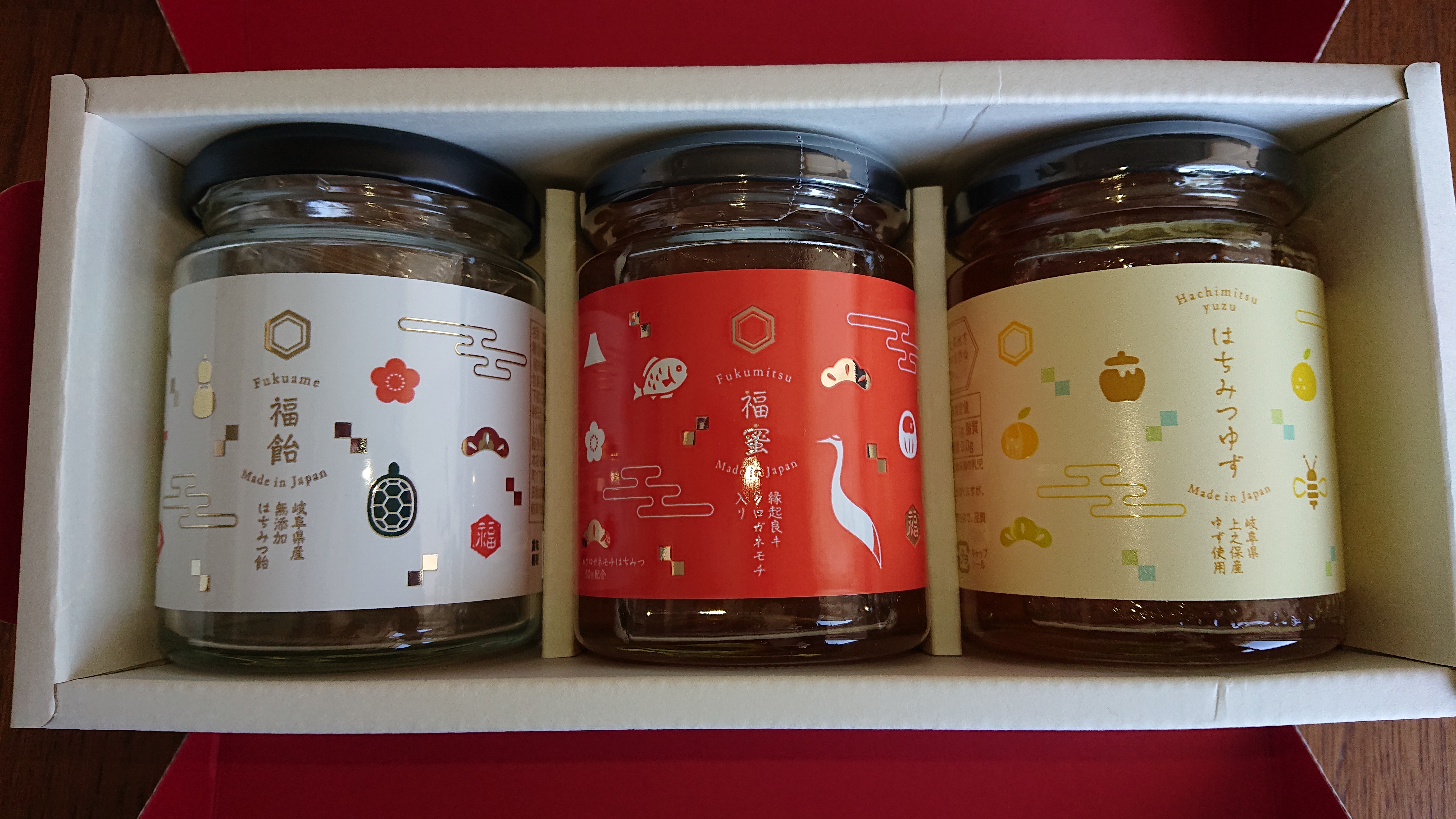 縁起の良い「福蜜(はちみつ)、福飴、柚子はちみつ」のお祝いセットです。ハネムーンの語源にもなっているはちみつは、幸せの贈り物として昔から人気があります。その中でも特に養蜂家の間で縁起が良いと言われているのがクロガネモチのはちみつ。名前の由来が「苦労なくお金持ちになれる」というところから来ているのと、はちみつ自体が栄養豊富なことがその理由。更に、清流と山々に囲まれた岐阜県上之保地方のゆずを使用した「はちみつゆず」と、岐阜県のはちみつを使った無添加はちみつ飴がセットになった、縁起の良いギフトセット。おめでたいパッケージで届くので、お祝いギフトとしてもおすすめです。