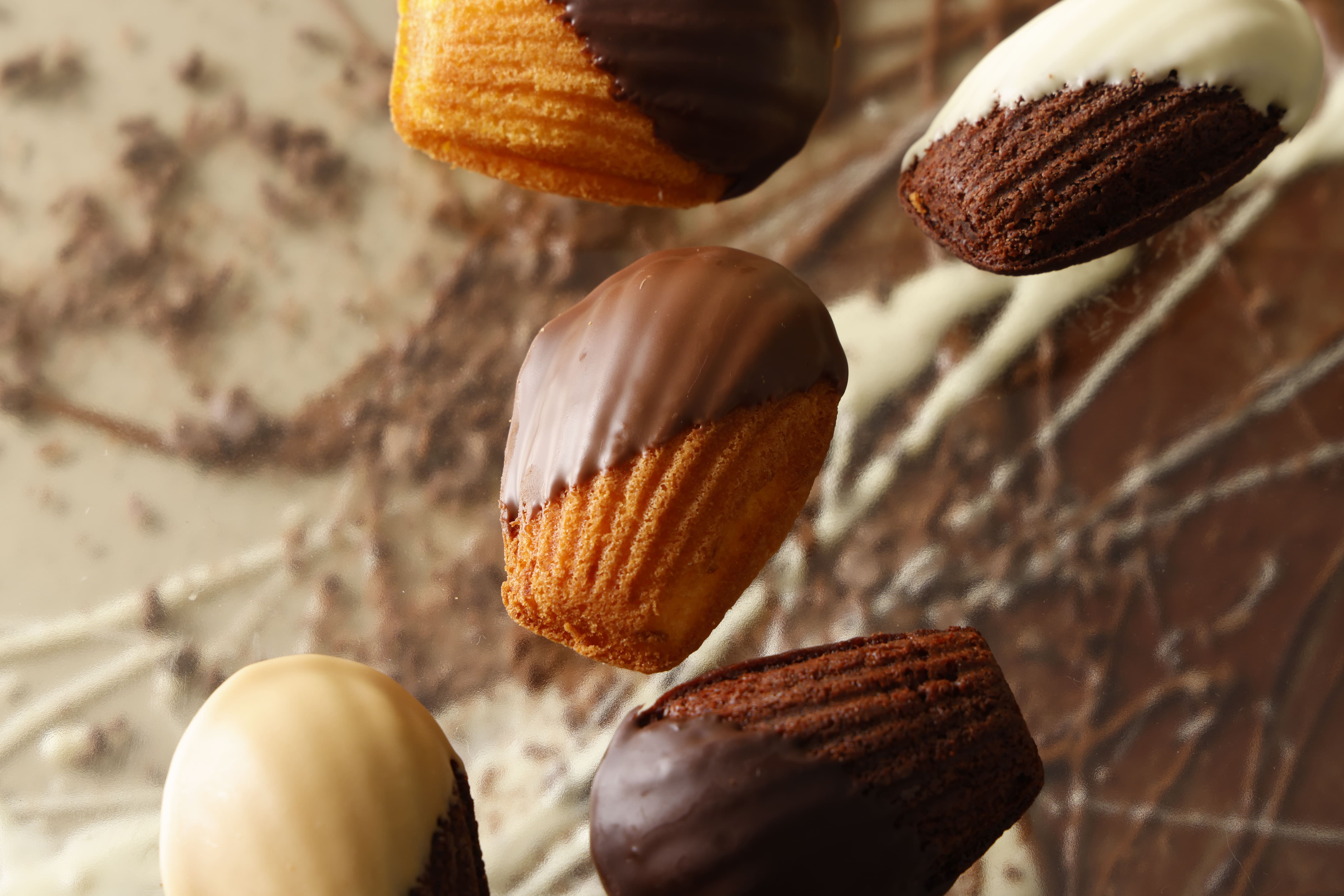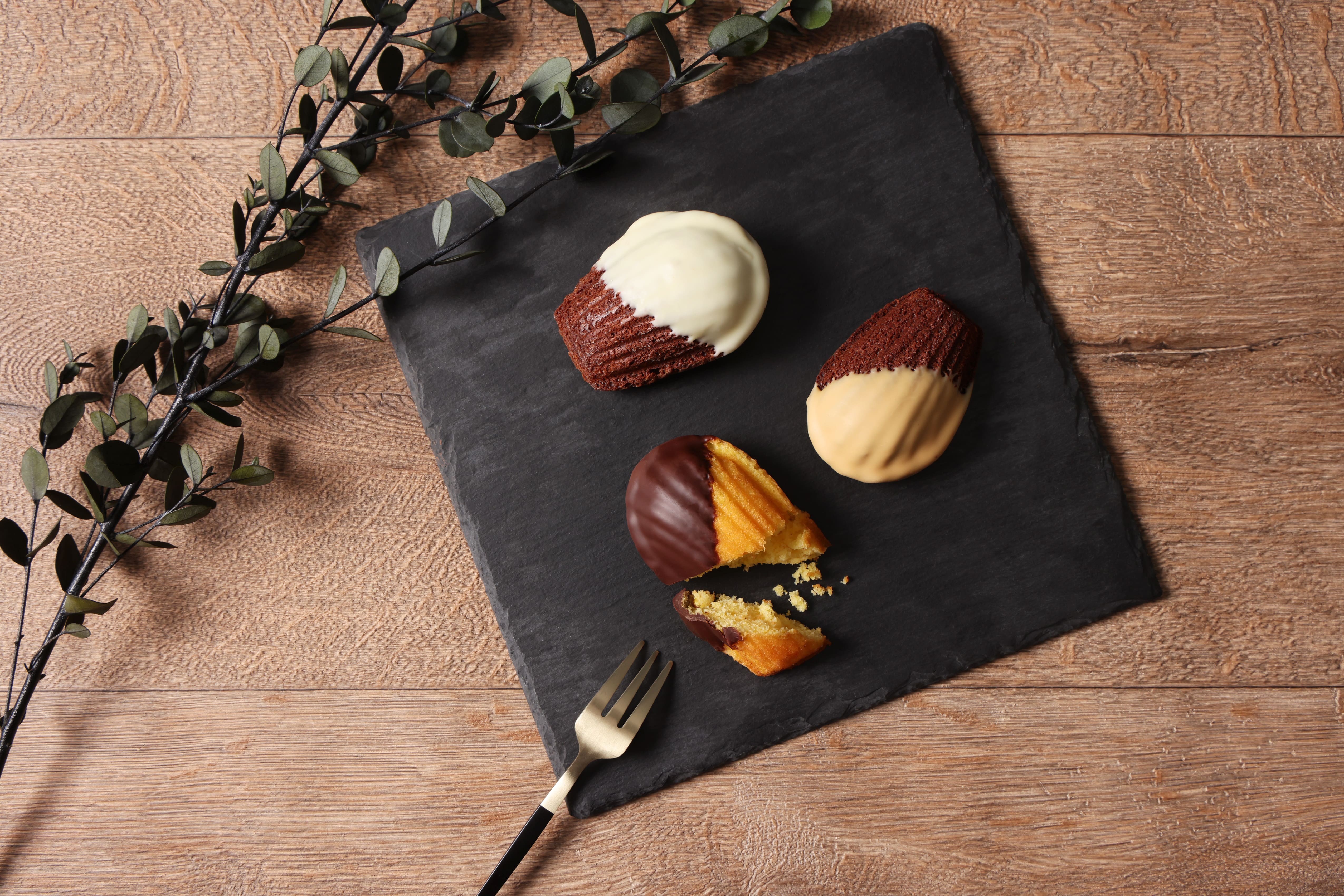 プレーンとショコラの2種類の自慢のマドレーヌ生地に、カカオの産地や苦みの異なるチョコレートをディップ。