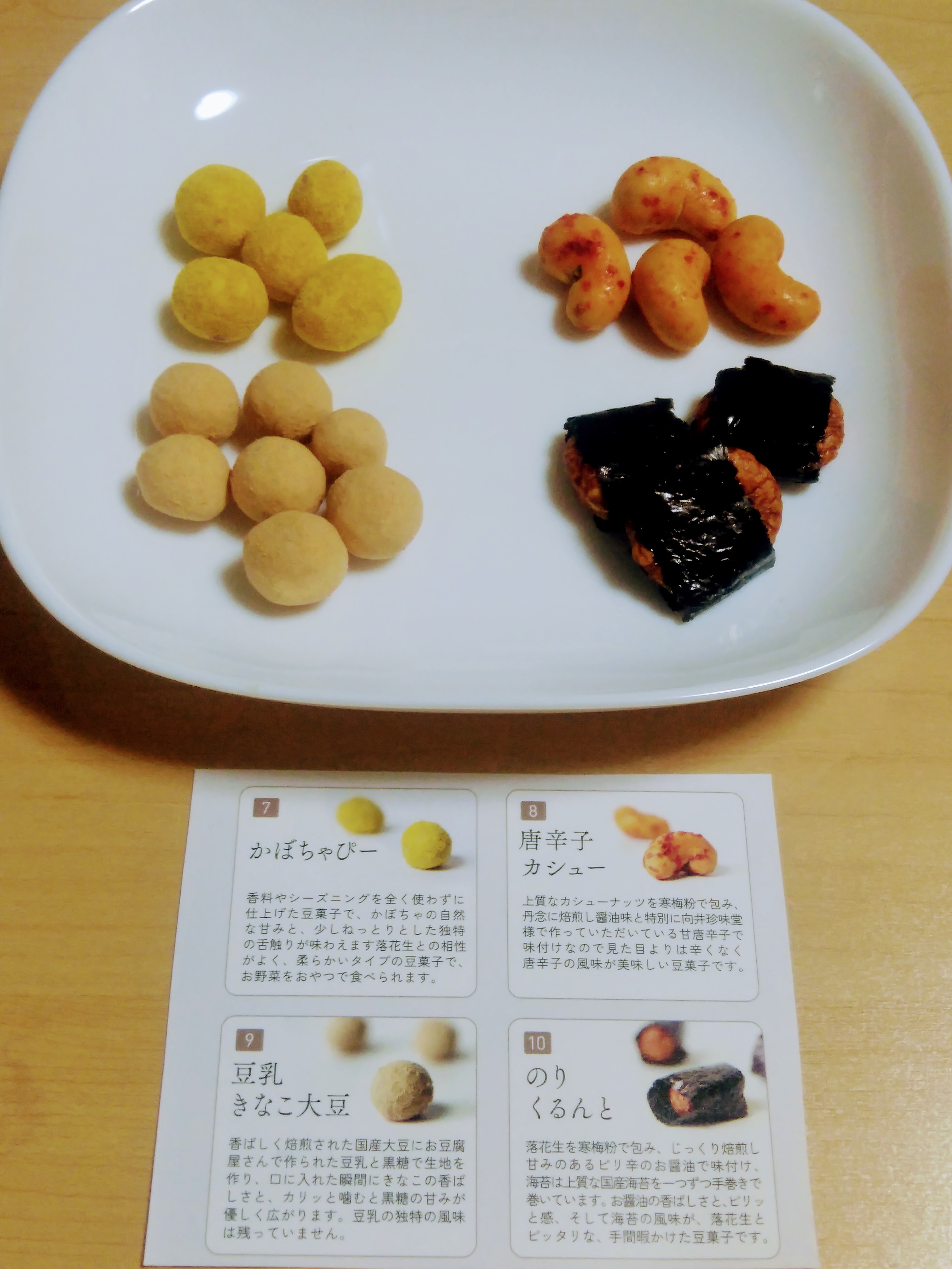 個包装な点もこのご時世うれしいポイントです。10種類の豆菓子が24個入っているのですが、一つ一つに何味かを描いた紙が貼られているので、「これはなに味?」と迷うことはありません。