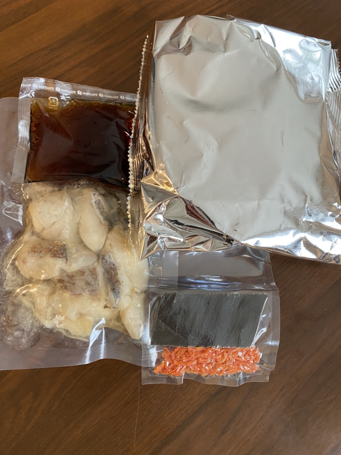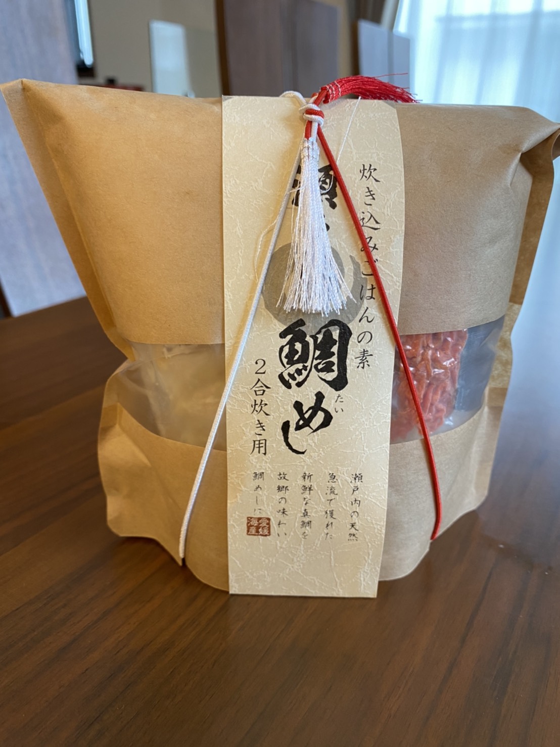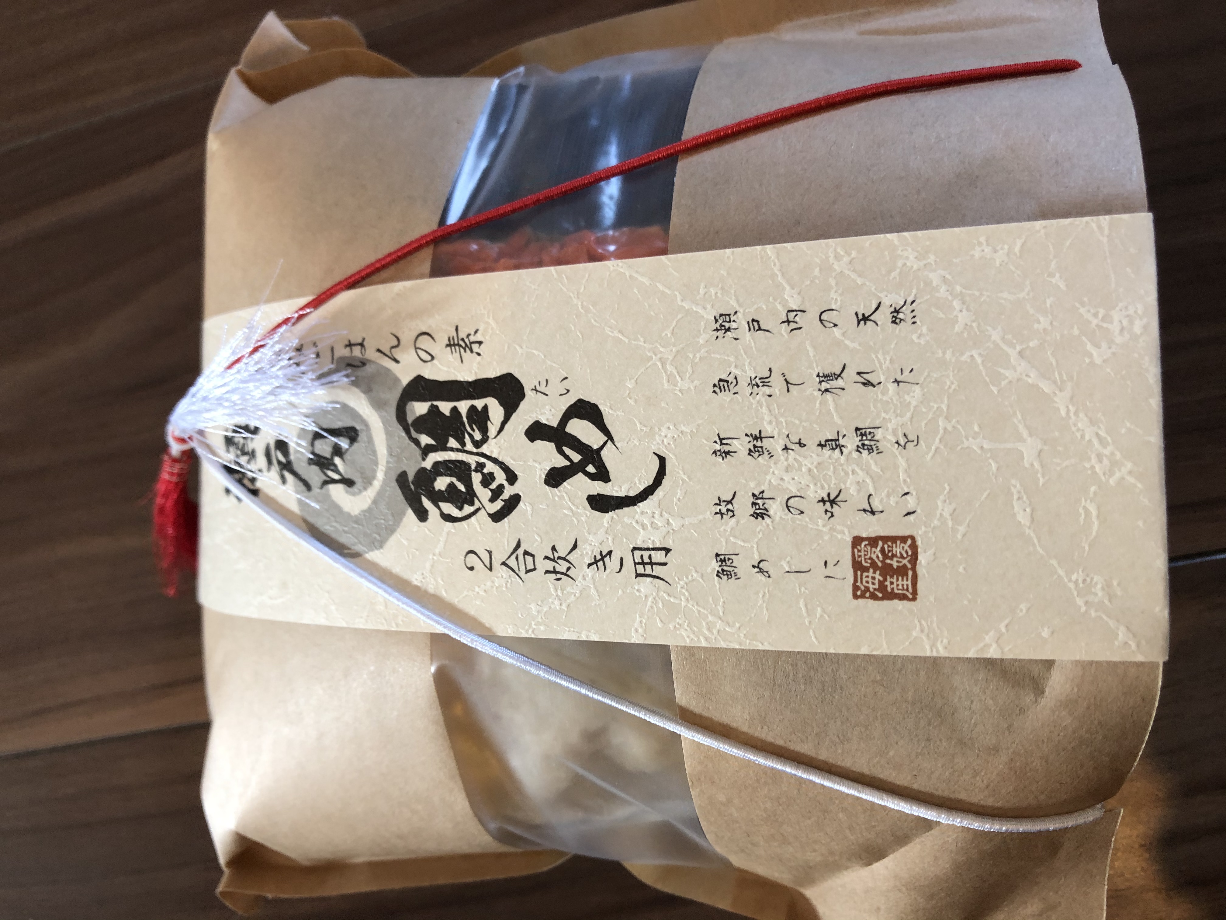「鯛めし」のセットは、希望の日時に到着。段ボール箱の中に、紅白の紐が掛った鯛めしのパッケージが入っていました。紅白の紐が華やかに感じました。パッケージの中には、焼いた鯛の身、昆布とニンジン、銀色の目立つパッケージの中には、伊予名産の松山あげが入っていました。後は、タレです。