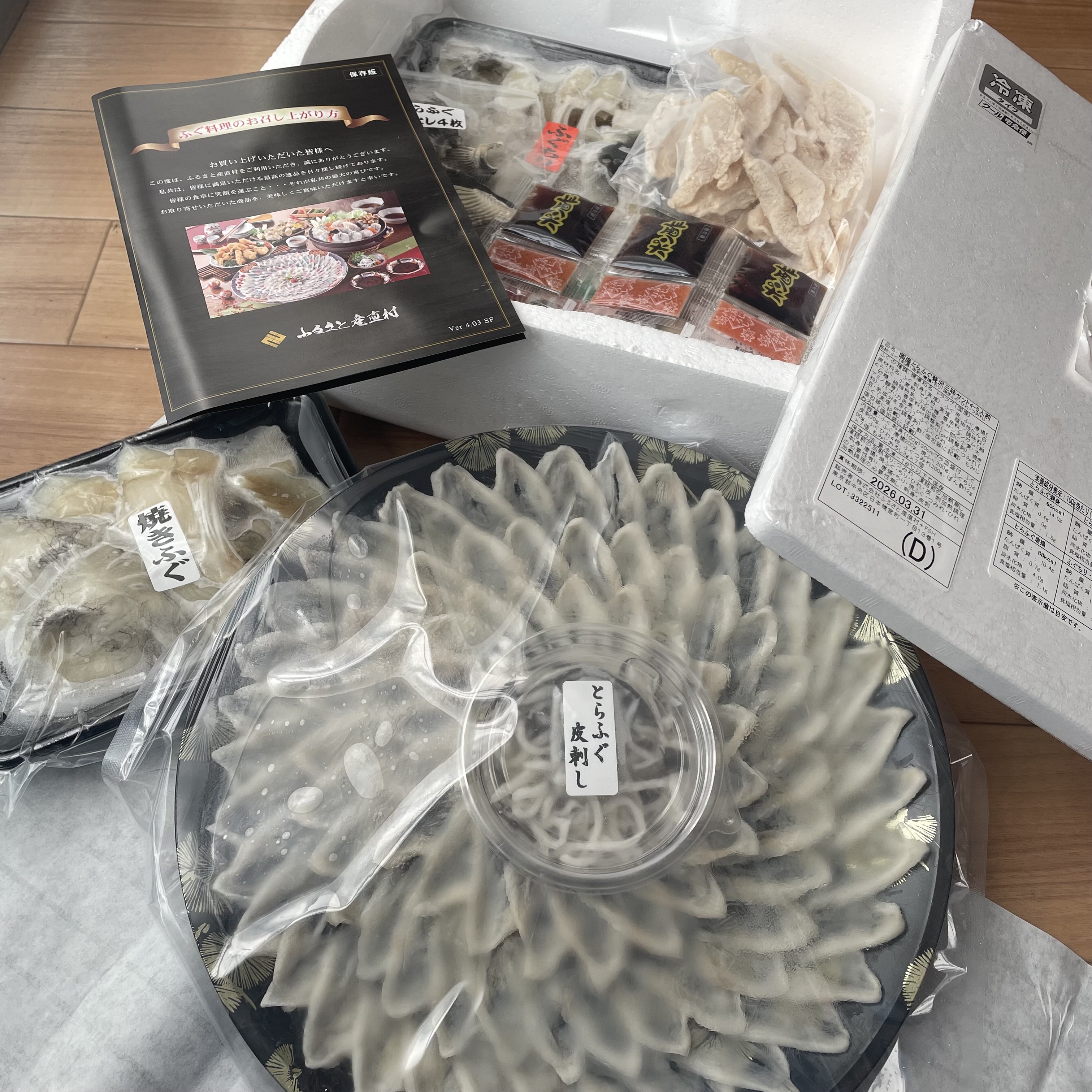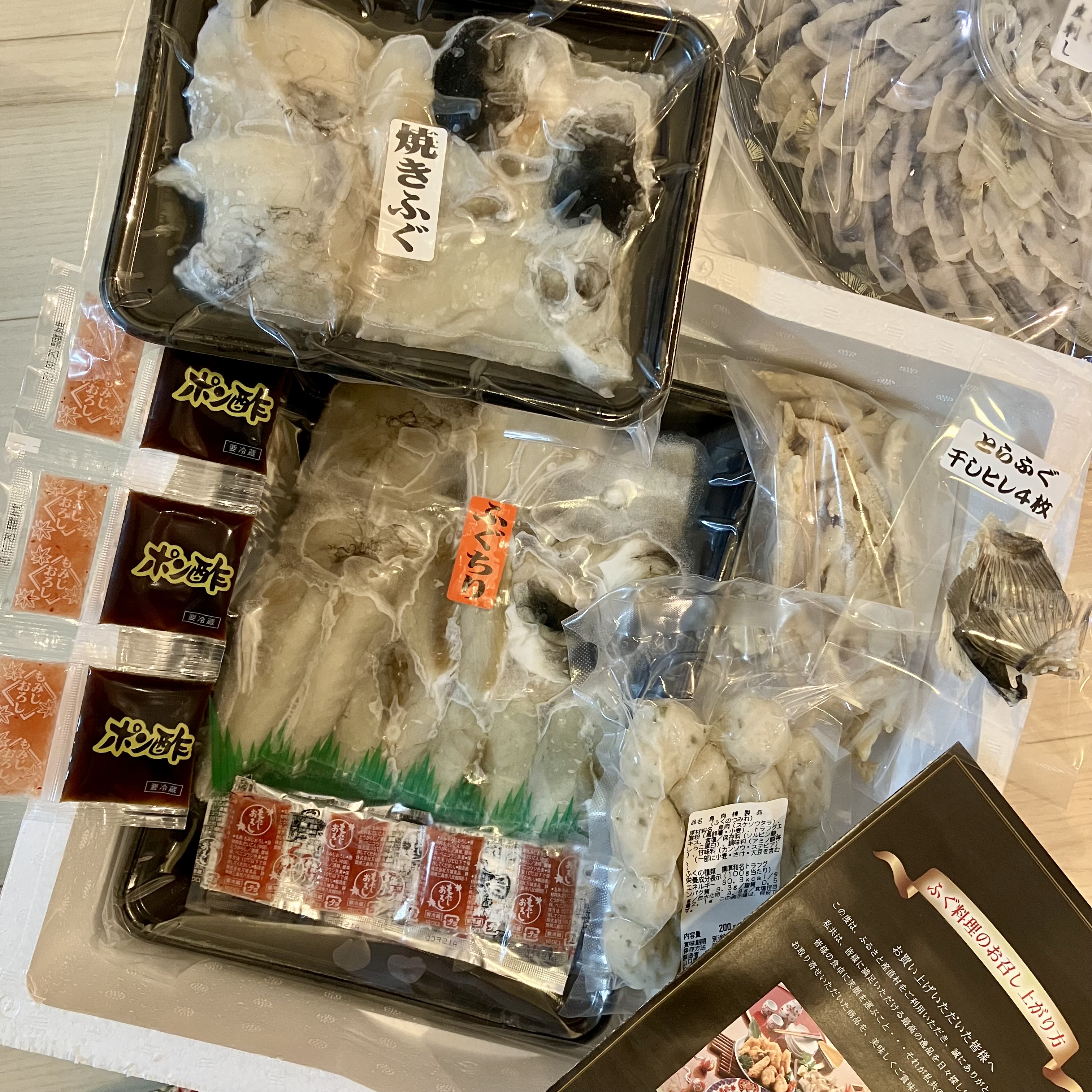 指定した日時通りに、冷凍された状態で届きました。大きな発泡スチロールの箱を開けると、立派なふぐ刺しがドーンとお目見えし、その下にもたくさんのふぐ料理が入っていて胸が高鳴りました。食べ方が丁寧にわかりやすく書かれたパンフレットをよく読んで調理しました。