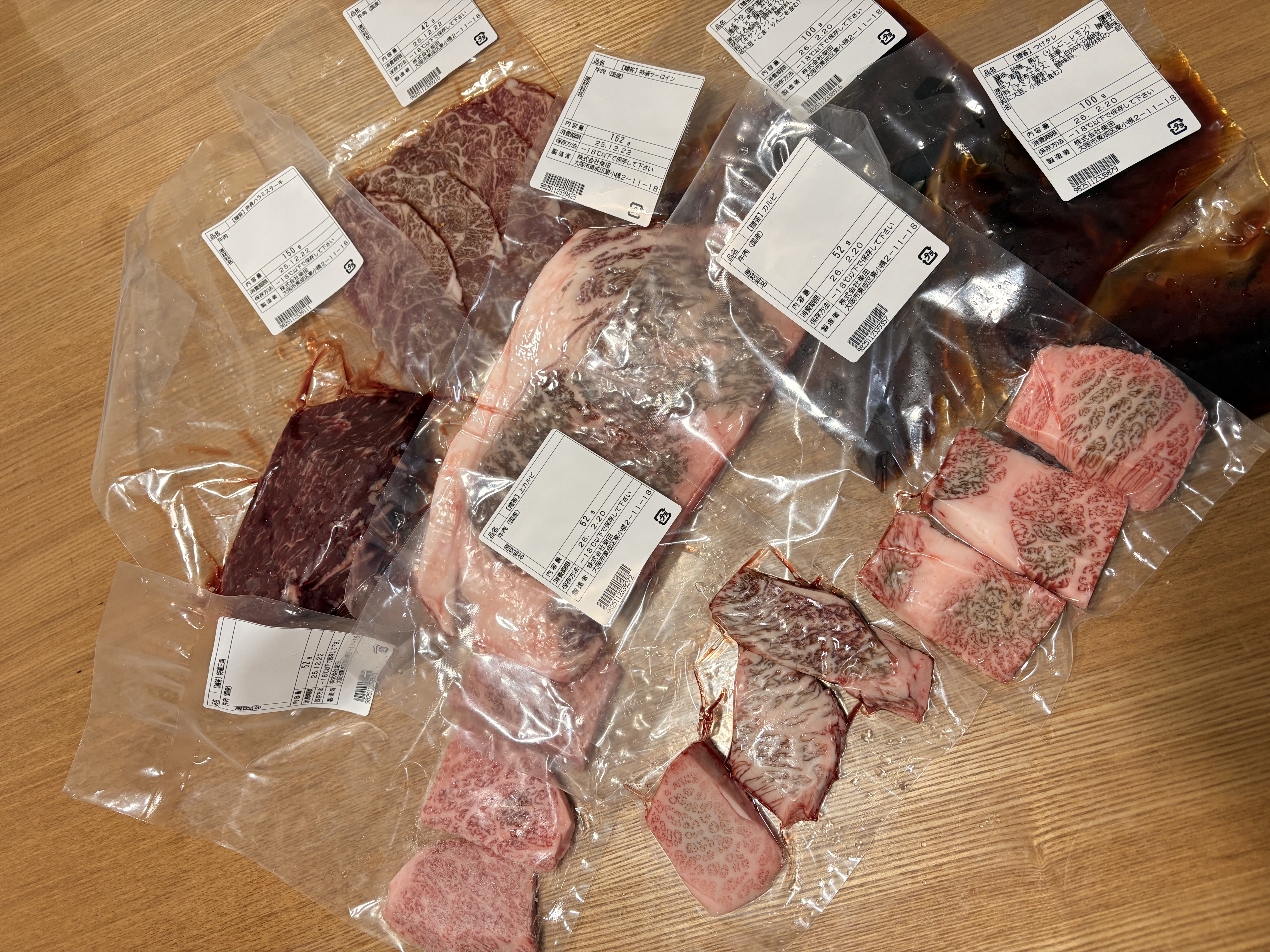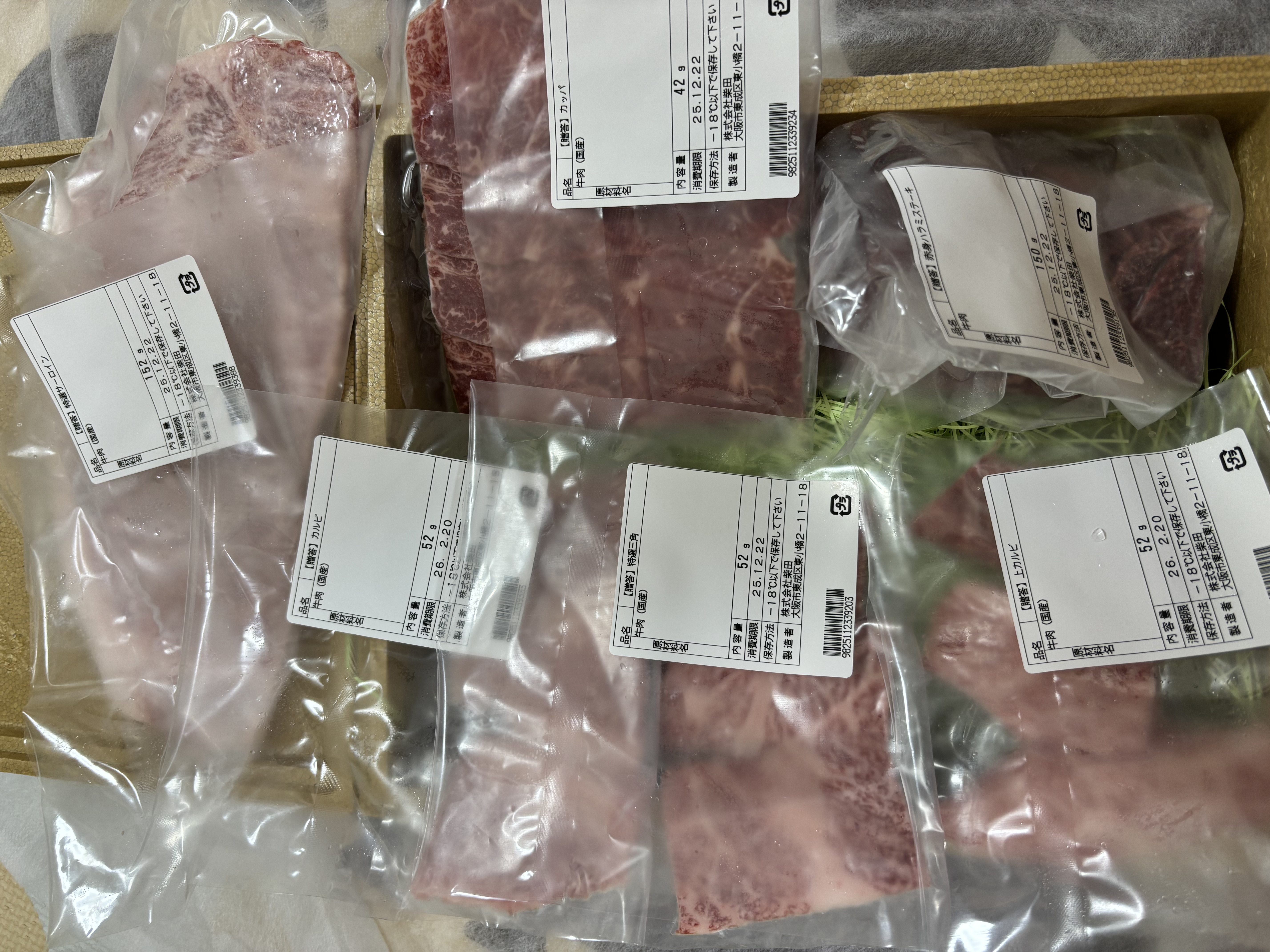 不織布の布地に包まれて、ベージュの高級そうな発泡スチロールに敷き詰められてお肉とツケダレ等が入ってました!良く聞く名前のものもあれば、こんな名前の部位もあるんだーと初めてのものもしばしば。