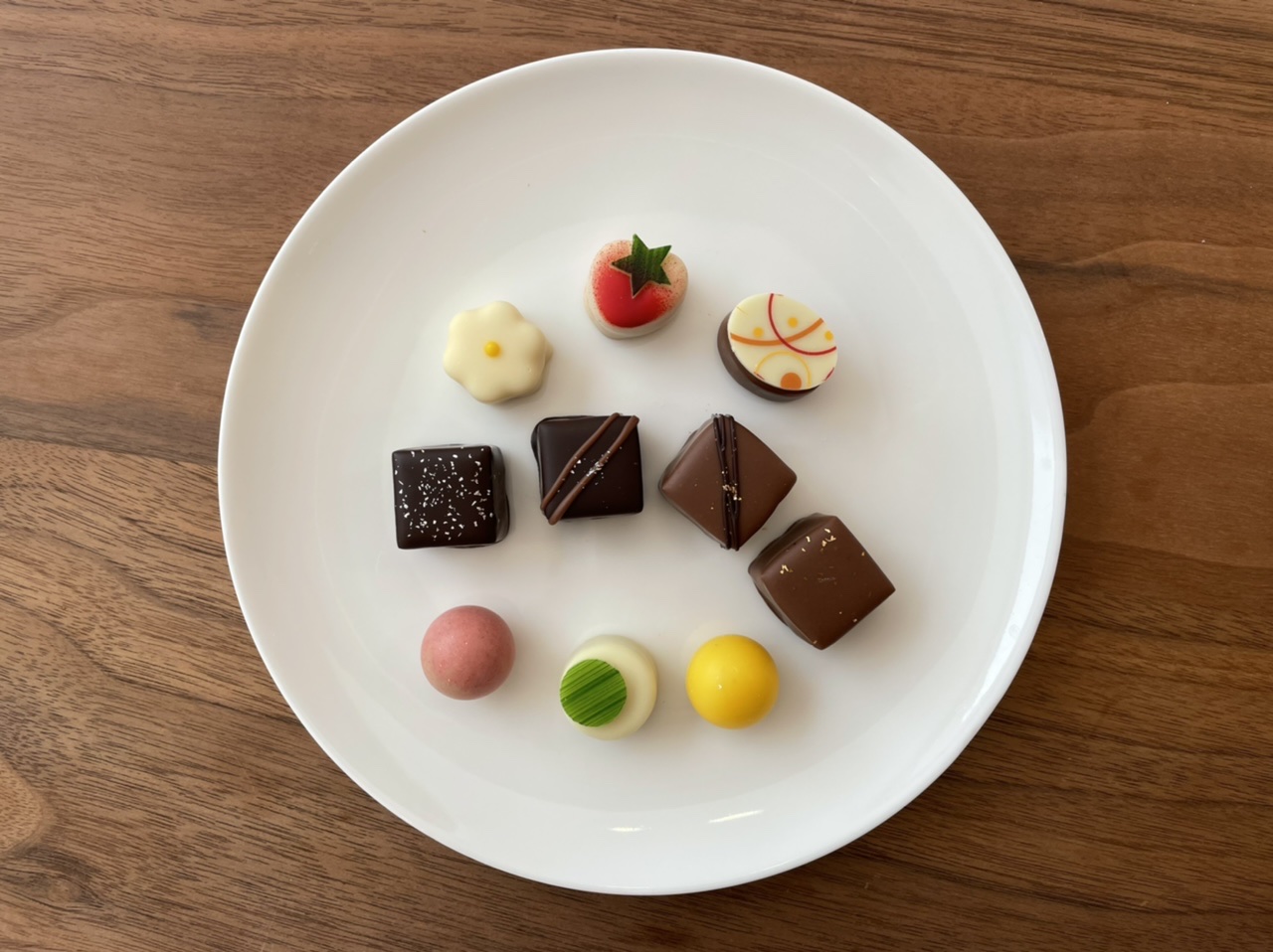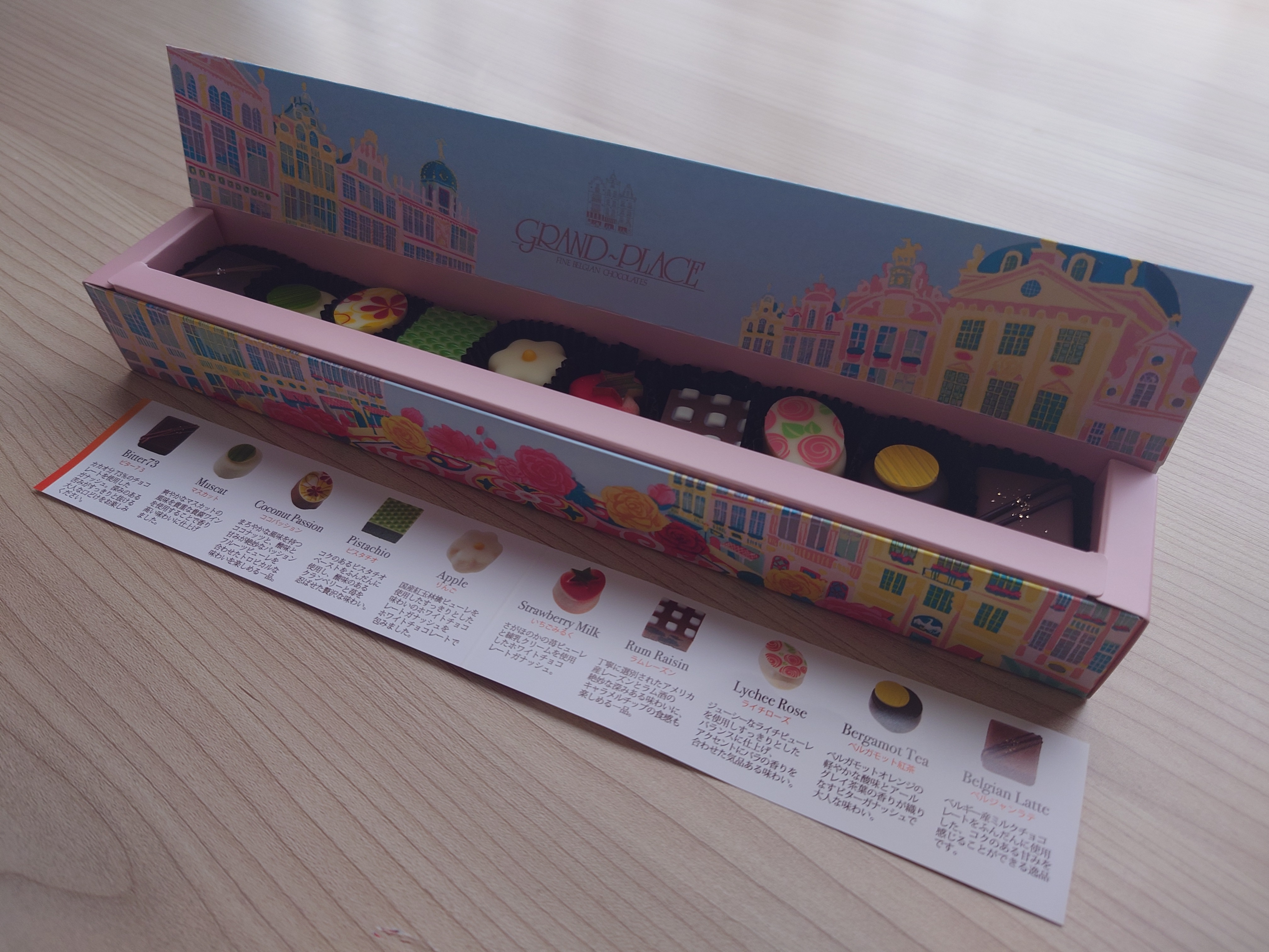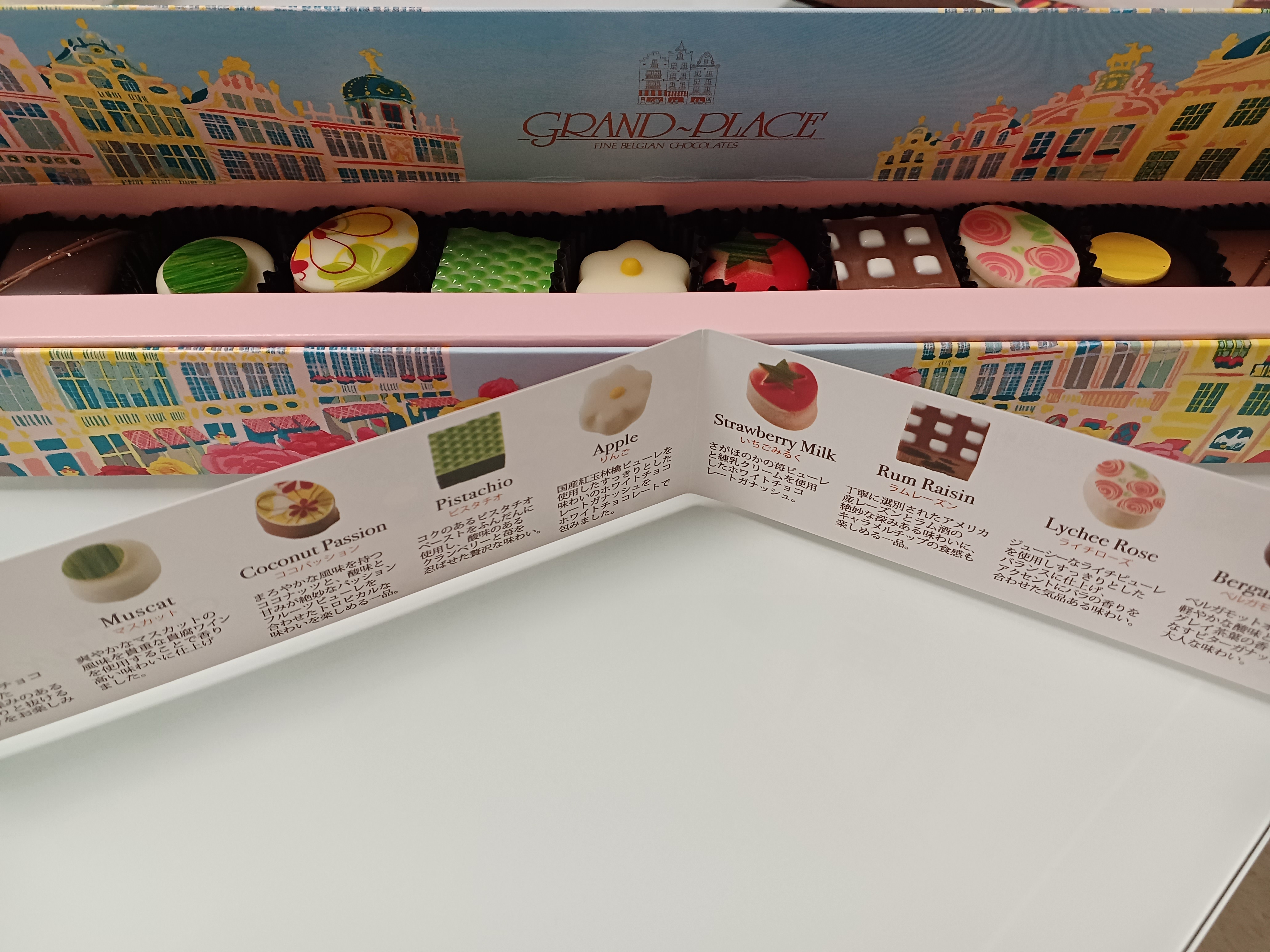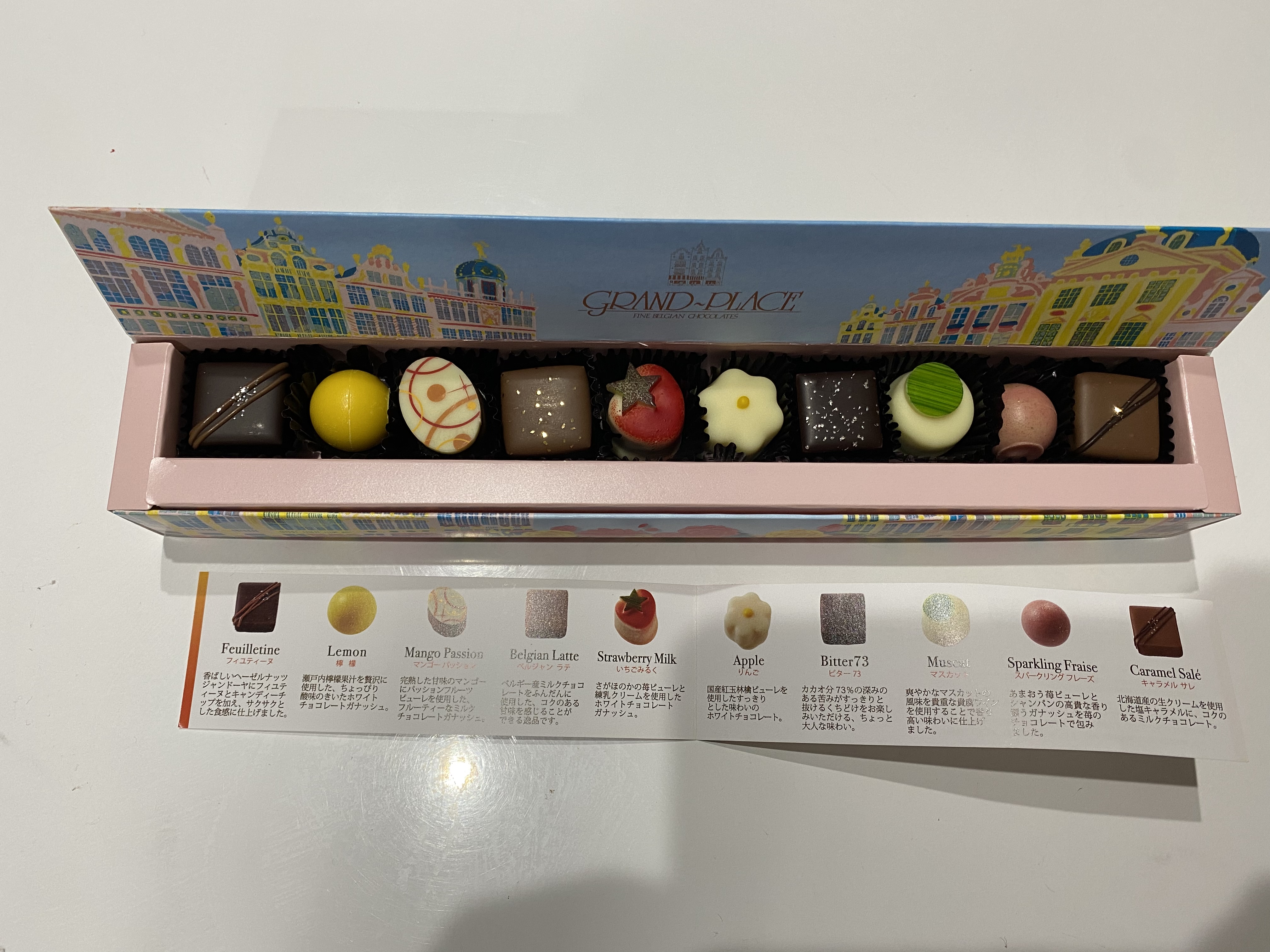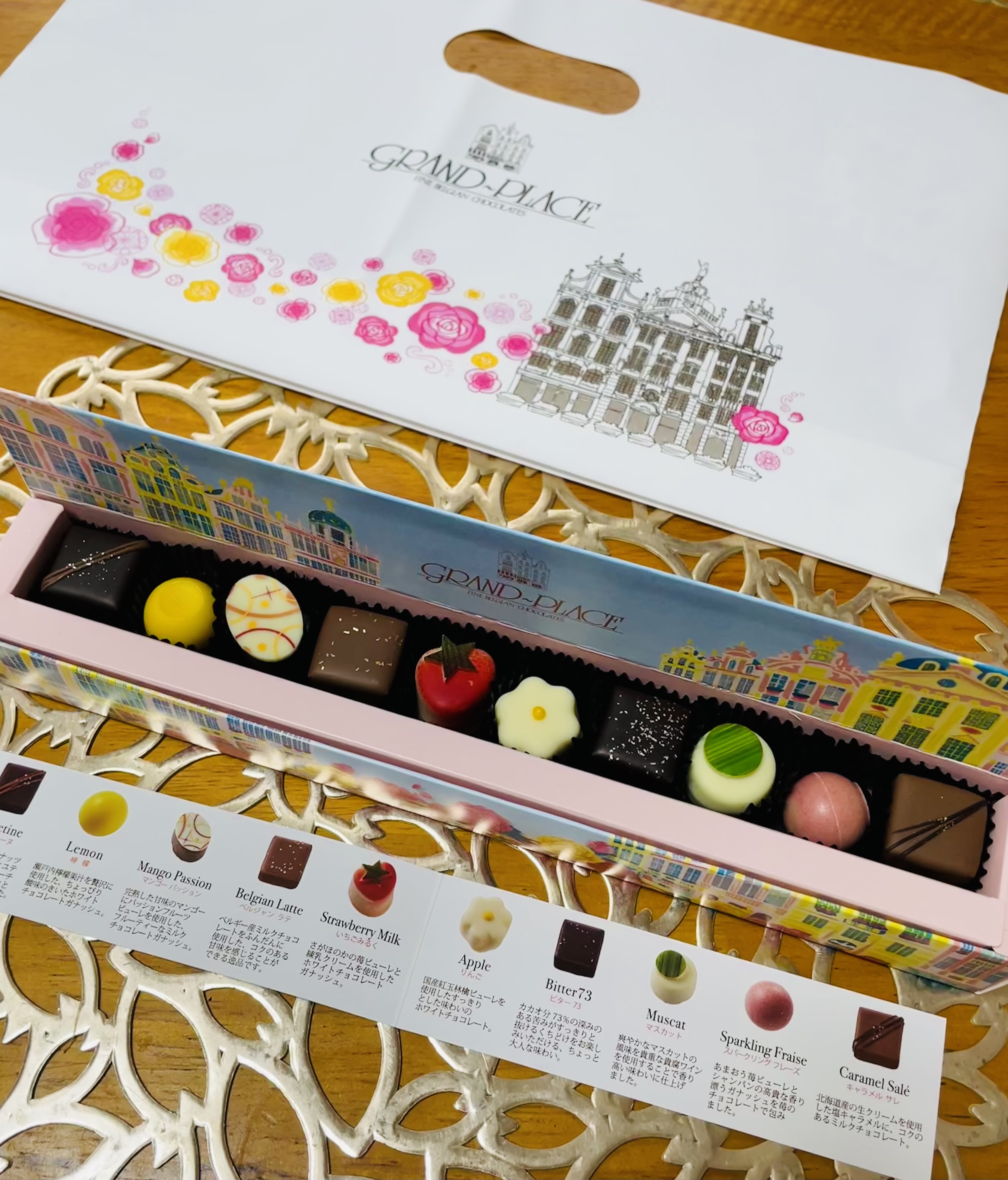 内容量:ビター73、マスカット、ココパッション(新作)、ピスタチオ、りんご、いちごみるく、ラムレーズン、ライチローズ(新作)、ベルガモット紅茶、ベルジャンラテ 各1個