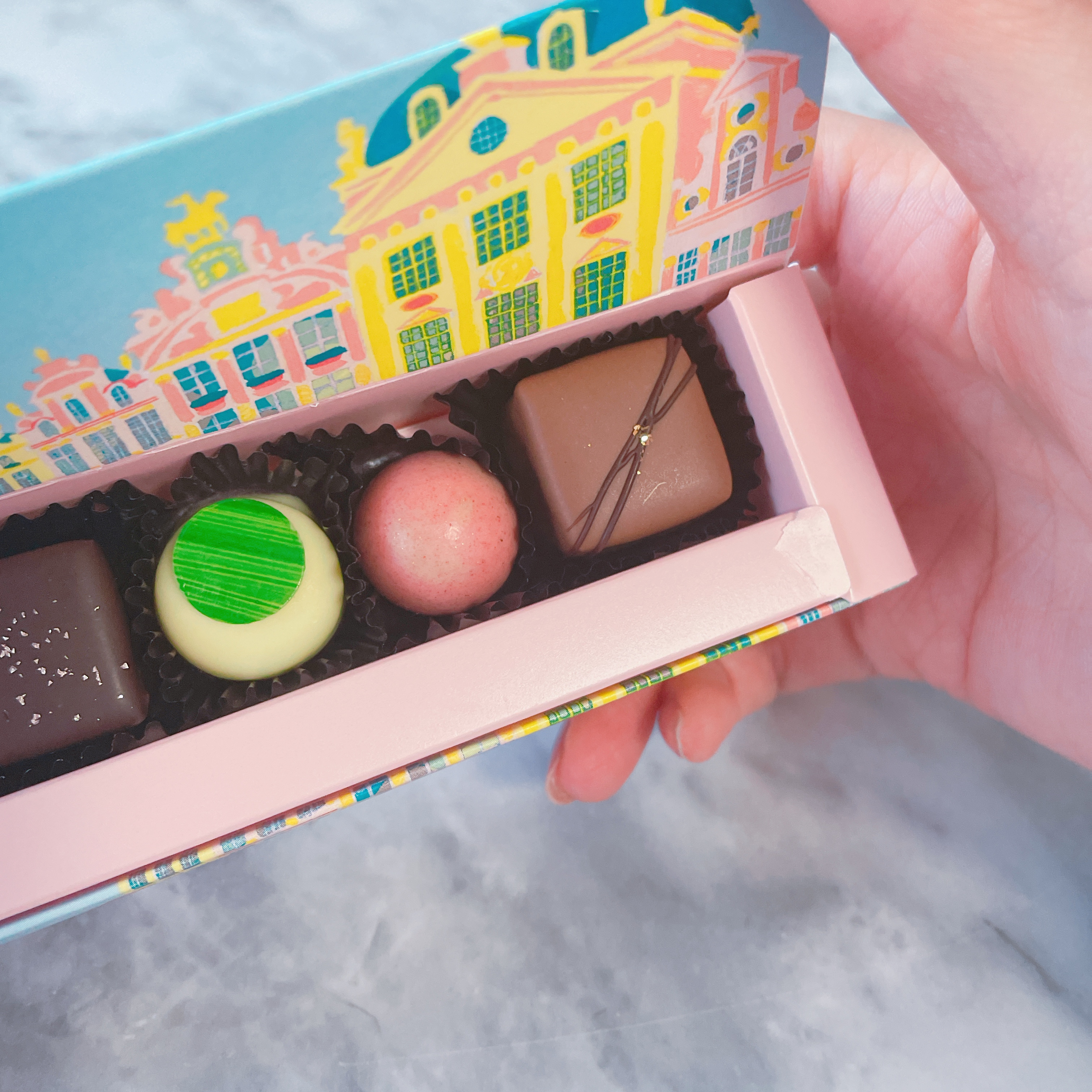 丁寧に梱包された箱を開けると、オシャレな街並みのパッケージにズラッと並んだ可愛らしいチョコレート達が顔を覗かせていました。