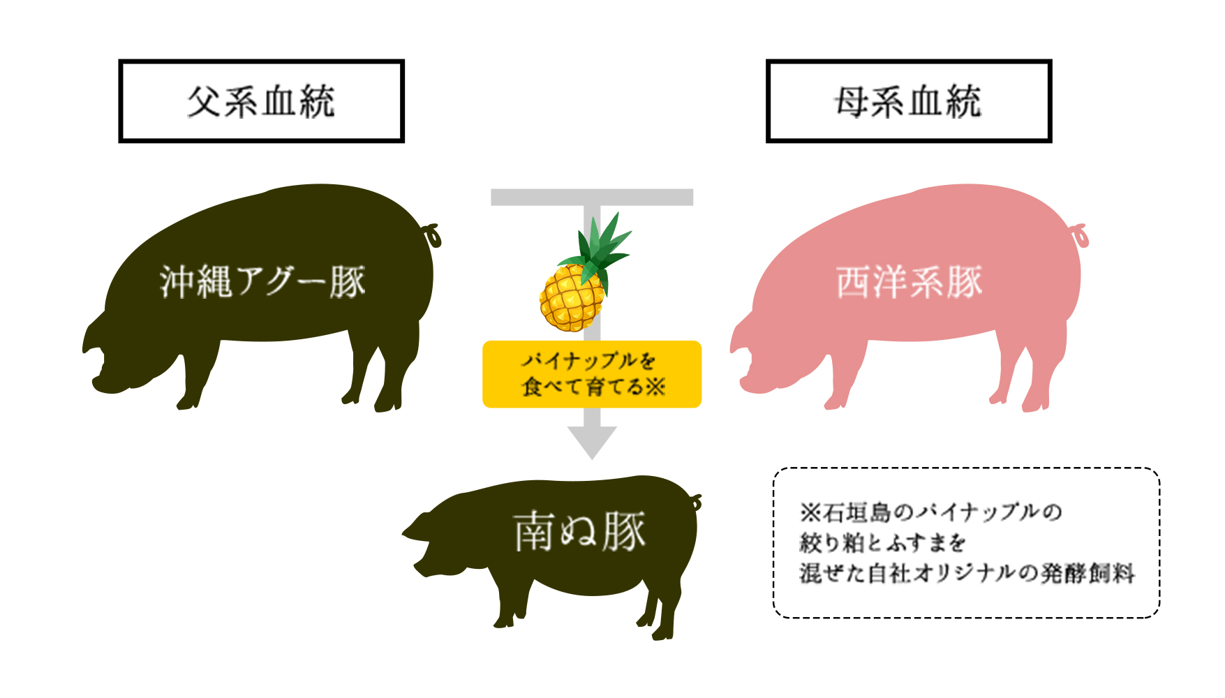 父親が純血アグー種、母豚に西洋豚をもつアグー豚(F1種)は幸福牧場で生まれ、石垣島パイナップルの絞り粕とふすまを混ぜた自社オリジナルの発酵資料を食べて大自然の石垣島ですくすく育ちます。