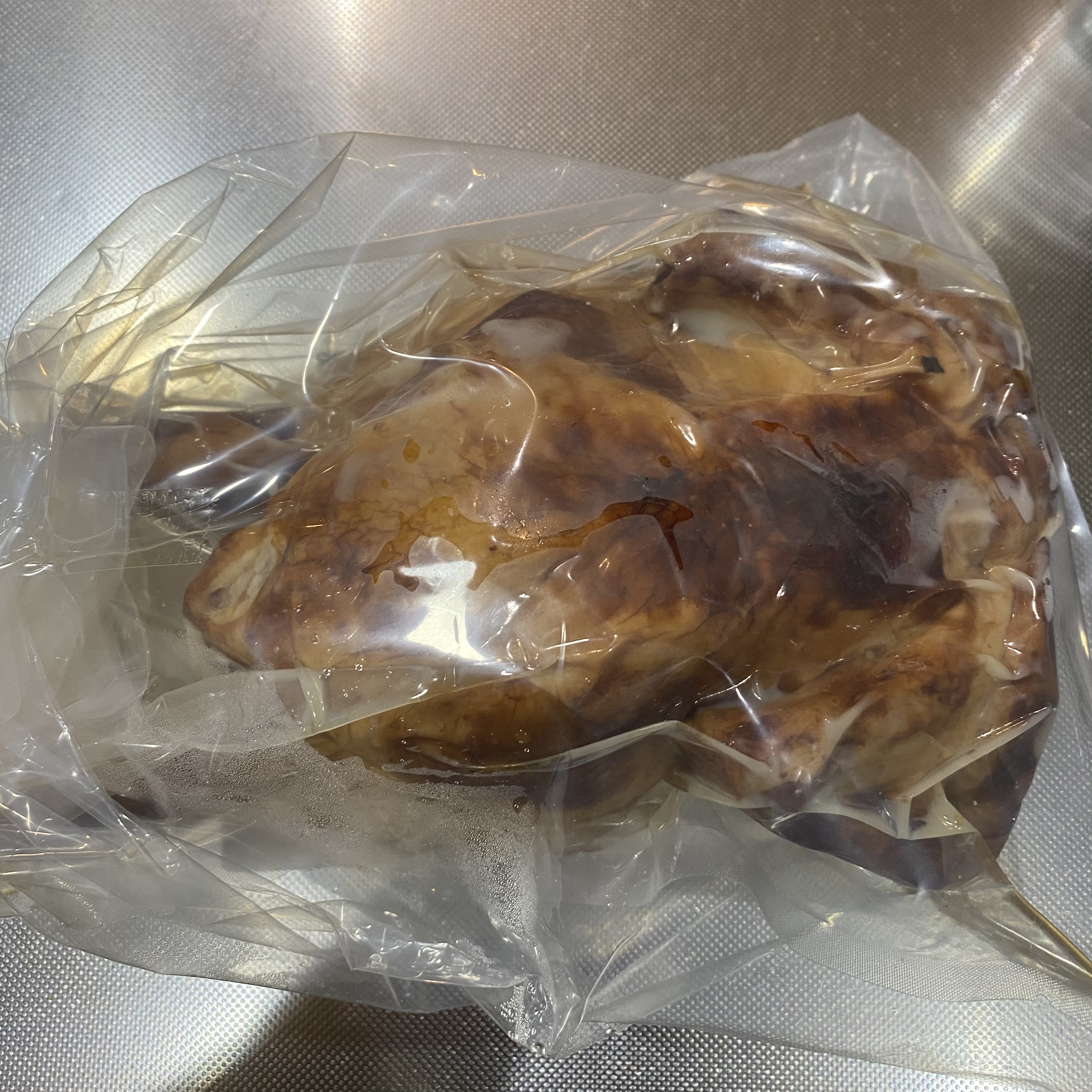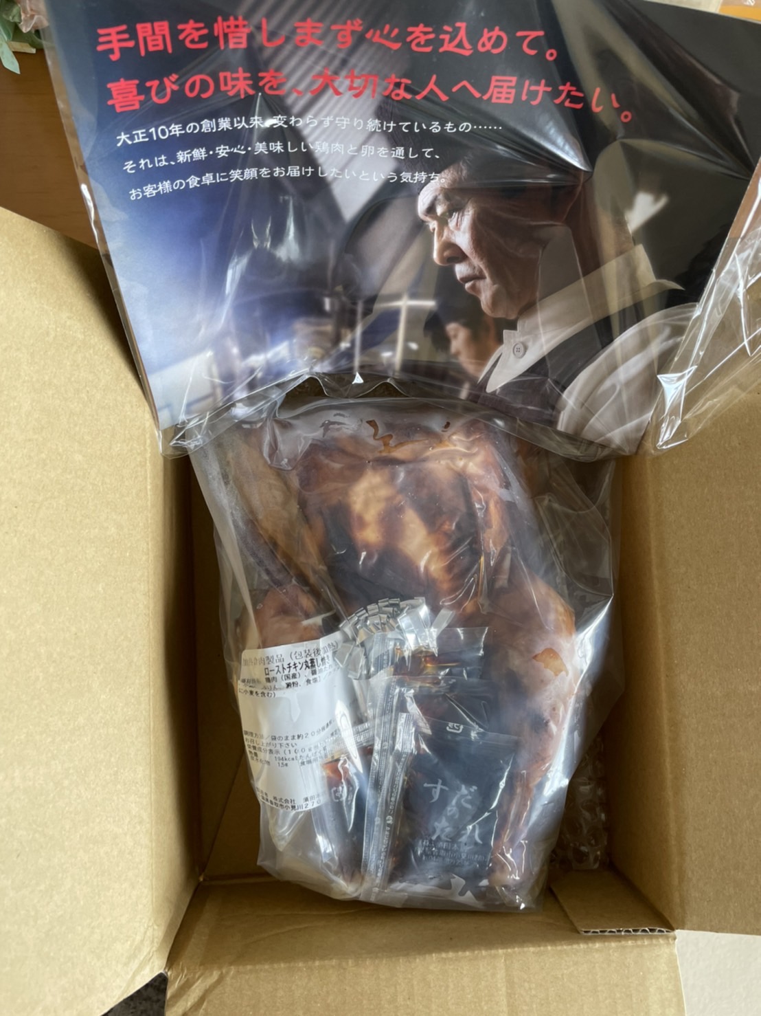 お店のロゴの入った小ぶりの段ボール箱だったので、中にもう一重化粧箱が入っているかと思いきや、蓋を開けたら一番上にビニール袋に入った商品説明書があり、その下に密封シールされた丸鶏さんがどどーんと鎮座してました(笑)