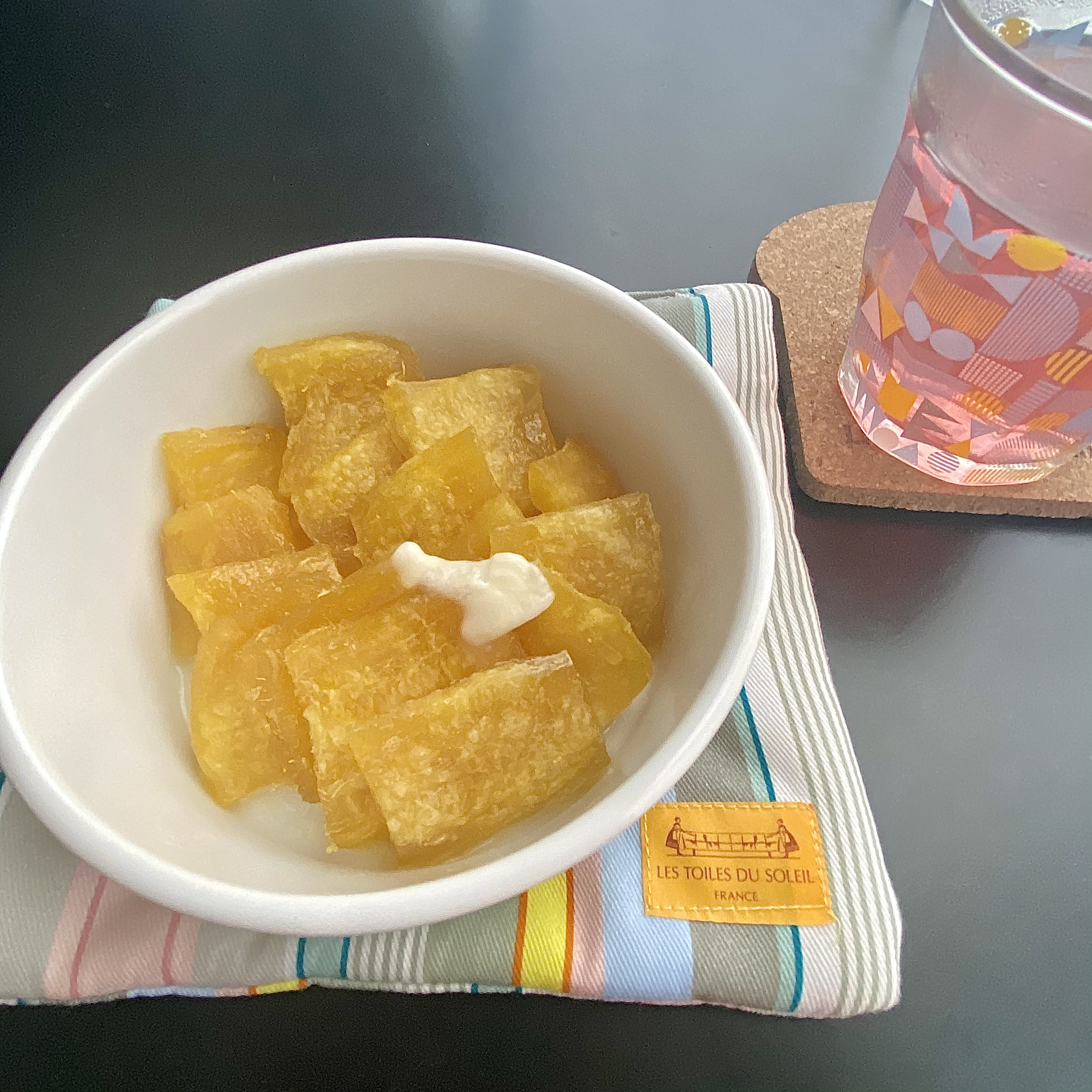 干し芋は、まずは本来の食感や味を楽しんでいただくことをおススメします。その際に、包丁やキッチンバサミで一口サイズにカットして、お皿に盛りつけると食べやすくて、雰囲気も変わり、素敵な干し芋タイムになります。