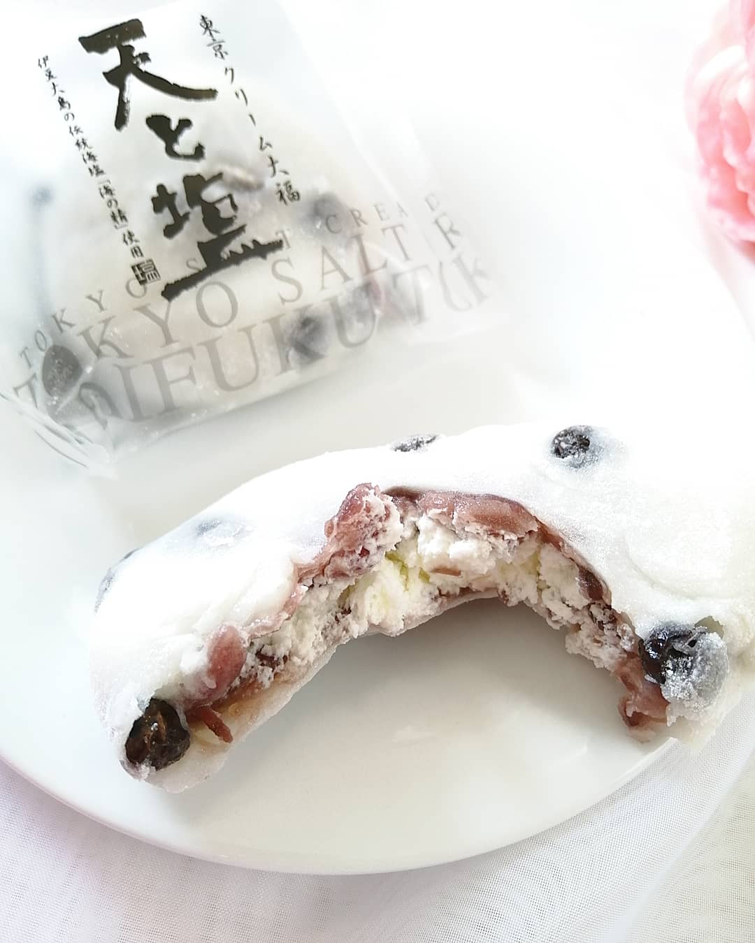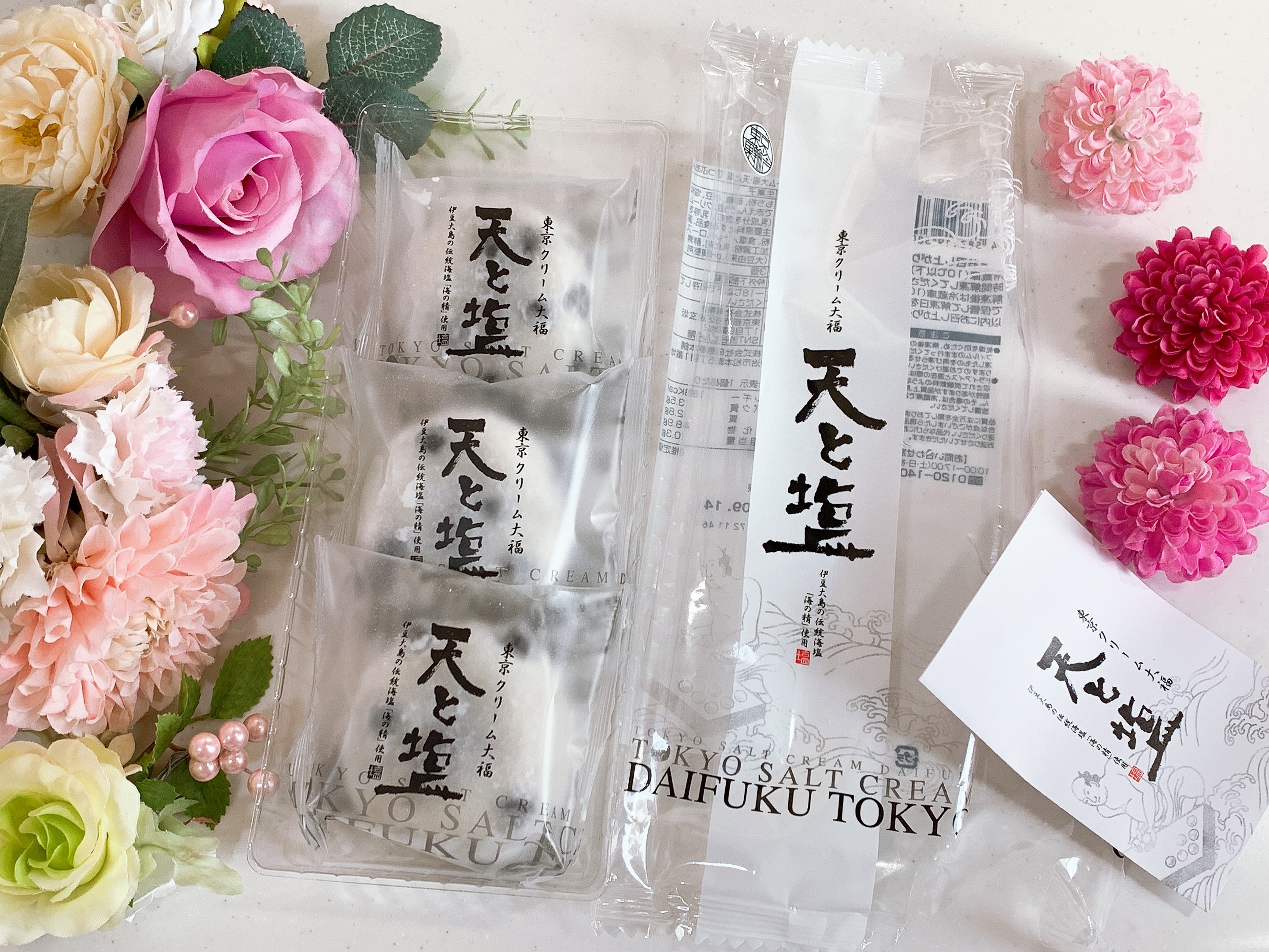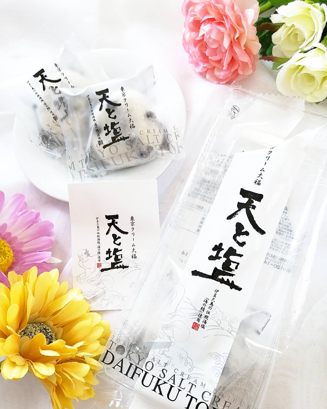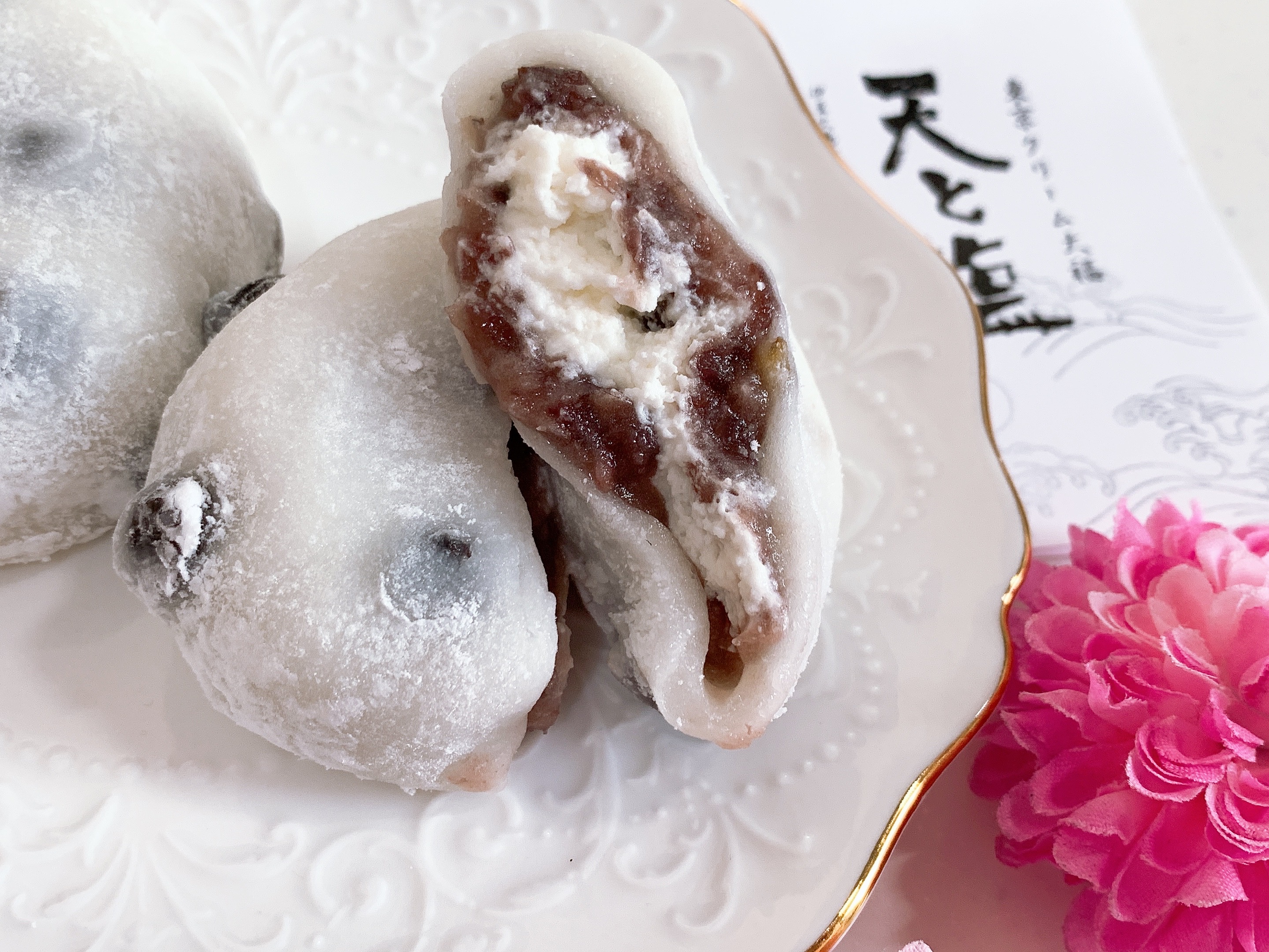 伊豆大島の伝統海塩「海の精」を練りこんだ塩つぶあんとクリームを、やわらかな餅生地で包んだ「クリーム大福」です。小豆は北海道十勝産、もち米は九州のヒヨクモチを使用。塩ゆでした北海道産の赤えんどう豆をお餅に混ぜ込み、食感にアクセントを加えています。甘みを引き立てる塩味に、柔らかクリーム味が融合した、新感覚の大福。和のテイストに洋を感じるコラボスイーツです。和と洋のどちらも楽しめるスイーツは、緑茶だけでなく、紅茶や珈琲にも合います。