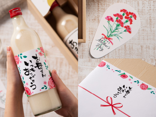 母の日特製熨斗とラベルで特別な装いになった「あまざけギフト」は、カーネーションをあしらったメッセージカード付き。