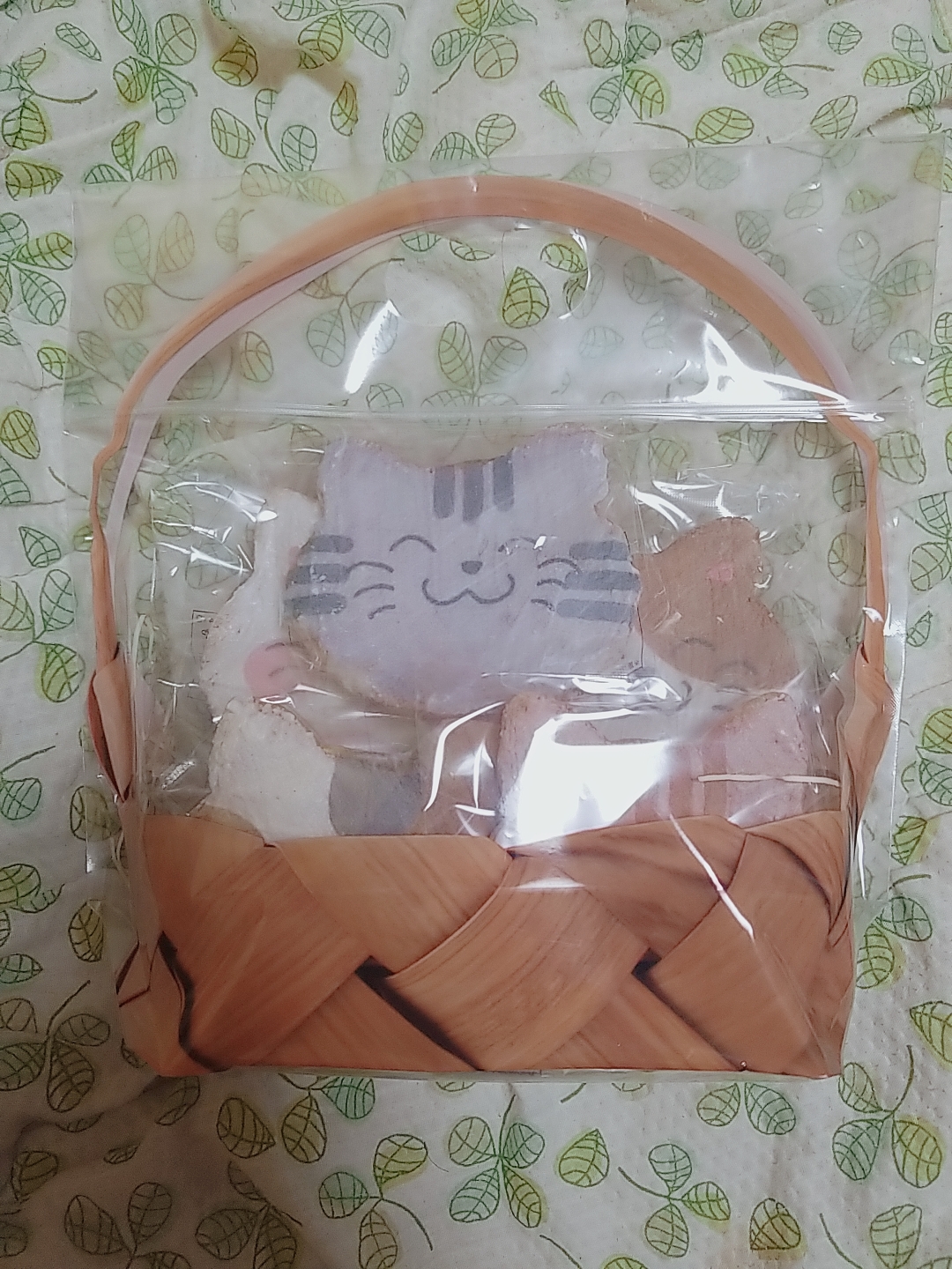 お煎餅が入っている袋には籠のイラストがプリントされているので微笑ましい猫ちゃん達が籠の中からひょっこり顔を覗かせているように感じます。