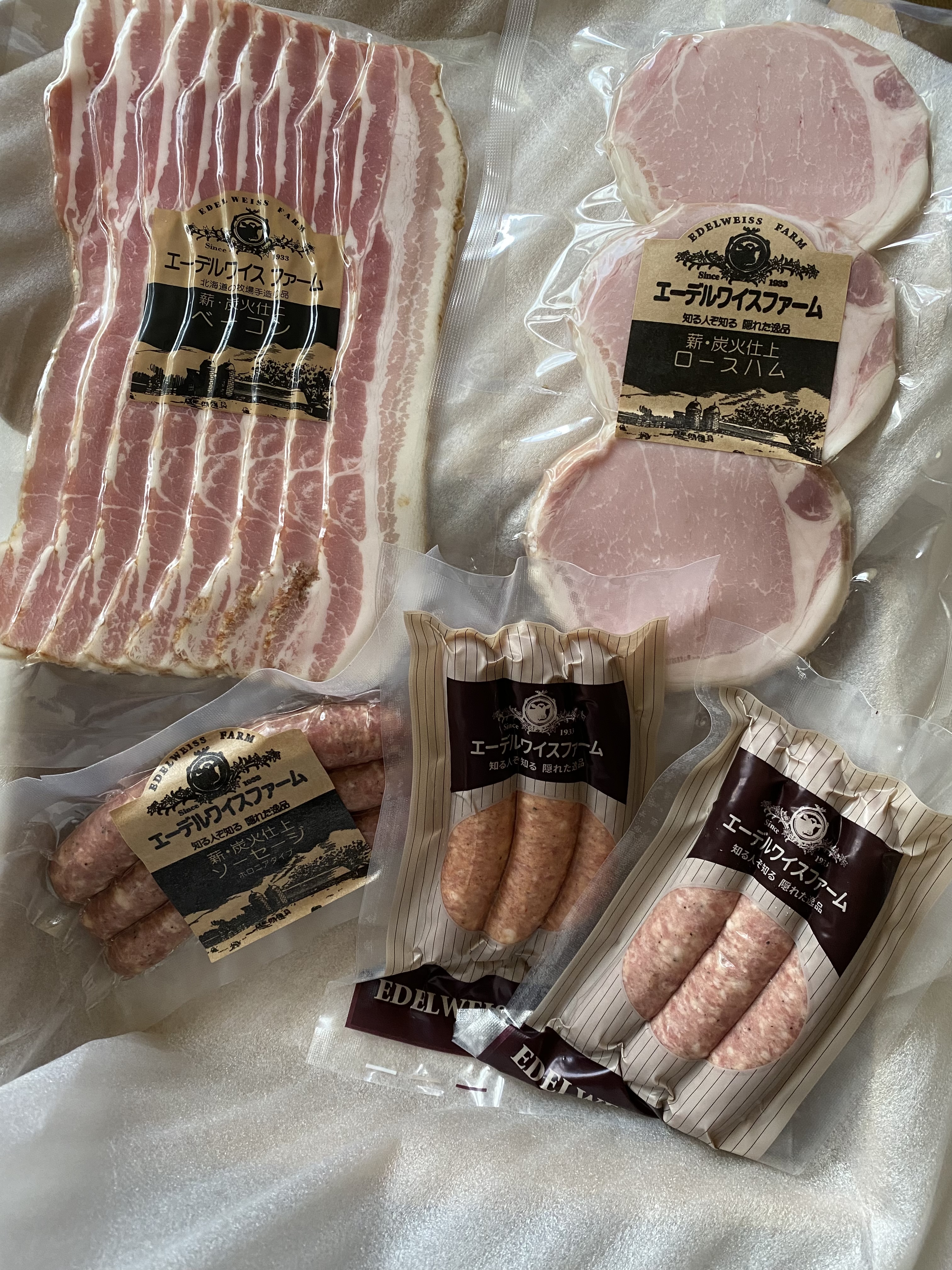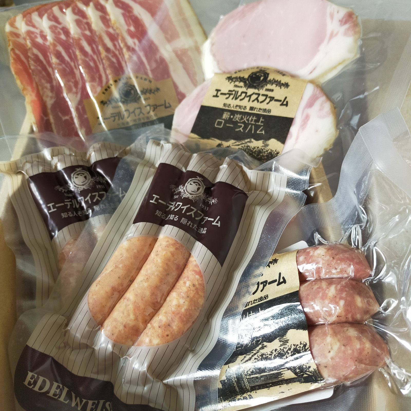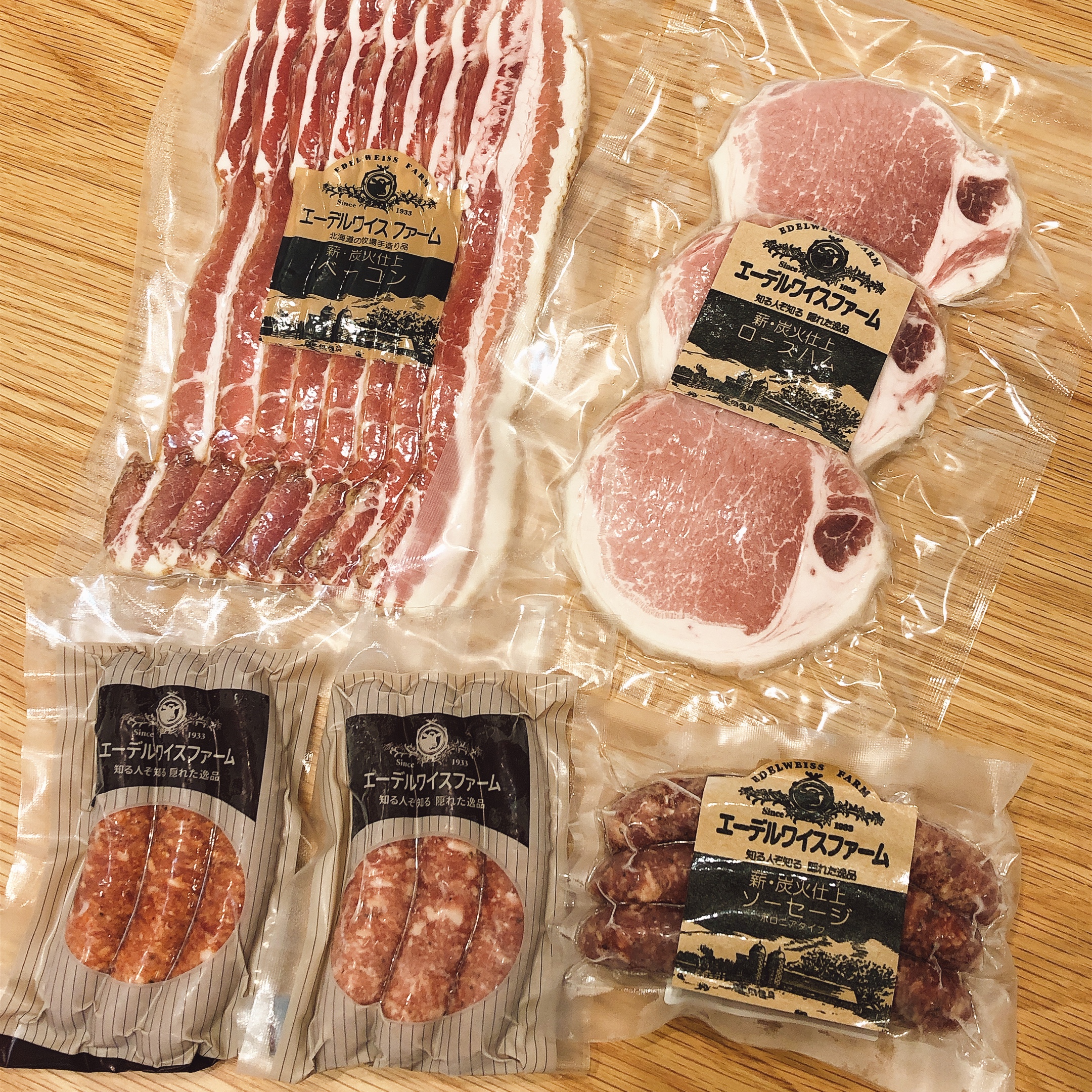 北海道の牧場で約90年間、自宅用に作り続けていた「ベーコン、ハム、ソーセージ」のセットです。家族の為の製品だったため、安全性を重視し、着色料、保存料、防腐剤などの添加物不使用で(必要最小限の亜硝酸塩を除く)、自然な風味や色合いが楽しめます。氷温4週間熟成することにより脂がとけだす「厚切りロースハム」、薪・炭火で仕上げた贅沢な燻煙の香りが広がる「ベーコンスライス」。ポークとビーフの粗挽きタイプの「ボロニアタイプソーセージ」、肉汁たっぷりのポークソーセージ「ビアブルスト」、程よい辛さが後引く味わいの「チリソーセージ」のソーセージ3種がセットになった豪華版。ボリューム満点のセットなので食べ比べが楽しめます。