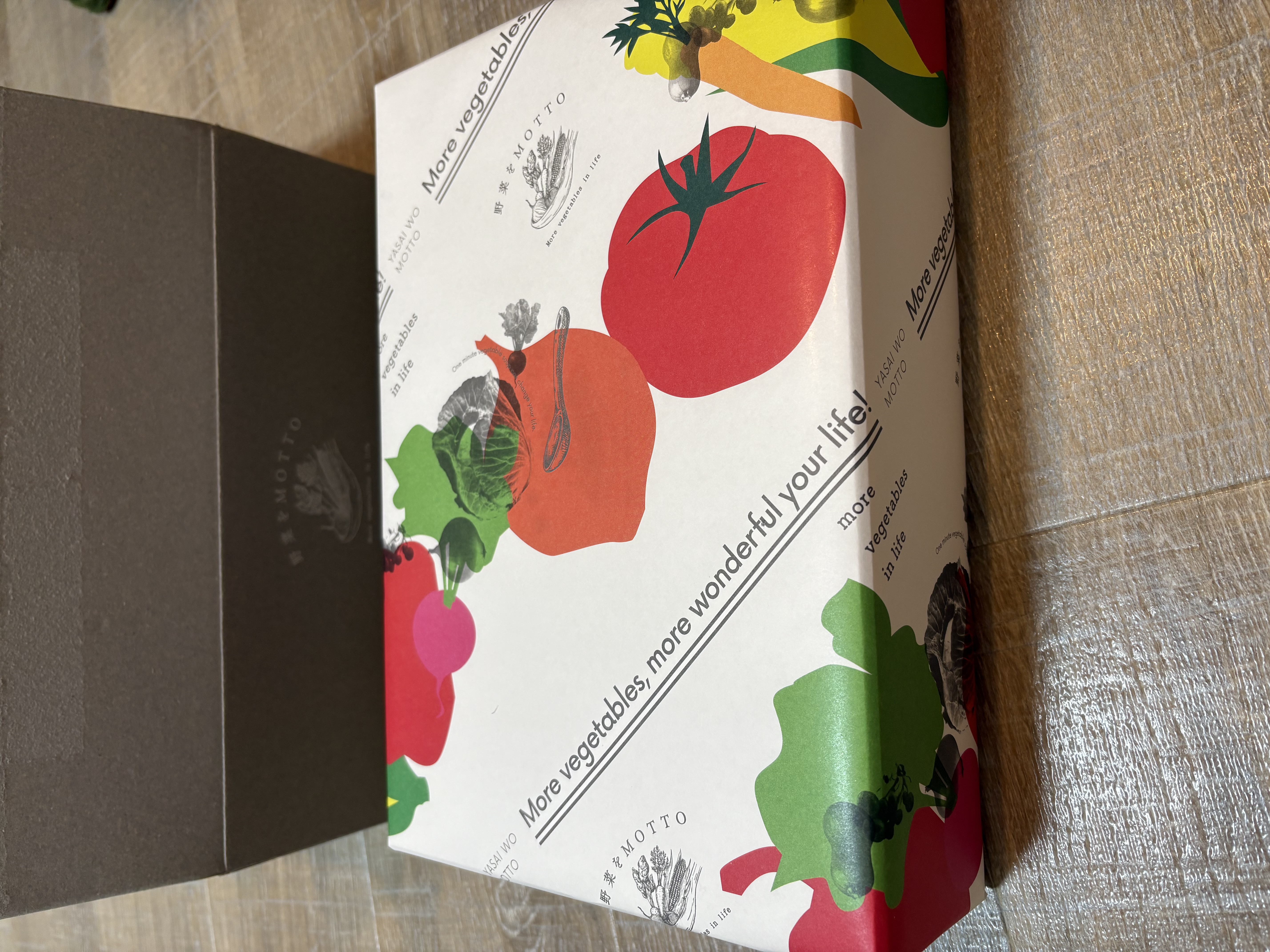 シンプルでおしゃれな箱、鮮やかで美味しそうなお野菜の可愛らしい包装紙に包まれたお品が届きました!