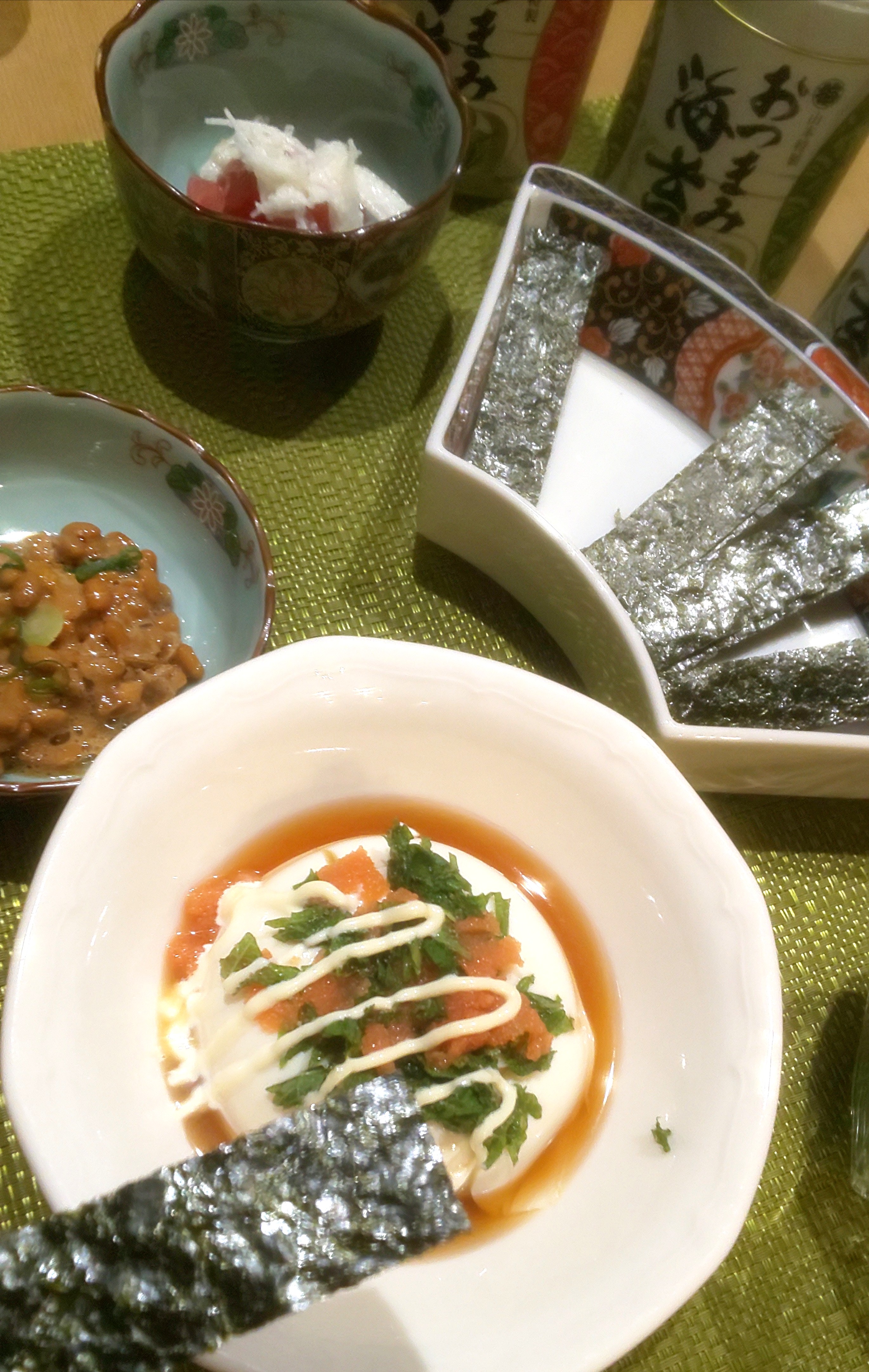 ひと通り、そのままパリパリといただいてからは、ちょうど帰宅しお腹がすいたこどもたちのリクエストで炊きたてご飯のおにぎりと共に♪また、休日モードで白ワインを開けたので、クリームチーズをはさんで即席ステキなおつまみに♪パリパリ食感を味わいたいので巻きたてを味わいます。おつまみ海苔のしっかり味とまろやかなクリームチーズの相性が最高でした。