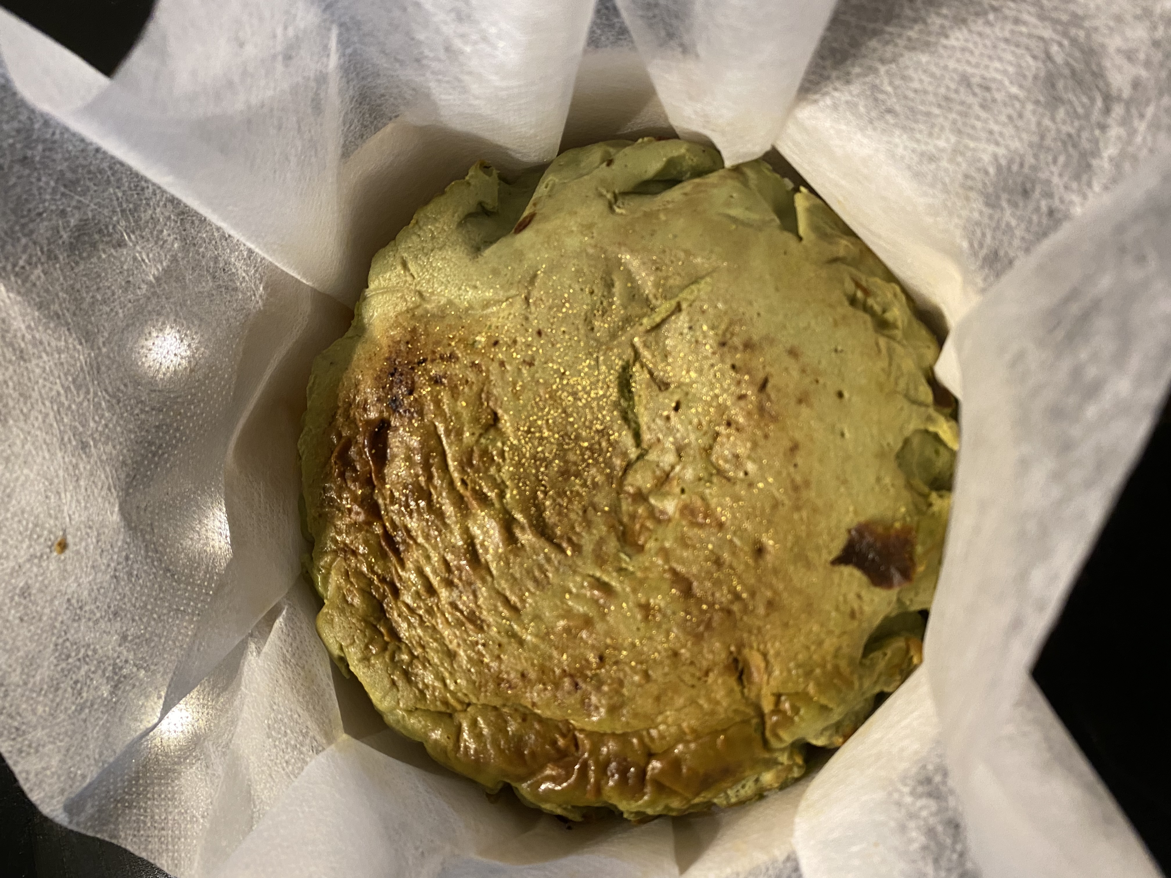 無添加のナチュラルチーズを使用した、抹茶のバスクチーズケーキです。グルテンフリーでありながら濃厚な味わいで、チーズと抹茶の奥深さを感じる新感覚スイーツ。バスクチーズケーキ特有の香ばしさも味わいの一つです。12cmの程よいサイズのホールケーキで、金沢の金箔のトッピングが印象的な「美しいバスクチーズケーキ」です。