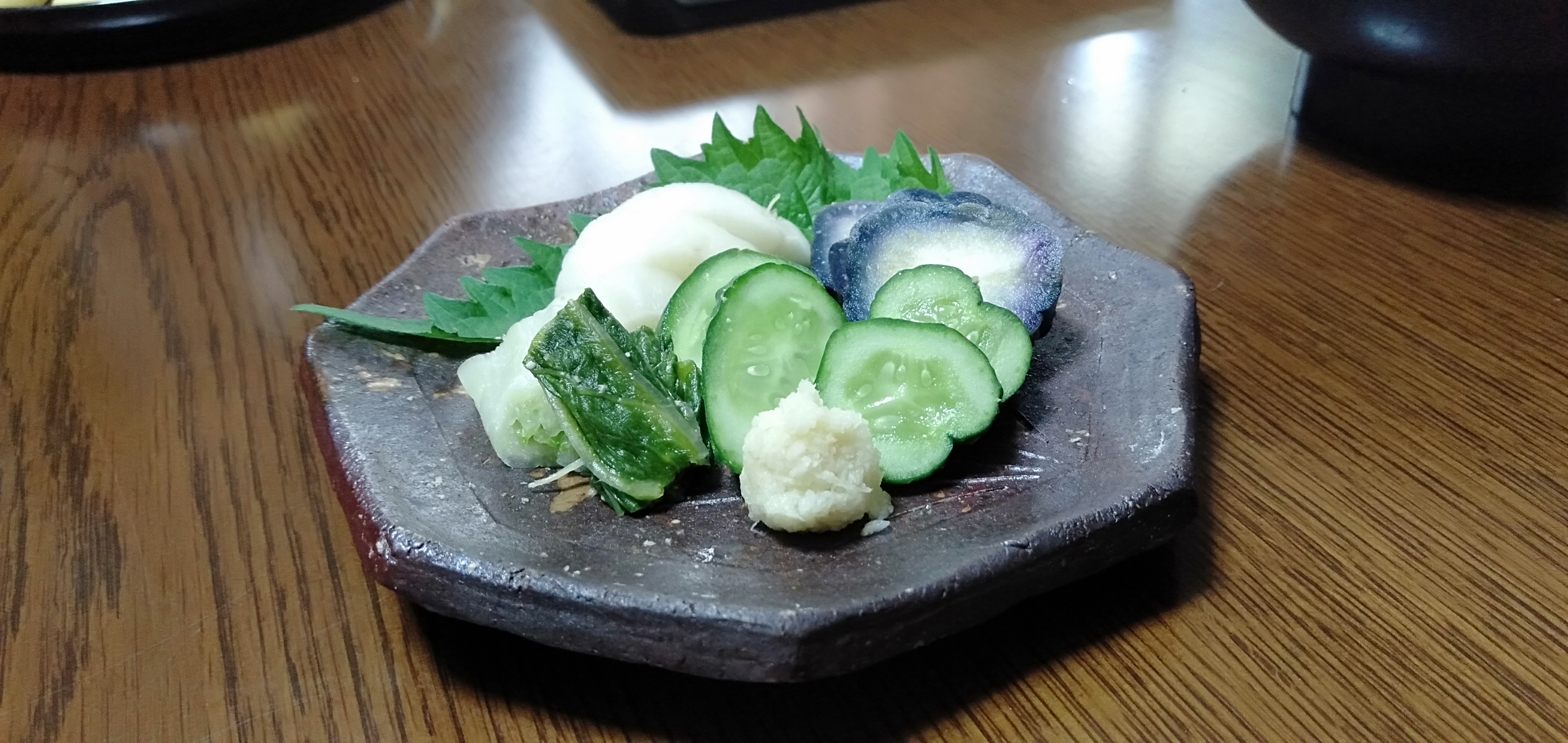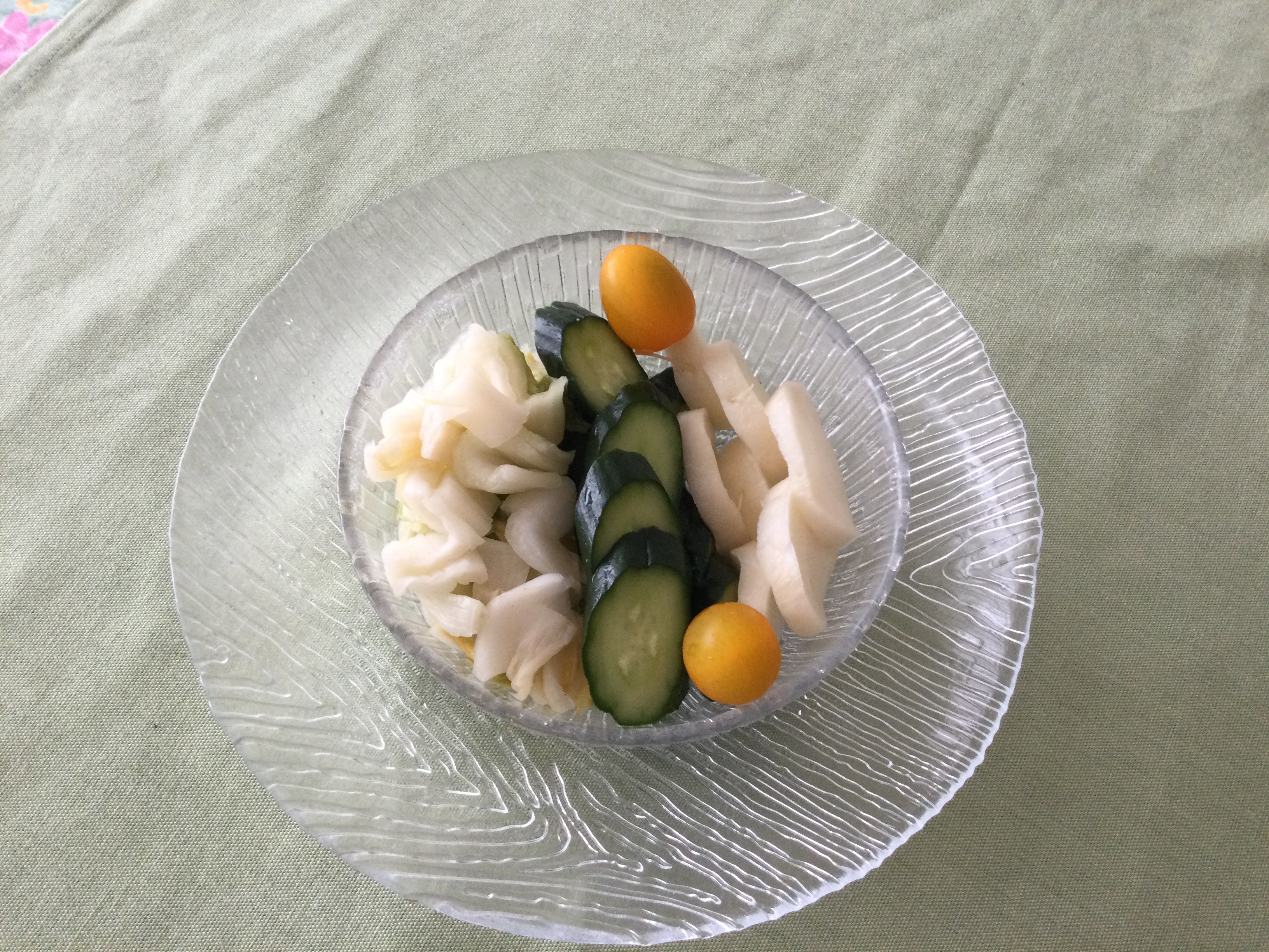 茄子のヌカ漬は色がとてもきれいでみずみずしく、こちらも胡瓜同様しっかりと漬かっていました。