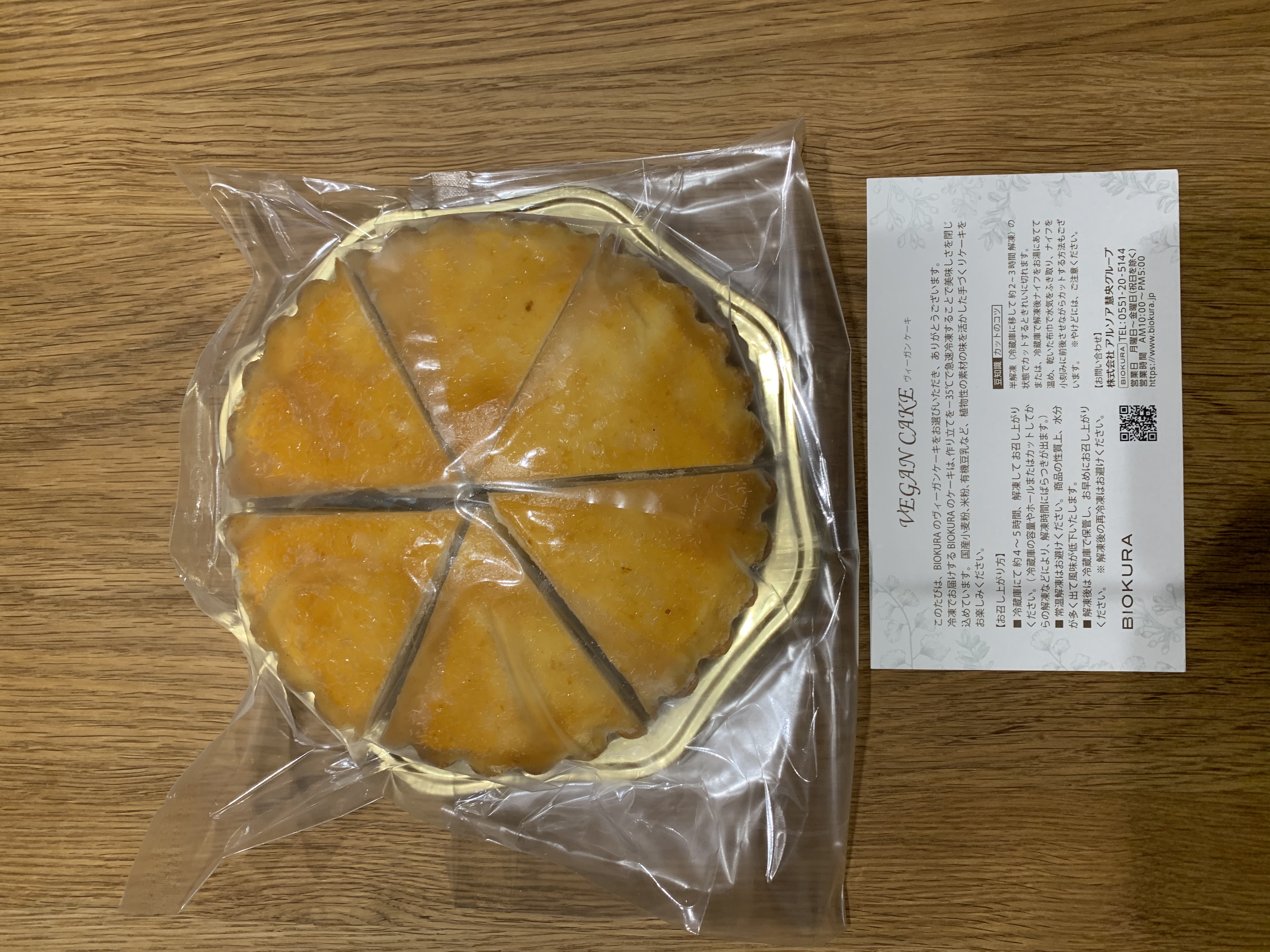 濃厚なのにさわやかで軽やか、植物性100%の「レアチーズケーキ」です。ミルキー感や発酵感をだすために、カシューナッツや豆乳ヨーグルト、オリジナルの豆乳クリームをベースに、白ワインビネガー等を加えています。レモン皮のすりおろしが丸ごと1個分入りで、香りも爽やか。トップにりんごジュースで甘さをつけたアプリコットジャムを塗って艶やかに仕上げています。国産小麦で作った香ばしいタルトのサクサク感がアクセント。有機アーモンドパウダーを使用したアーモンド生地がコクをプラスしています。カット済みで届くので、案外難しいカットが不要なので便利です。