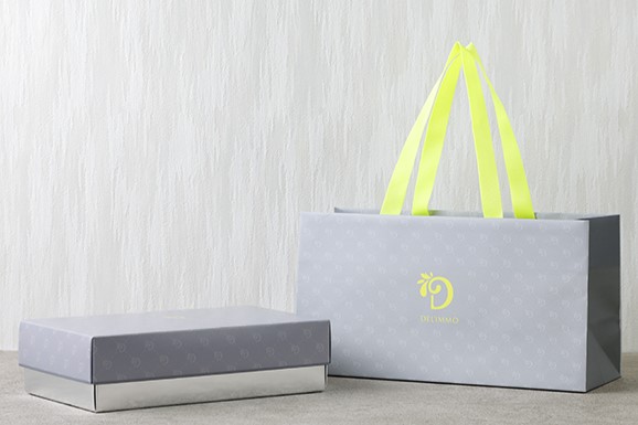 デリーモカラーのグレーとグリーンを基調としたシックでシンプルなお包みにてお届けします。