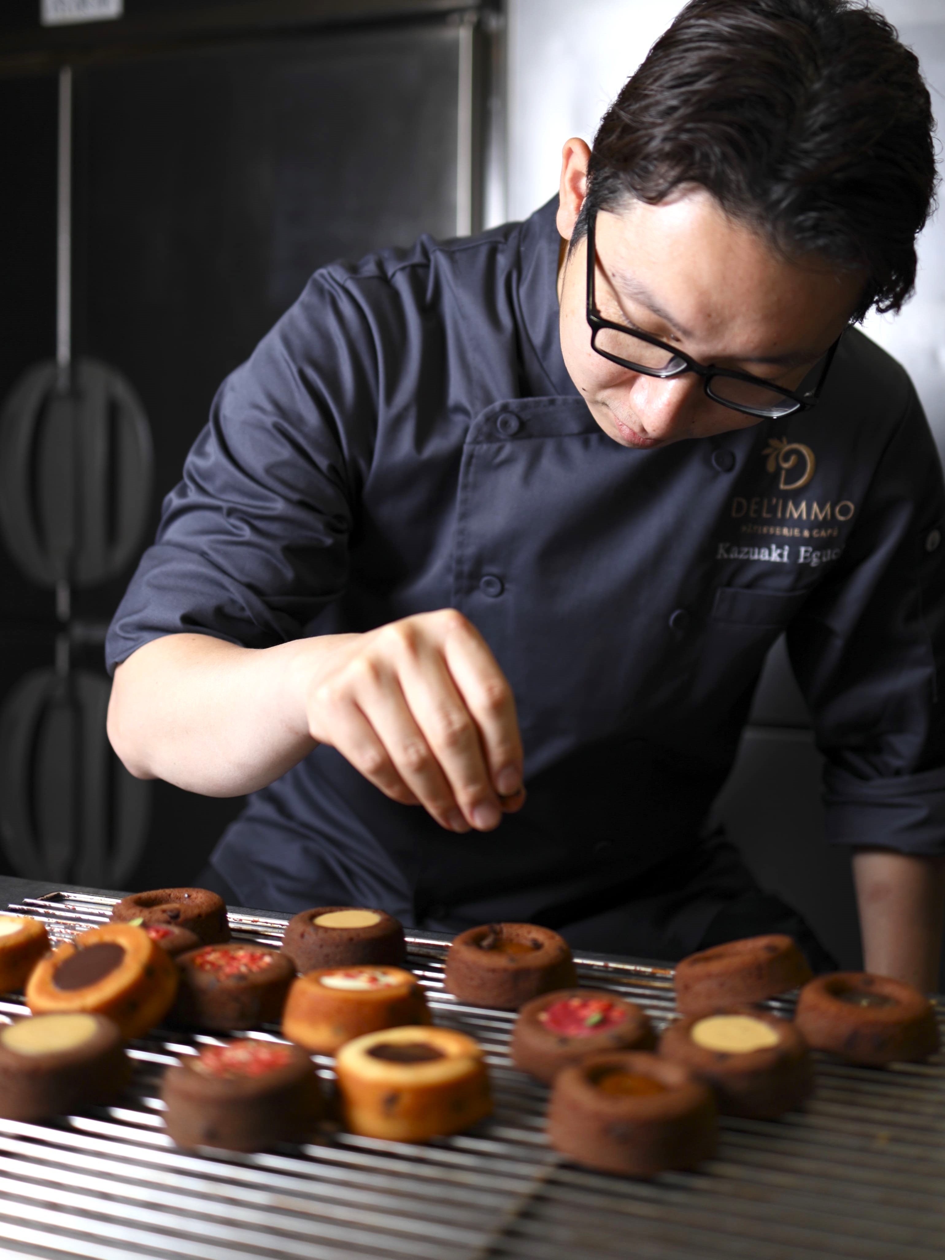 口どけよく焼き上げるために金属製の型と熱風の出るオーブンで焼き上げます。表面は香ばしく中はしっとり焼き上げる事で、中に詰めるガナッシュやクリーム、ジュレのコントラストが特徴的な味わいを生みます。