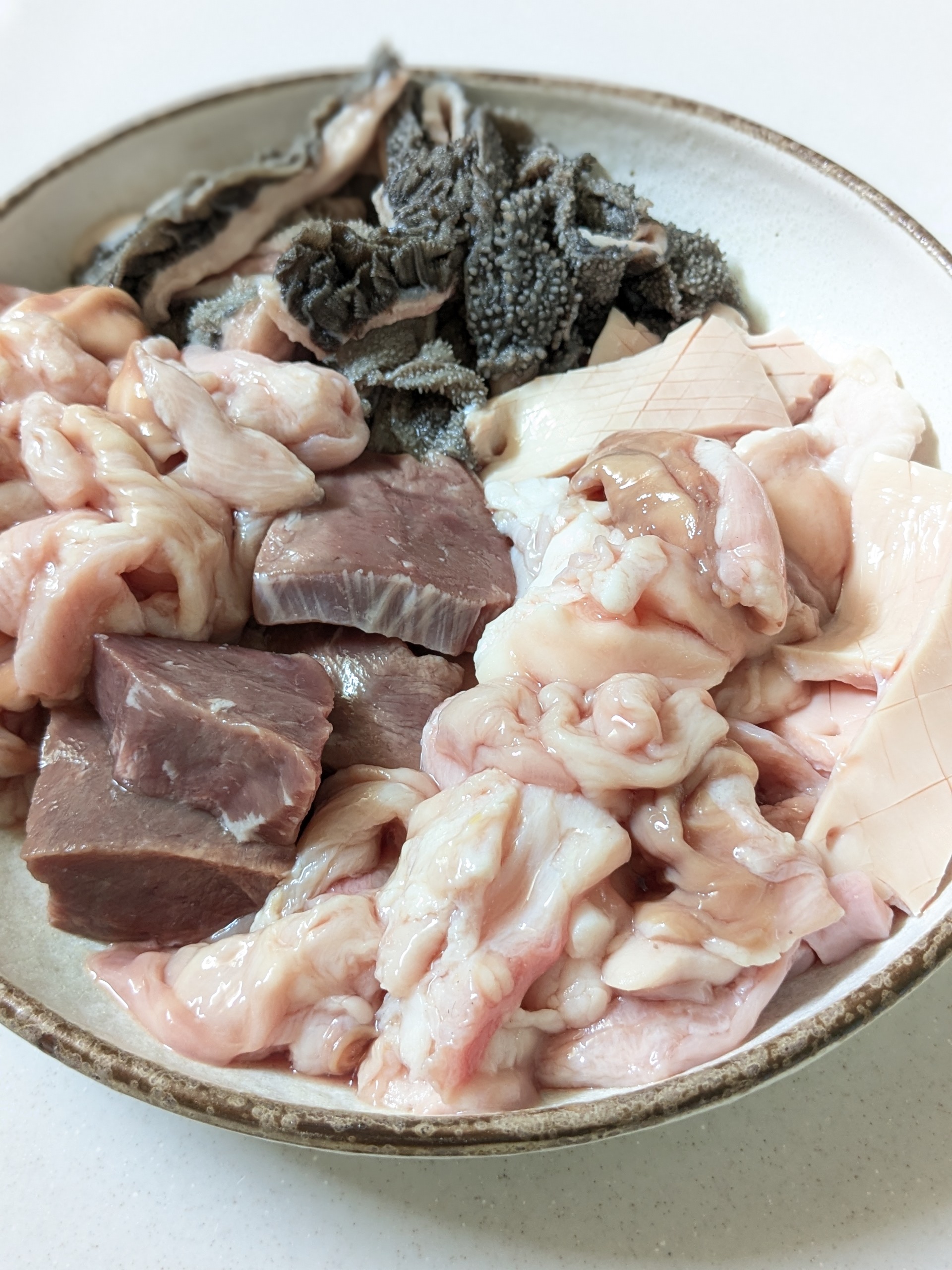 アカセンマイ、センマイ、大腸、小腸、ハチノス、ミノ、ハート、ハツモトなどから約6〜8種をミックスしています。(内容は日によって変わります。)