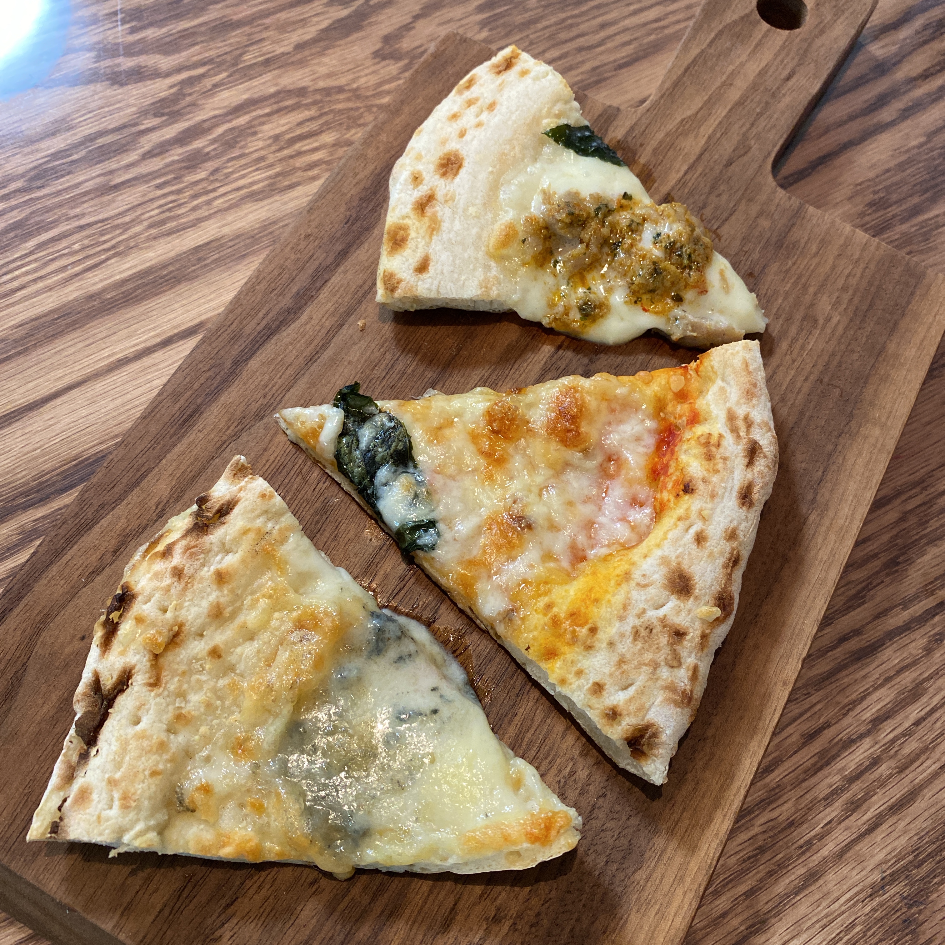 クワトロフォルマッジが気に入っていました。色んなチーズがバランスよく美味しかったです。有機アカシアはちみつをかけていただきました。はちみつの薫りもよくはちみつの甘さがチーズと合わさって美味しかったです。デザートにも、ワインのお供にも、主食としてもいける万能な味に感じました。