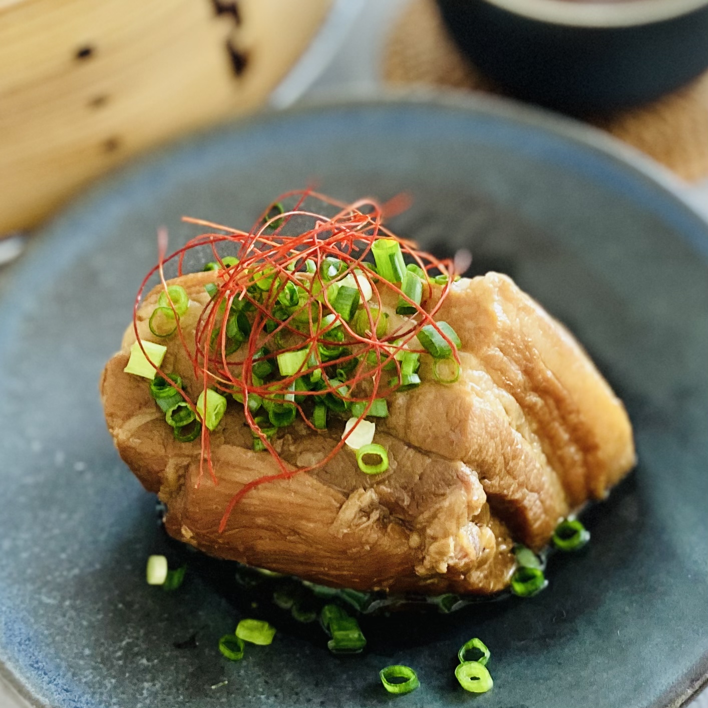 夕食には角煮の濃厚さを味わいたかったので、シンプルにもやしの蒸し焼きといただき物のターサイを軽く炒めた上に解凍後湯せんした角煮をのせました。