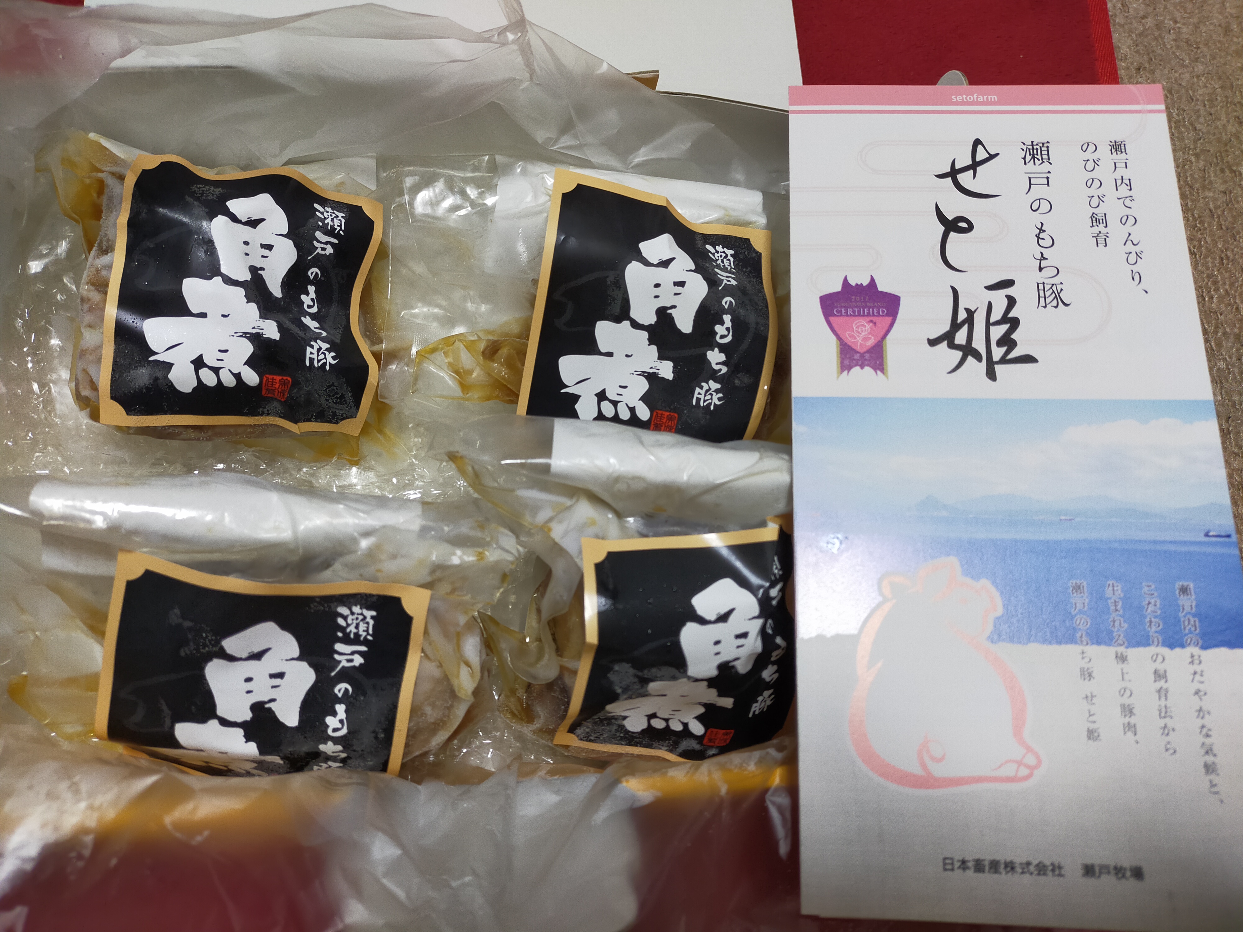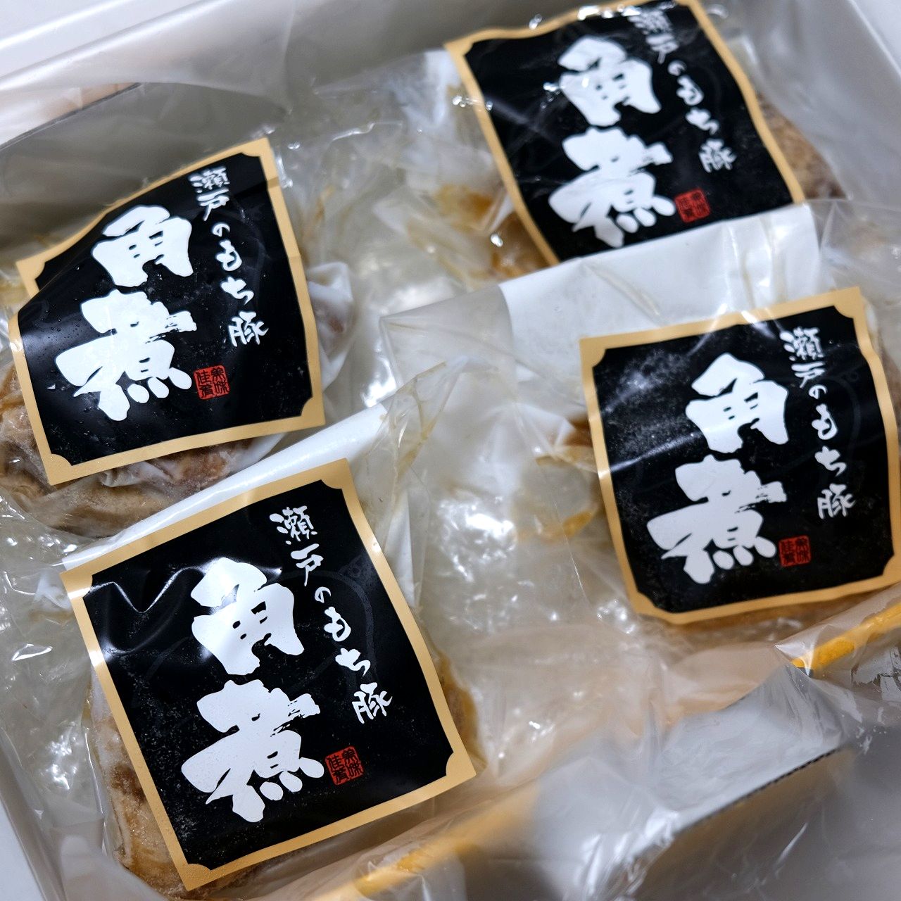 ブランド豚「瀬戸のもち豚の角煮」です。甘くとろける脂身と、旨味の凝縮された赤身が特徴的な「瀬戸のもち豚」の豚バラ肉を自家製ダレでじっくり時間をかけて煮込み、とろっとやわらかな角煮に仕上がっています。甘口の醤油ベースのたれを一緒に真空し、一緒に温めることで、食べる直前まで味が染み込むようしっかり漬け込んでいます。瀬戸内の穏やかな気候と養豚専門の自社牧場で育てた「瀬戸のもち豚」を原料に、自社工場で製造した安心安全な角煮セットです。