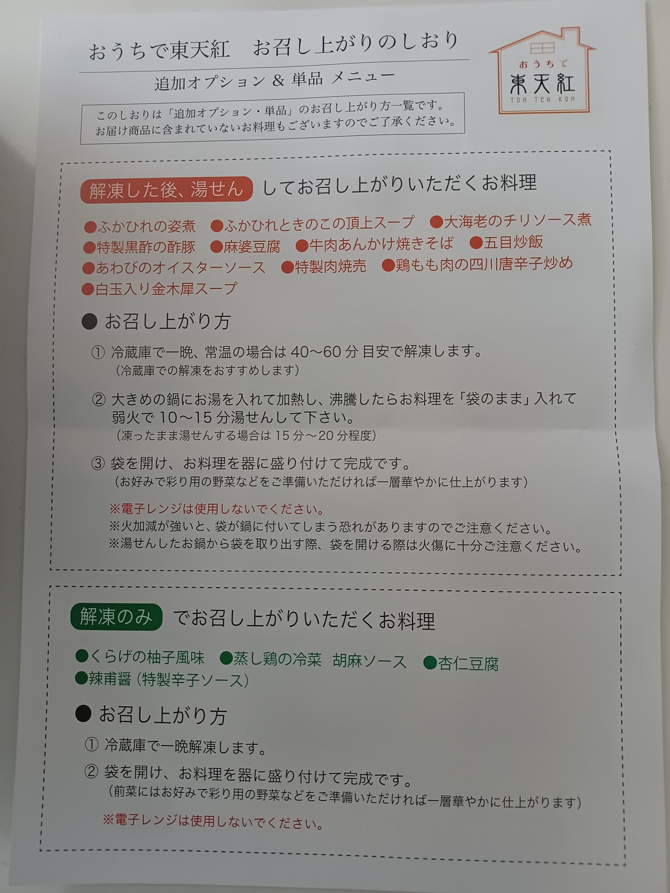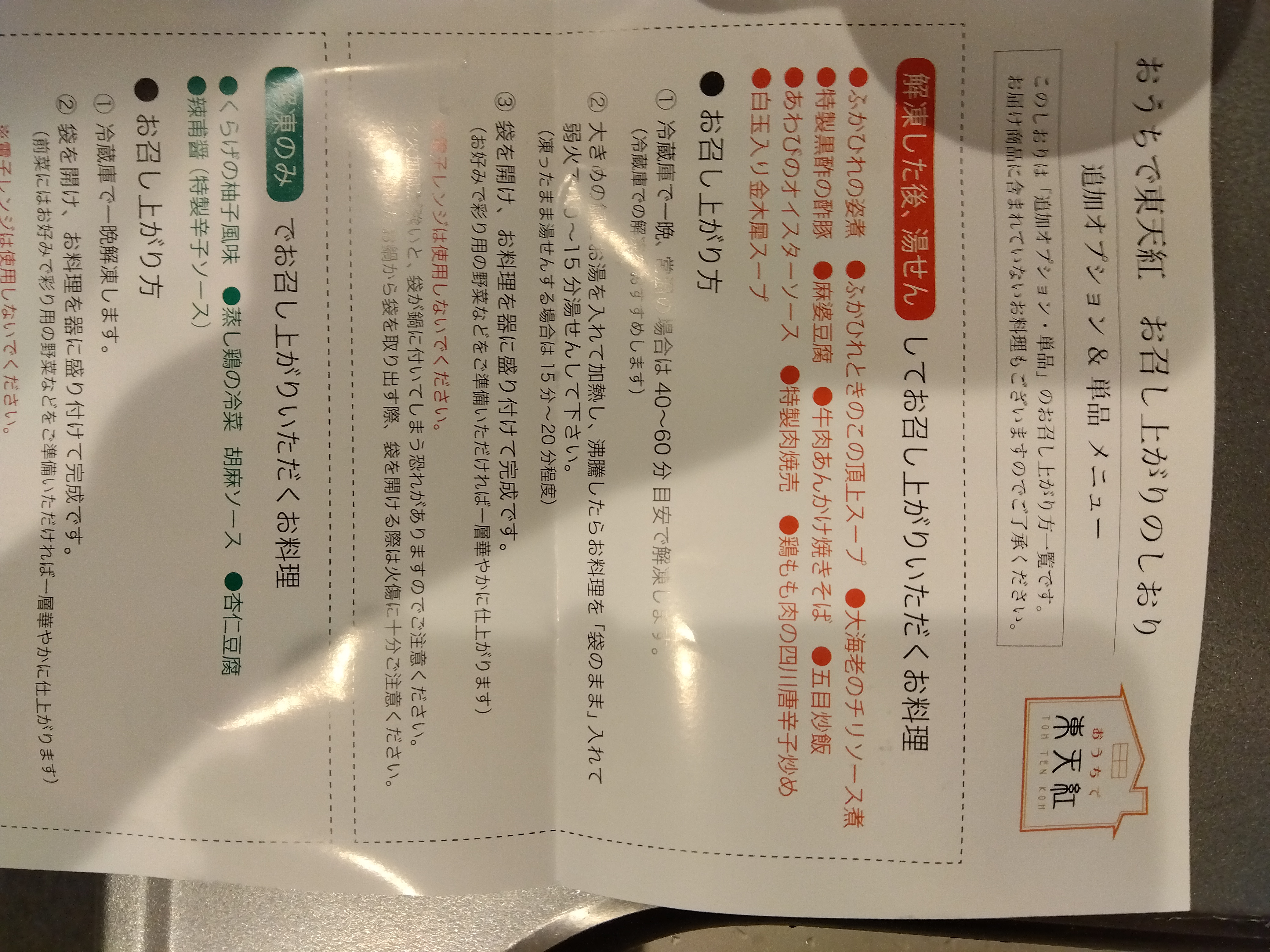 おうちで東天紅お召し上がりのしおりの紙も入っています。