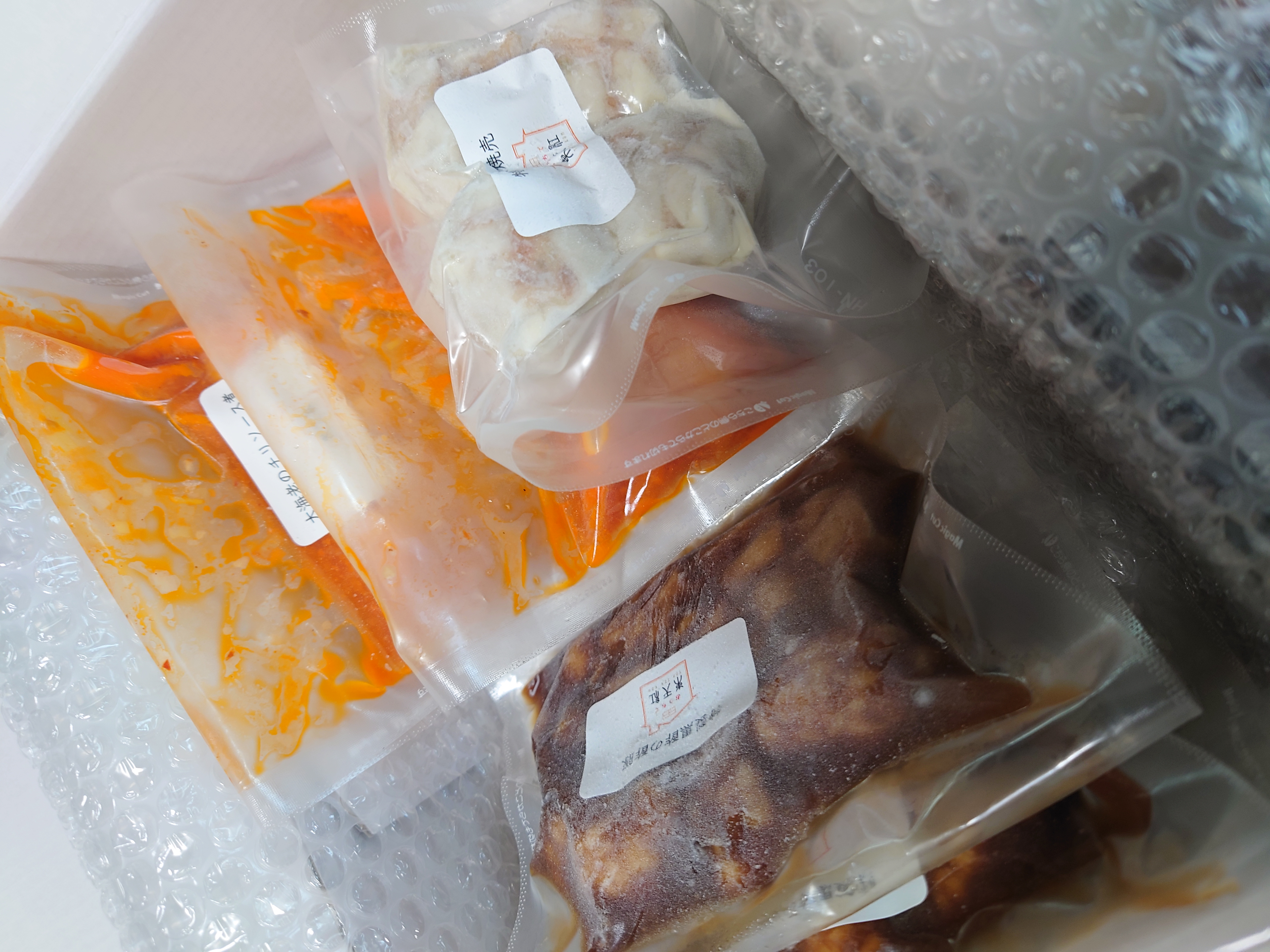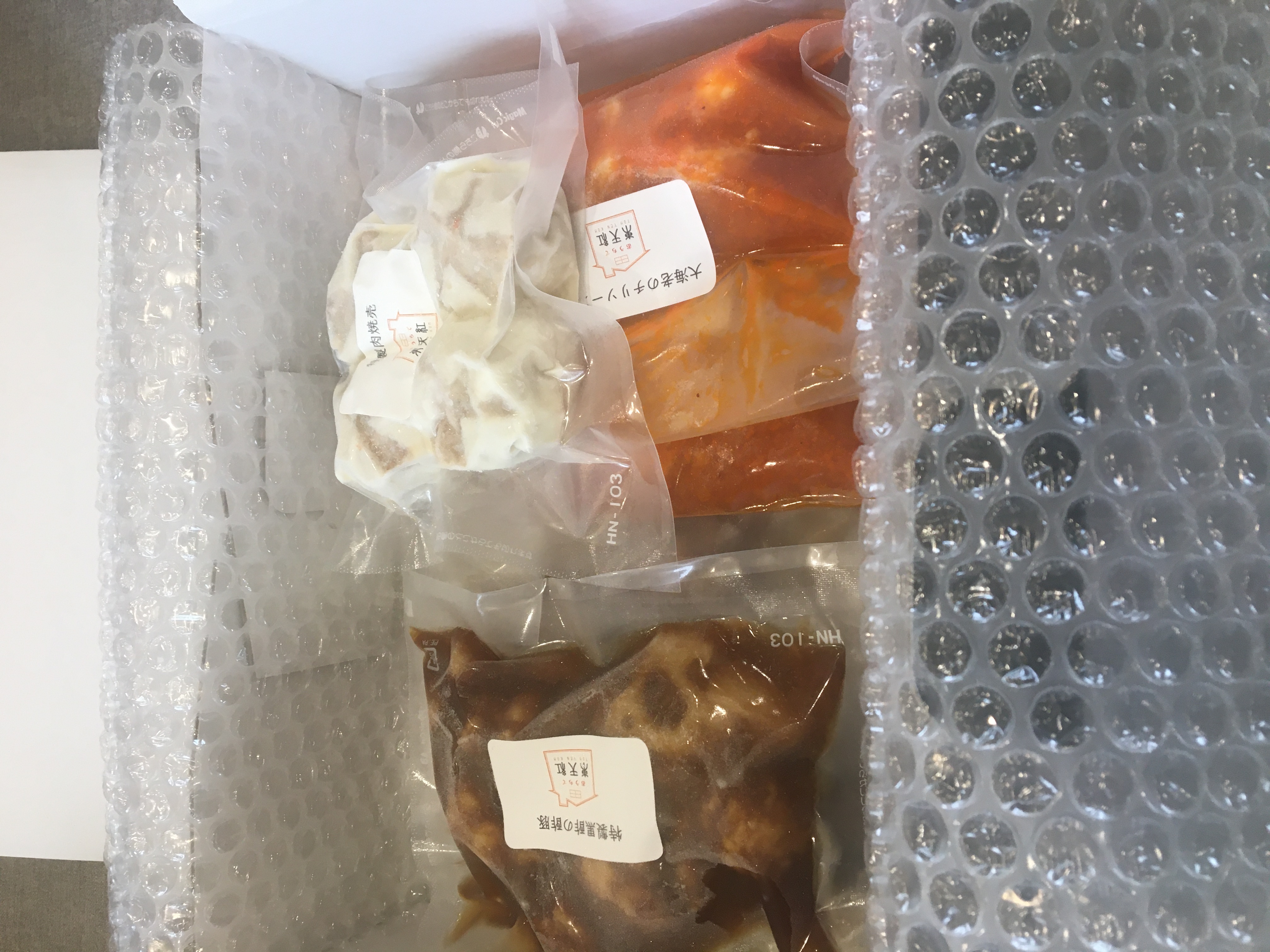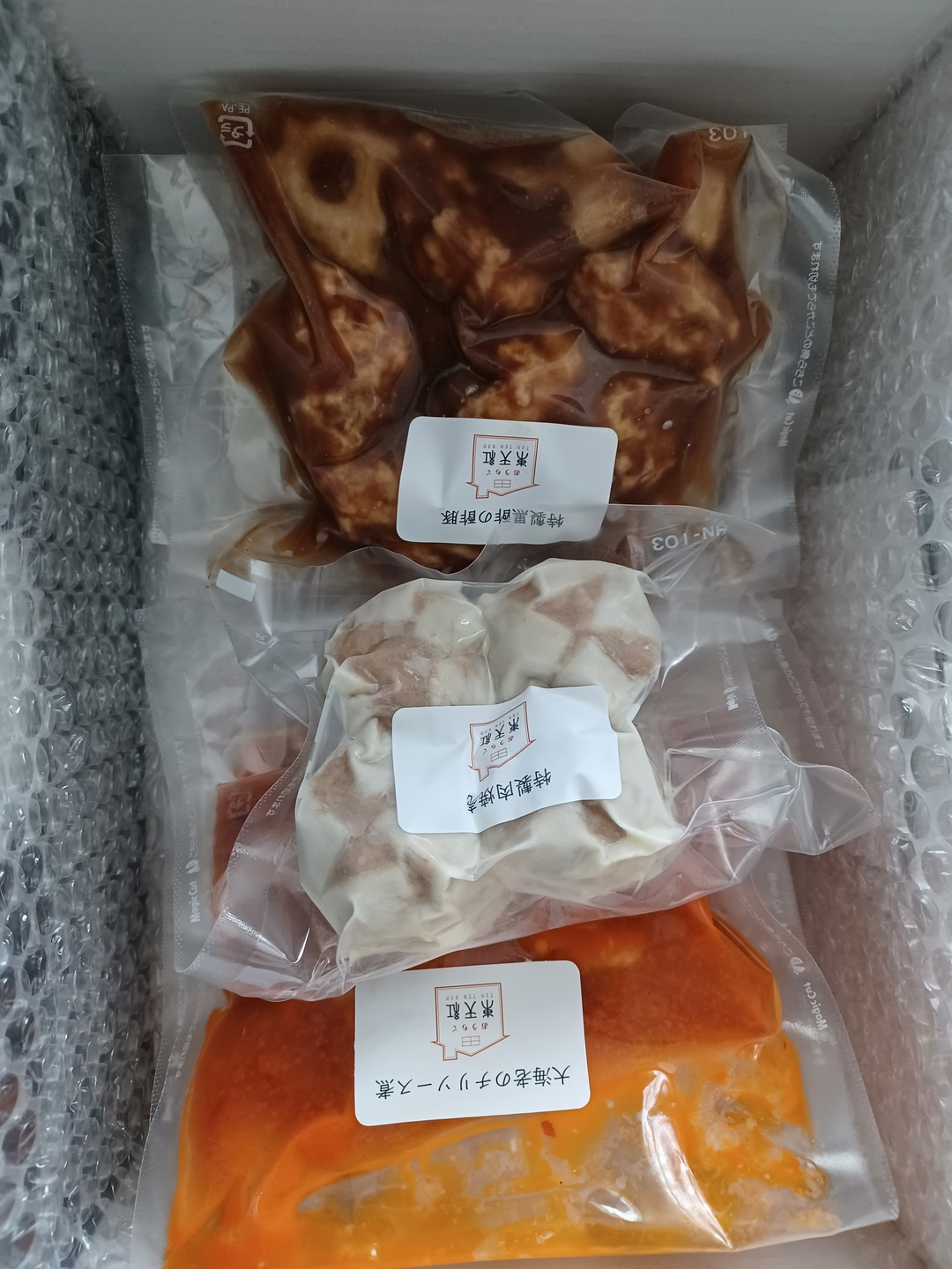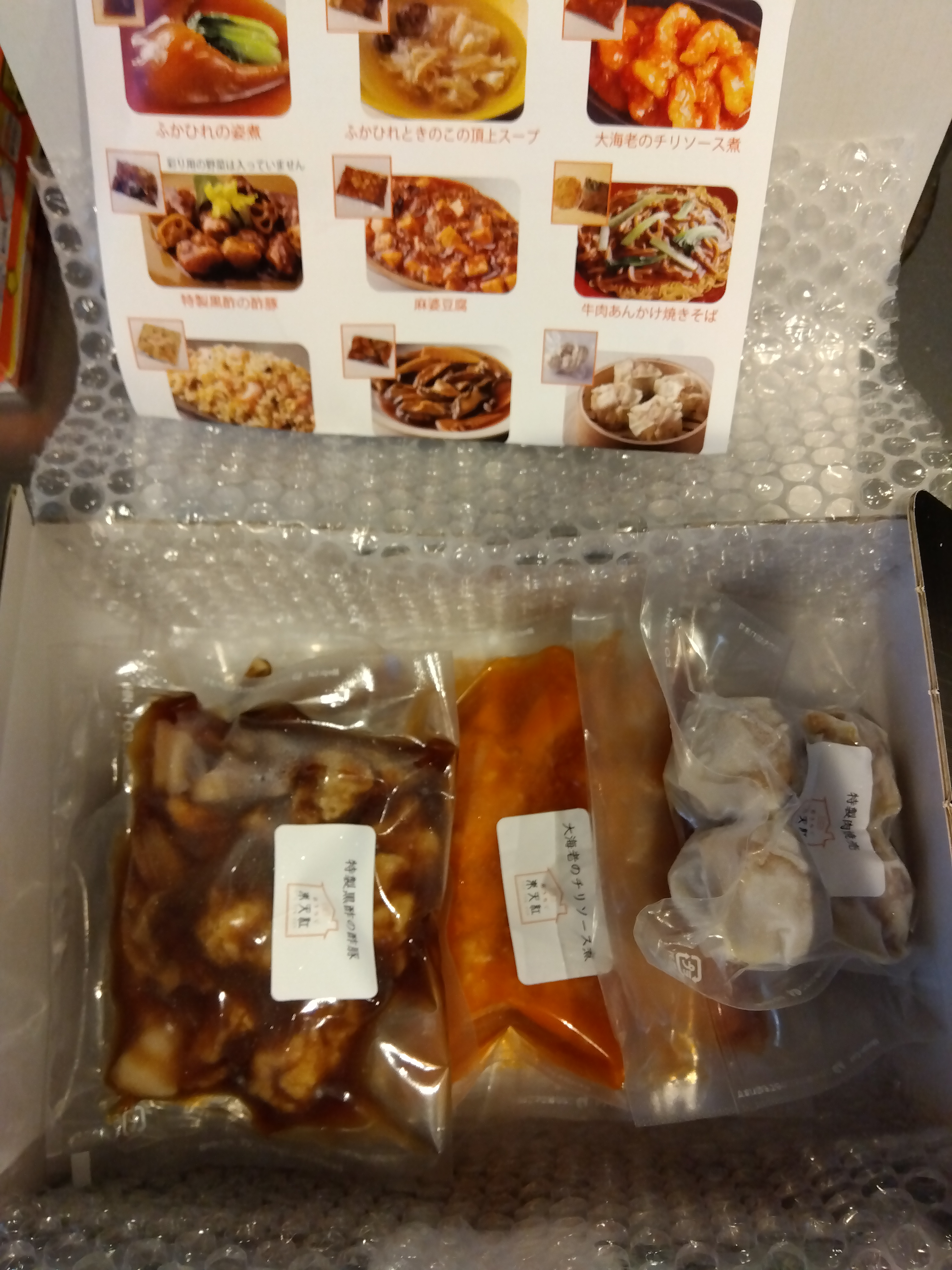 大海老のチリソース煮、特製黒酢の酢豚がそれぞれ2袋特製肉焼売が4個入り1袋です。