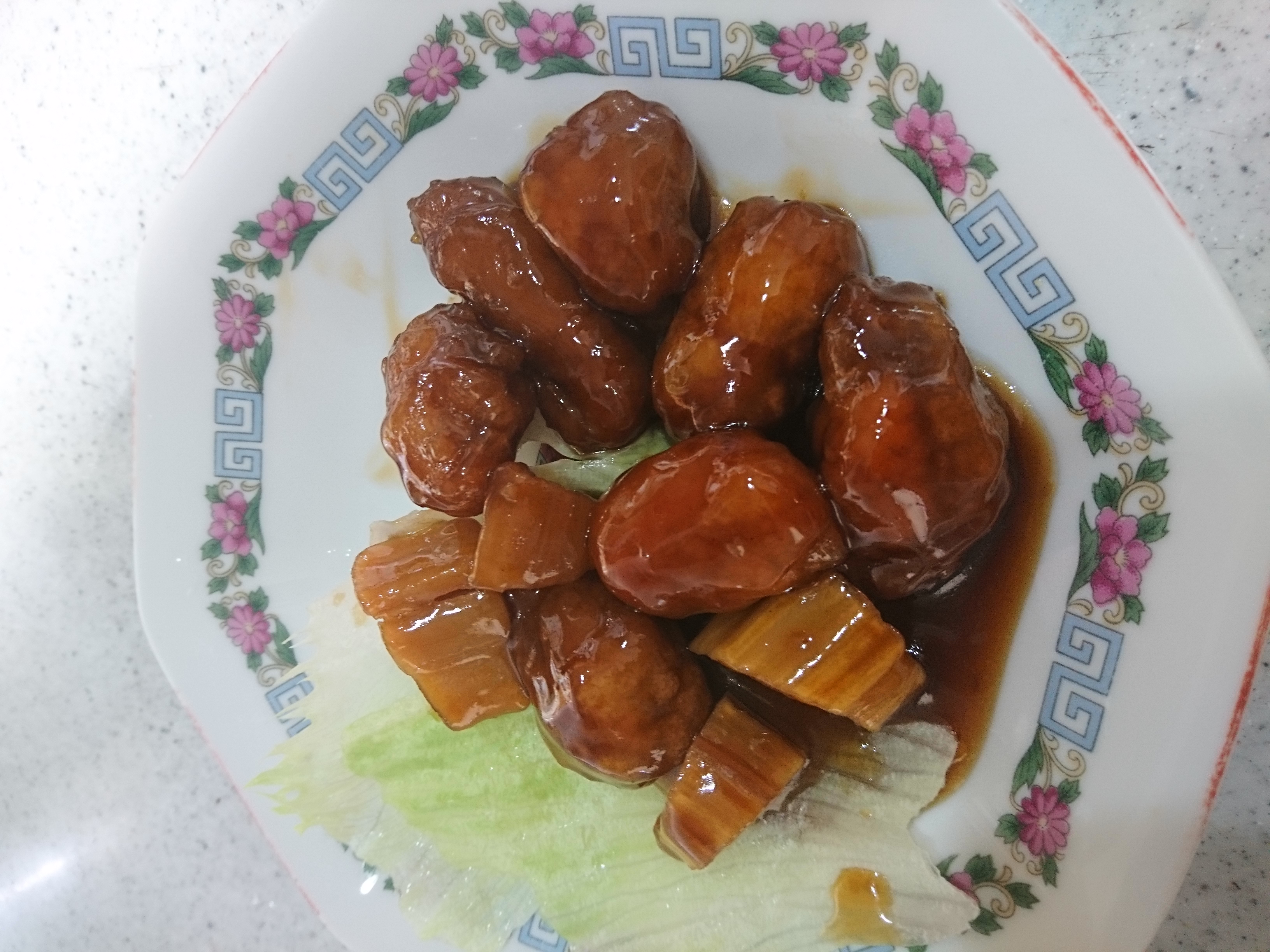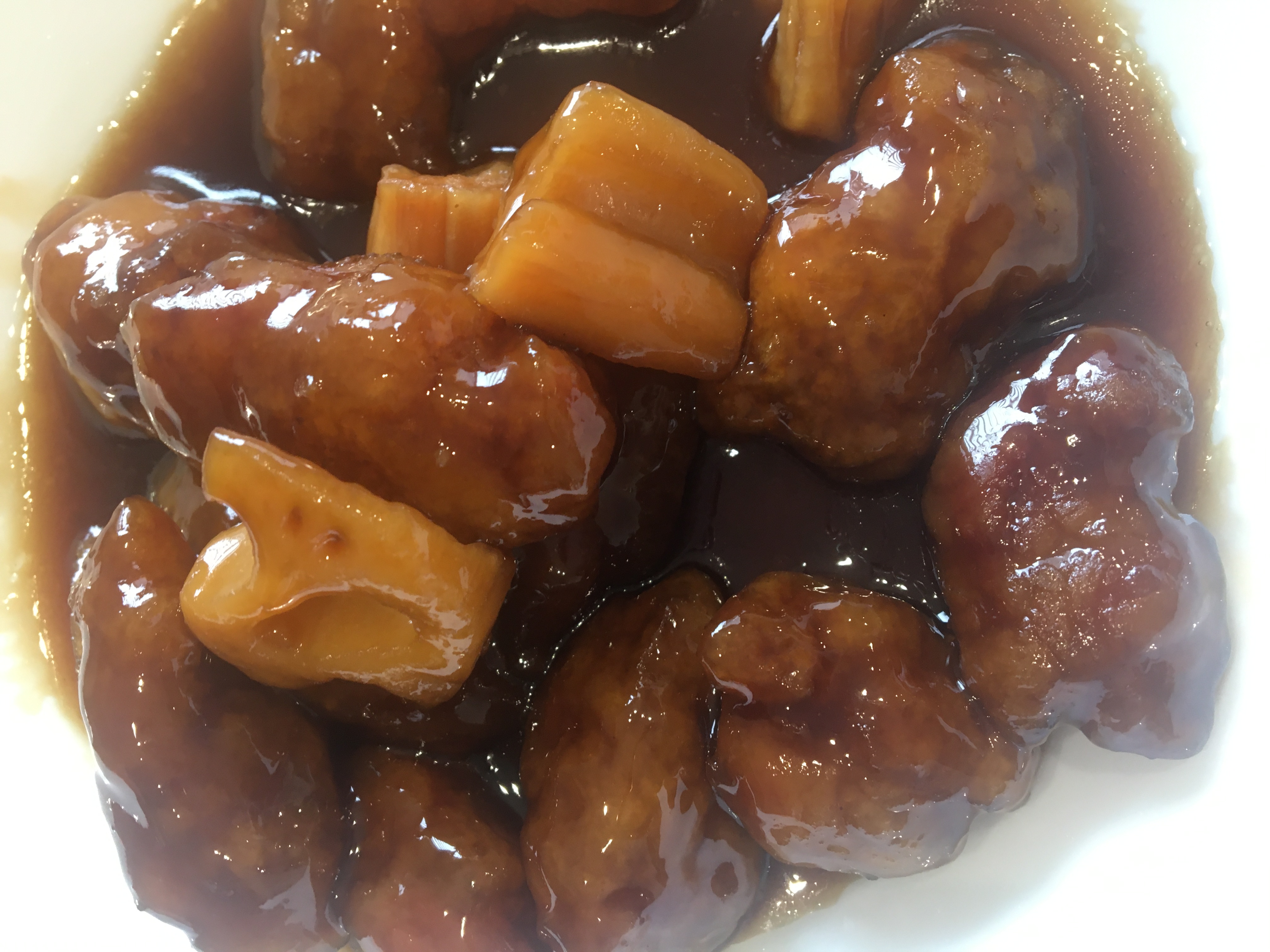 もっちりとしたレンコンとゴロゴロ入った豚肉に絶妙なバランスの甘酢ソースがよく絡んでいます。