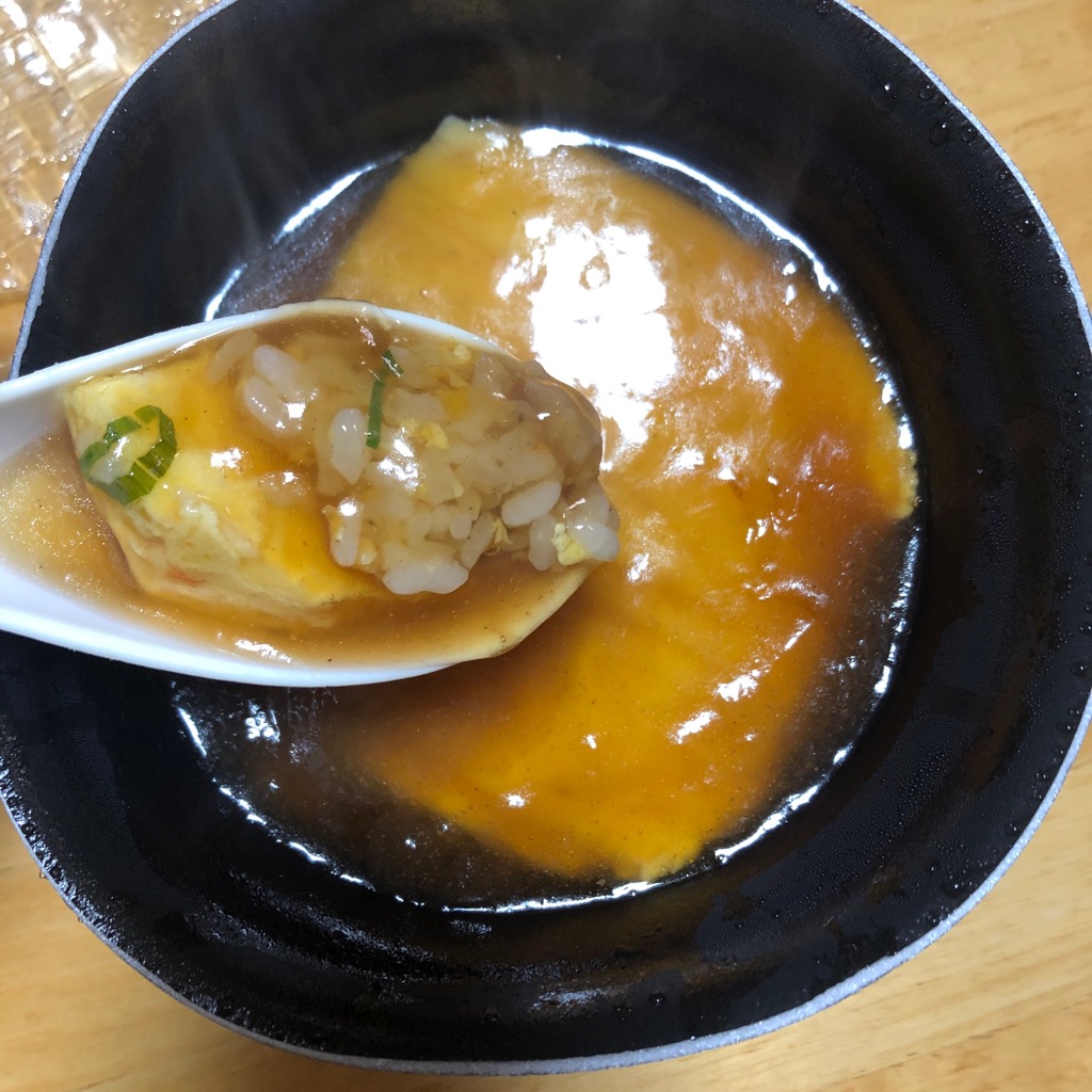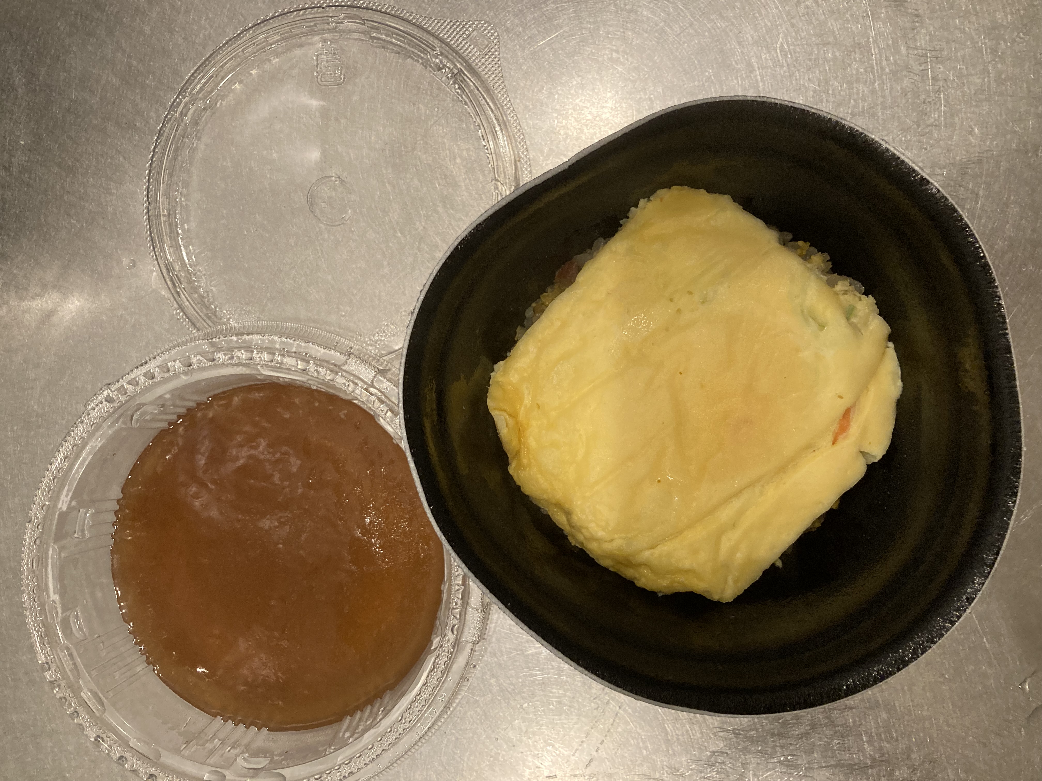 あんかけと、かに玉チャーハンが上下分かれて別々に入っており、最後にあんかけをかけられるようになっています。