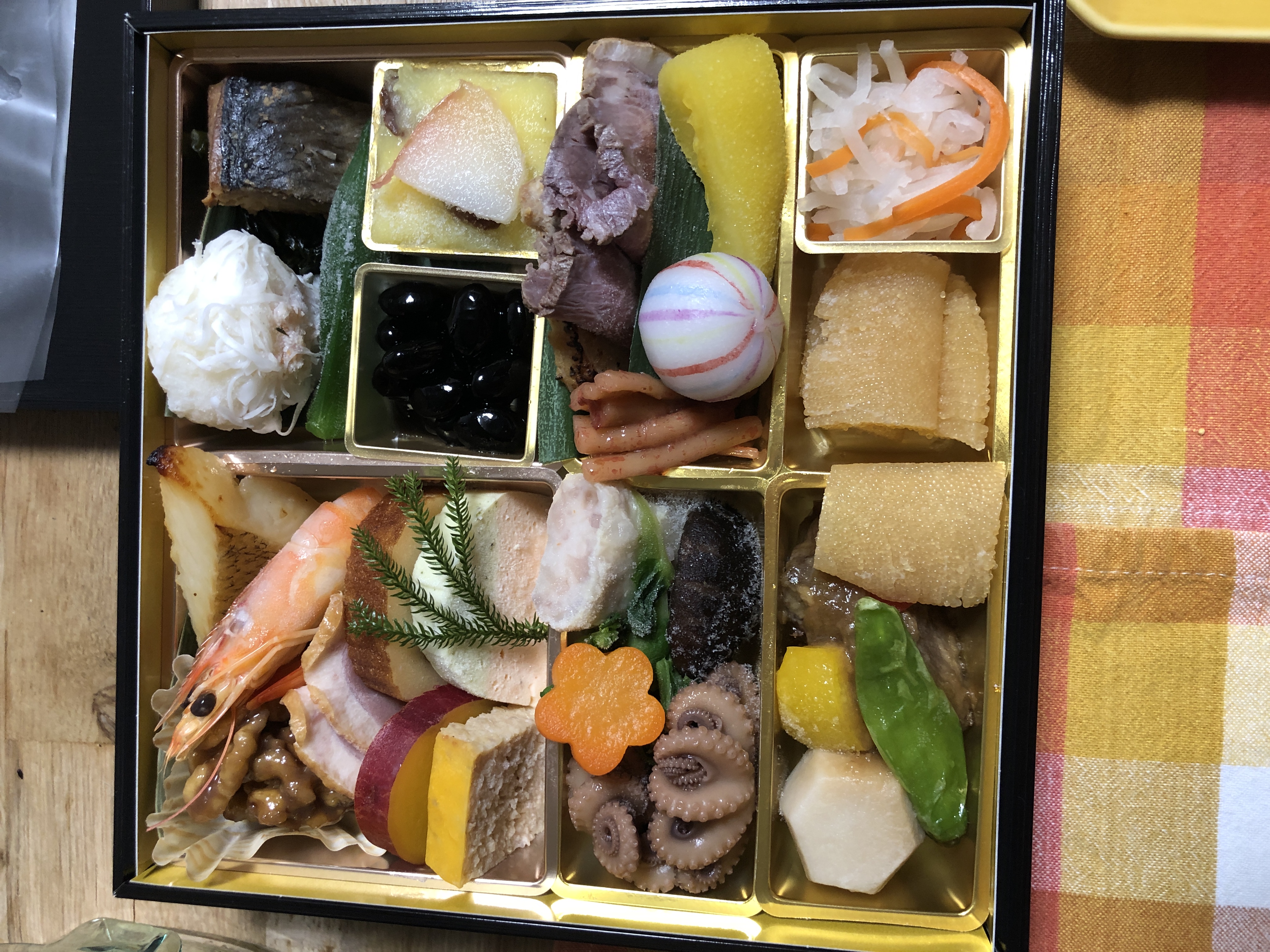予定通りの時刻に、コンパクトな段ボールでしっかり保護された状態で届きました。お重がきっちり入る大きさで、周りに隙間が全くないぴったりサイズ。箱の中で動くことがなく、従って中身が崩れる恐れもなく、また、中身がぎっしりと詰まっているため、お重のふたを開けると、そこには”完璧な、一種の芸術作品”ともいえるおせち料理が現れました。