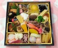 お正月に合せた、梅柄の風呂敷に包まれて、お品書きと共に届きました。風呂敷を開けると、そのまま食卓に出せるようにお重に入ってます。蓋を開けると、ビックリ!目にも楽しい盛り付けで、豪華で感動ものです。