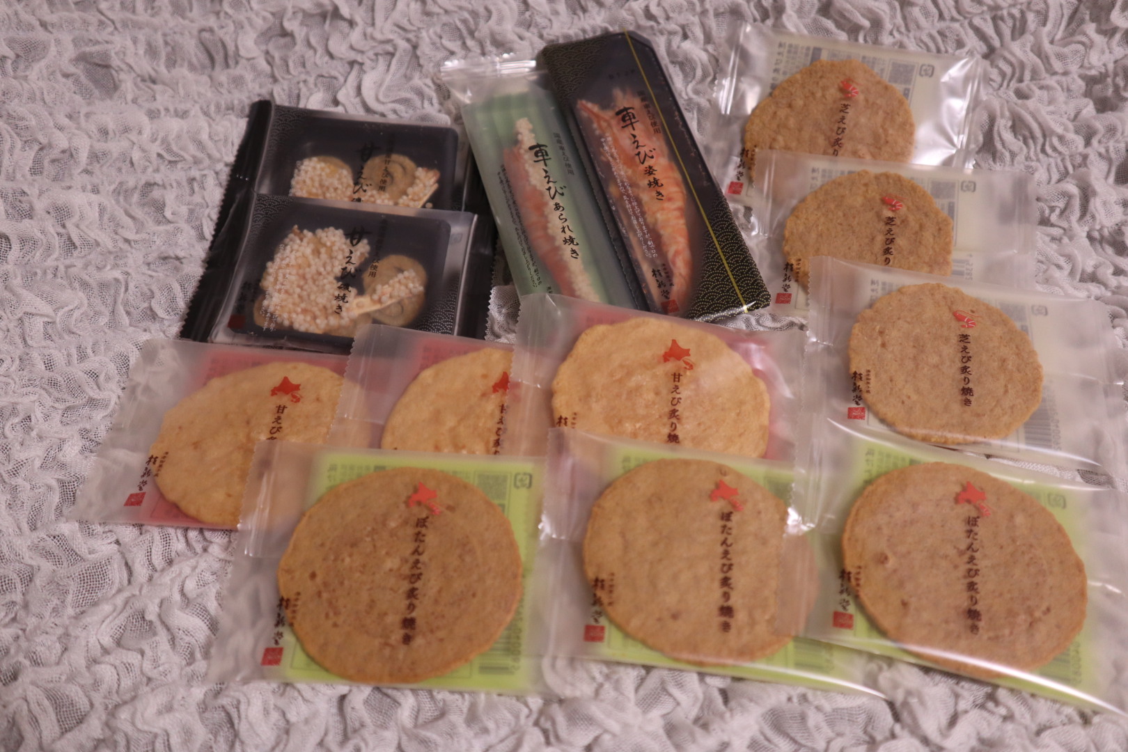 まず、車えびの姿焼きをいただきまして、形もしっかり大きくて美しくて、個包装を開けた瞬間に海老の香りが漂ってきて、裏面にあられが控えめについてるのがまた美味しくて、2枚入りですがペロリといただけました。