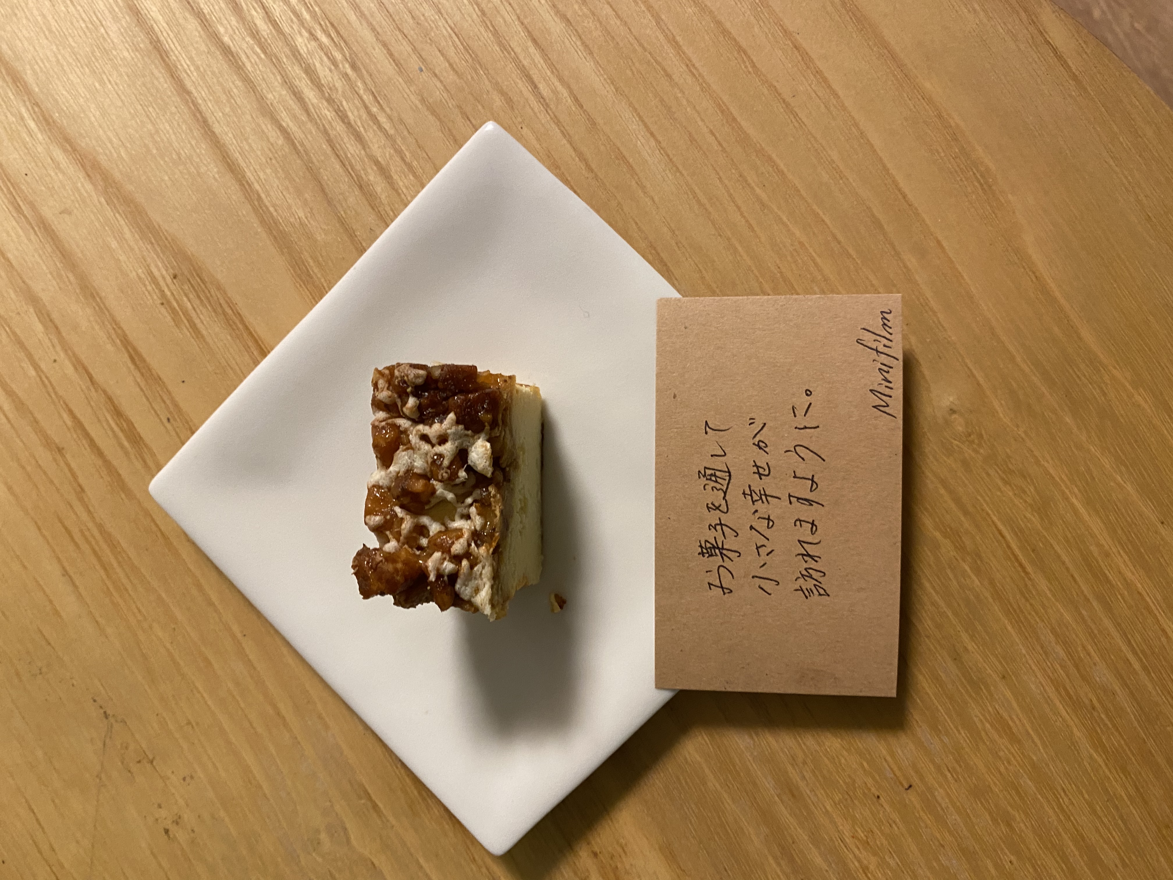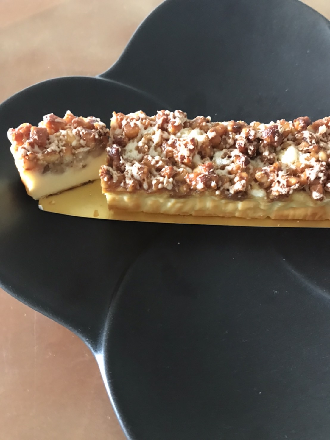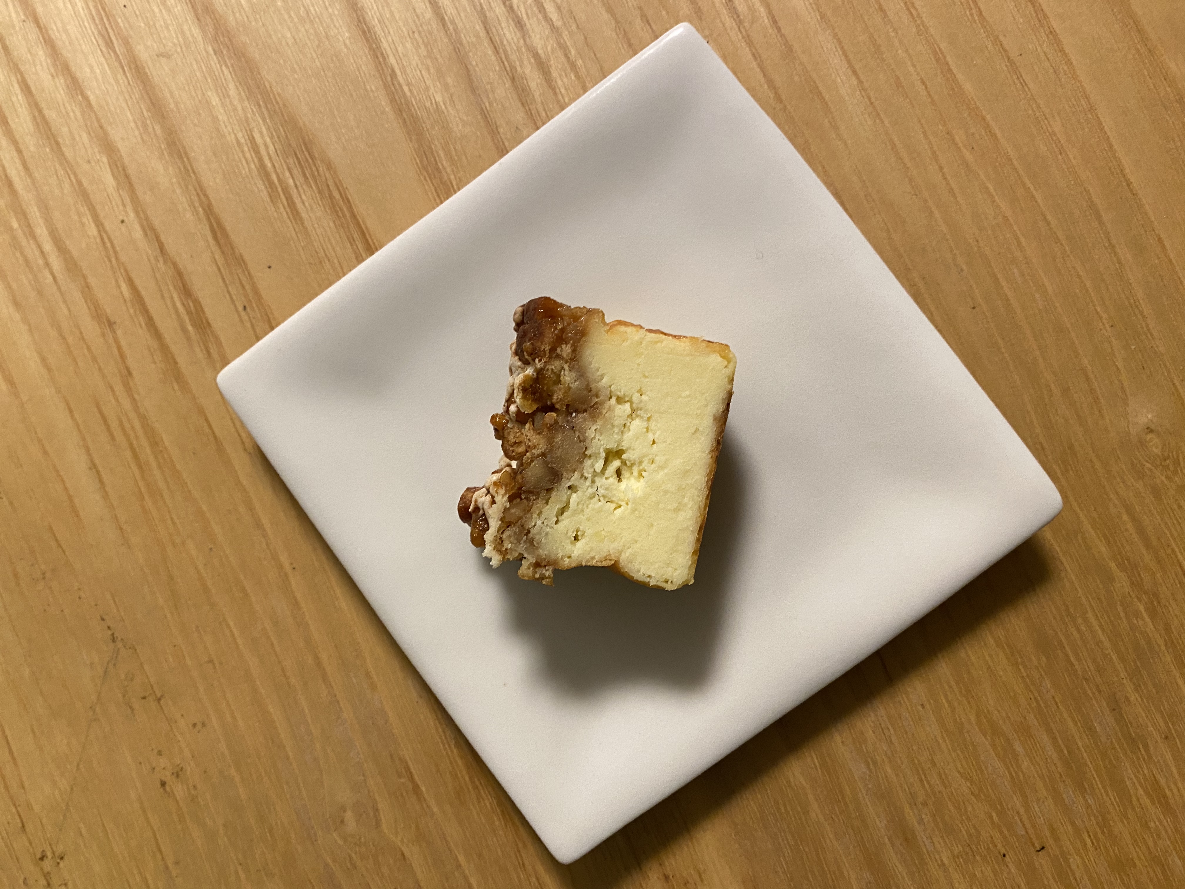 箱を開けると、クルミがゴロゴロとトッピングされたチーズケーキの登場です。写真で見ていましたが、実物は想像を上回るたっぷりのクルミでテンションが上がります!横から見ると、チーズケーキの高さの半分はあろうかという程こんもりとクルミがのっており、これは贅沢なチーズケーキだとわくわくします♪包丁を入れるとき、上のクルミが崩れないかドキドキしましたが、はちみちをあわせてあるので纏まりよく、綺麗な断面にカットできます。これならお客様へのお茶請けにも安心です。