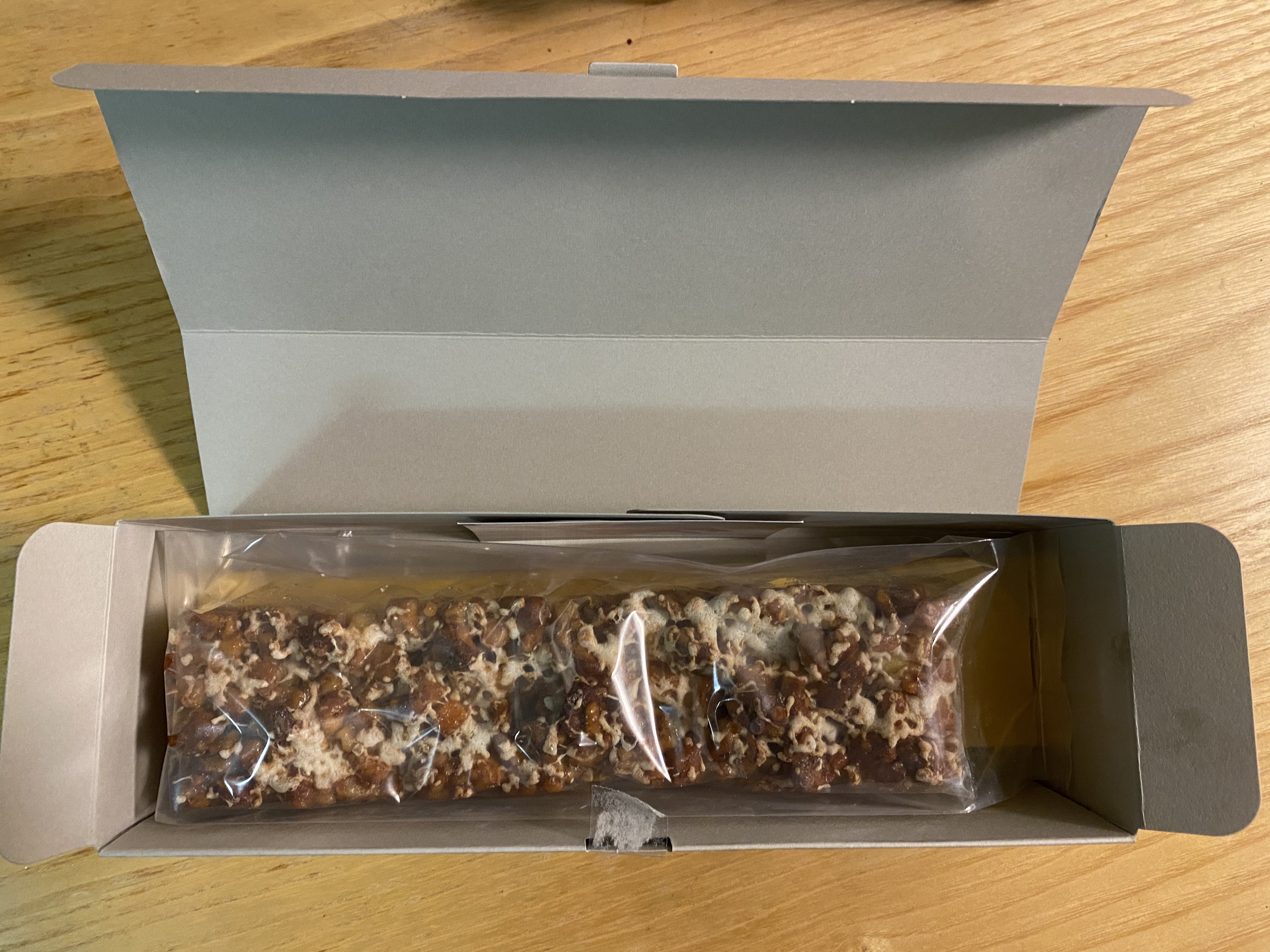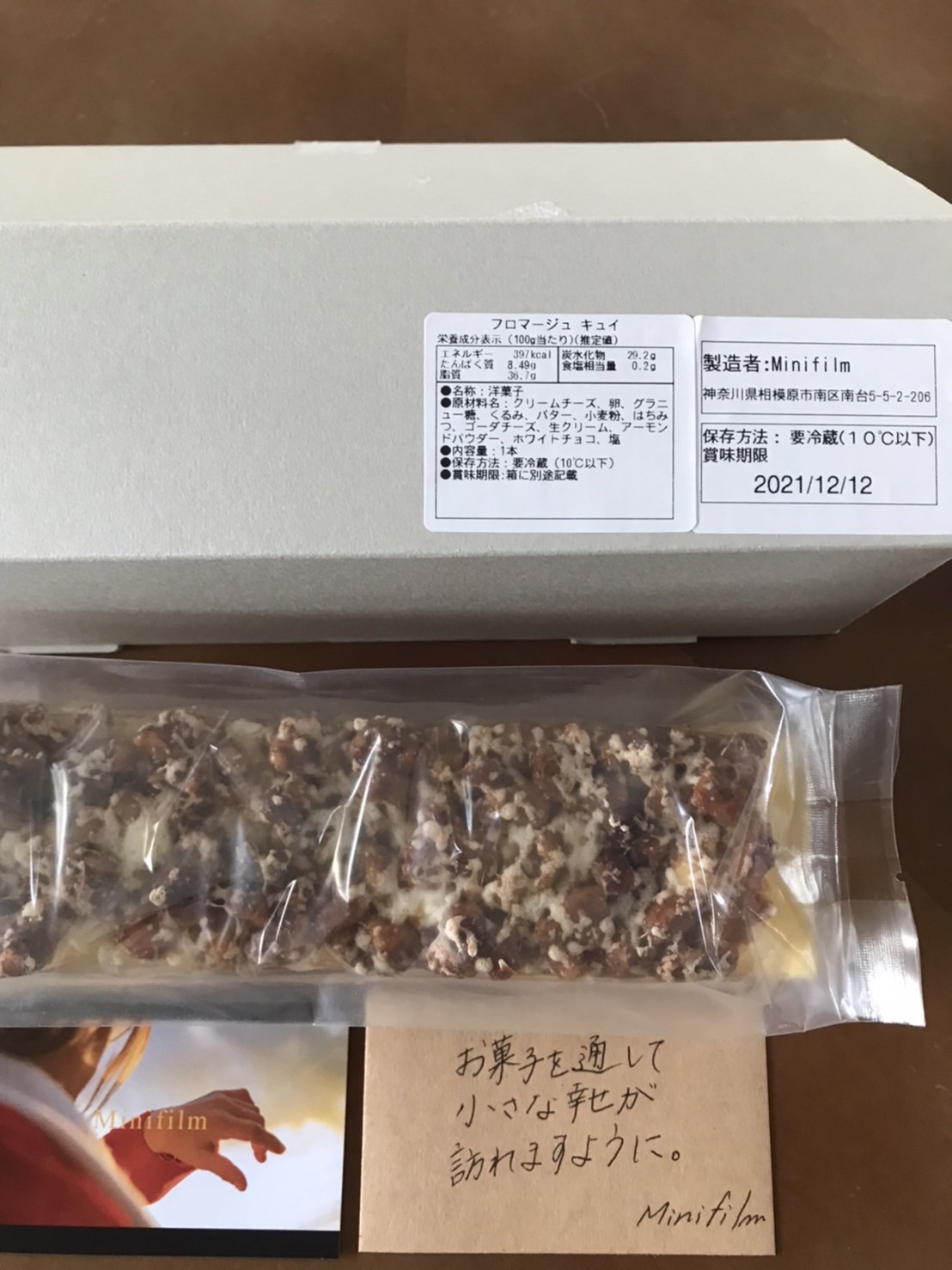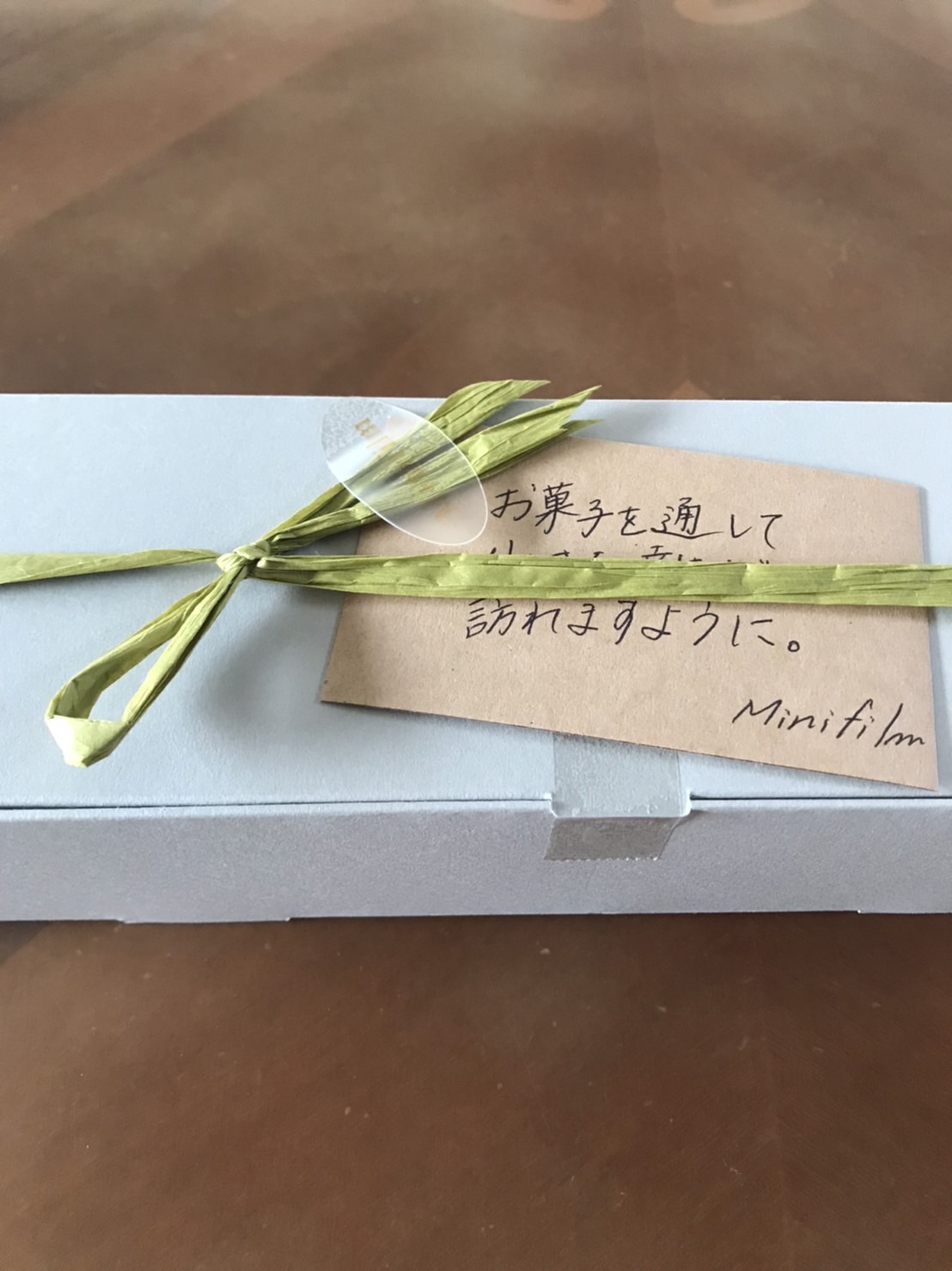 茶色の紙袋を開けると、グリーンの紐リボンが施されたグレーの細長いボックスにメッセージカードが添えられ、ショップさんの心遣いを感じます。ナチュラルな風合いのパッケージで過剰包装でないところにも好感が持て、可愛すぎずスタイリッシュなので大人の方や男性への贈り物にもぴったりです。冷蔵便で届くので、解凍不要ですぐ頂けるのもうれしいポイントですね。夕方到着し、冷蔵庫で冷やして夕飯のデザートに早速頂くことに。