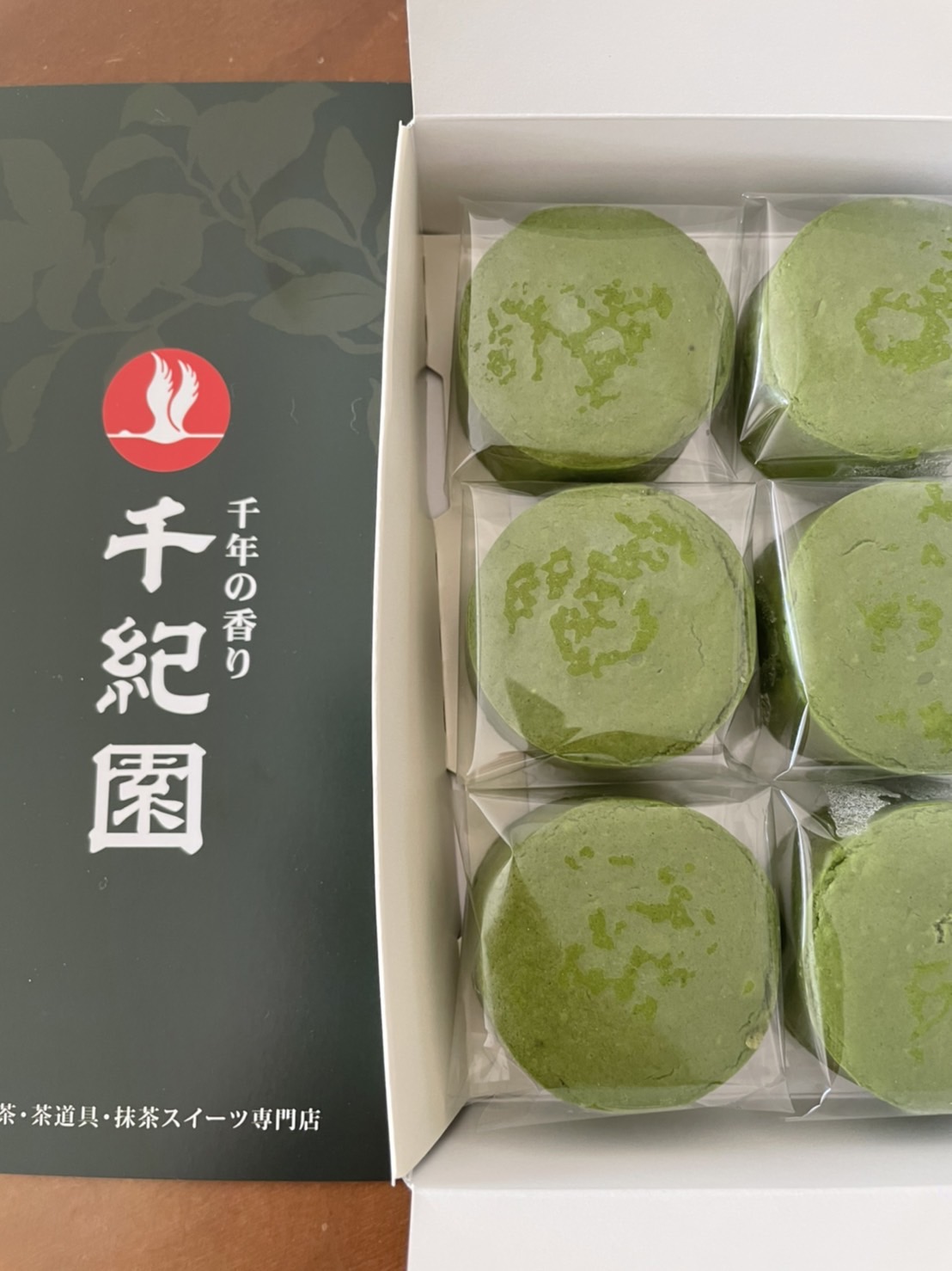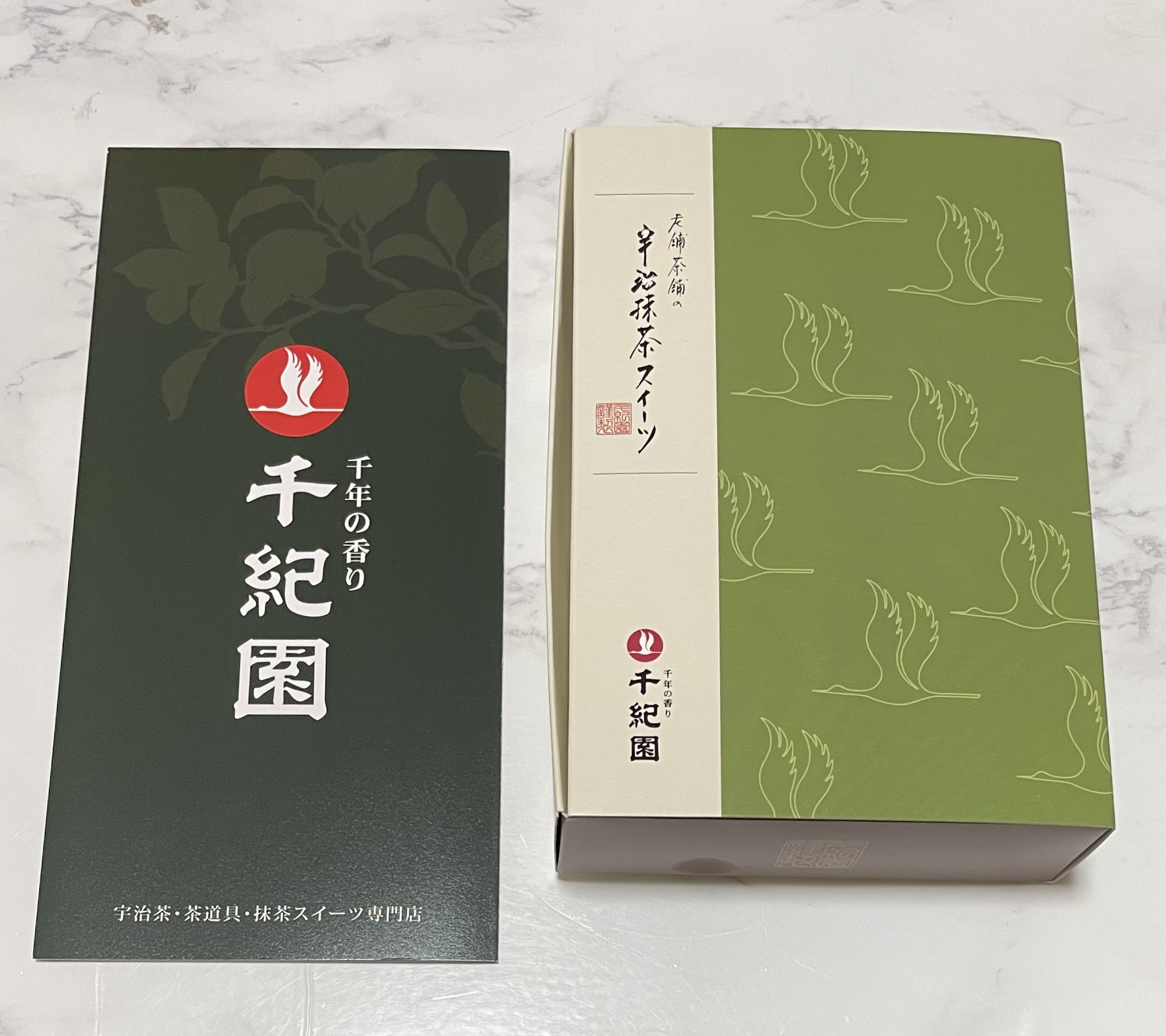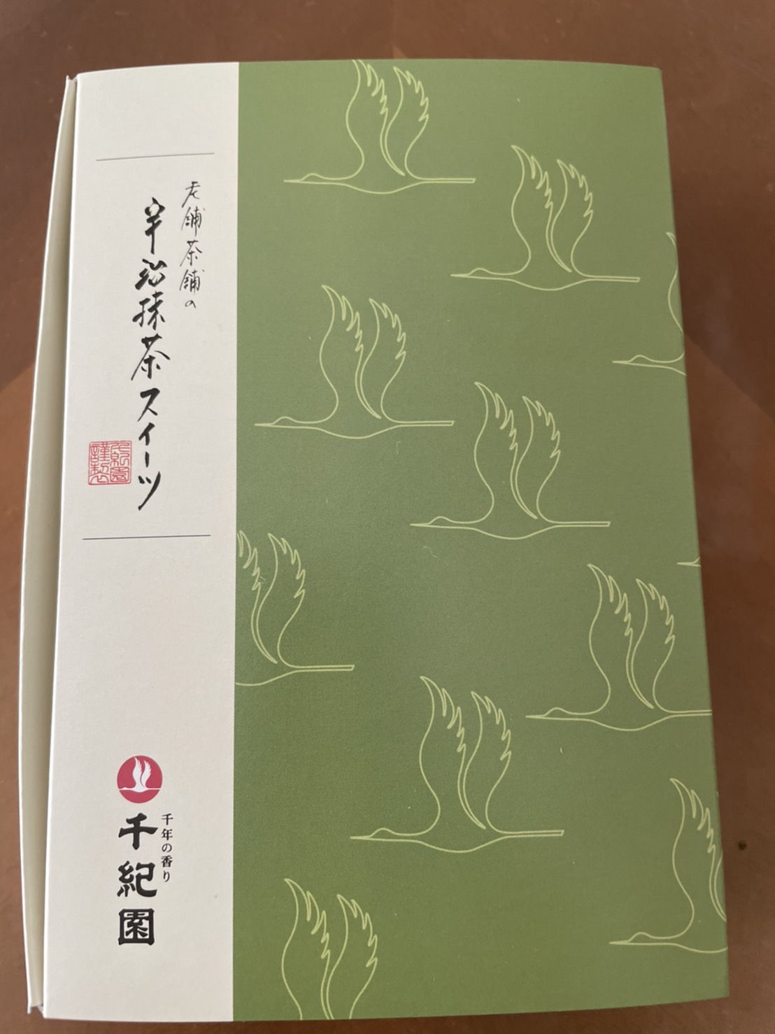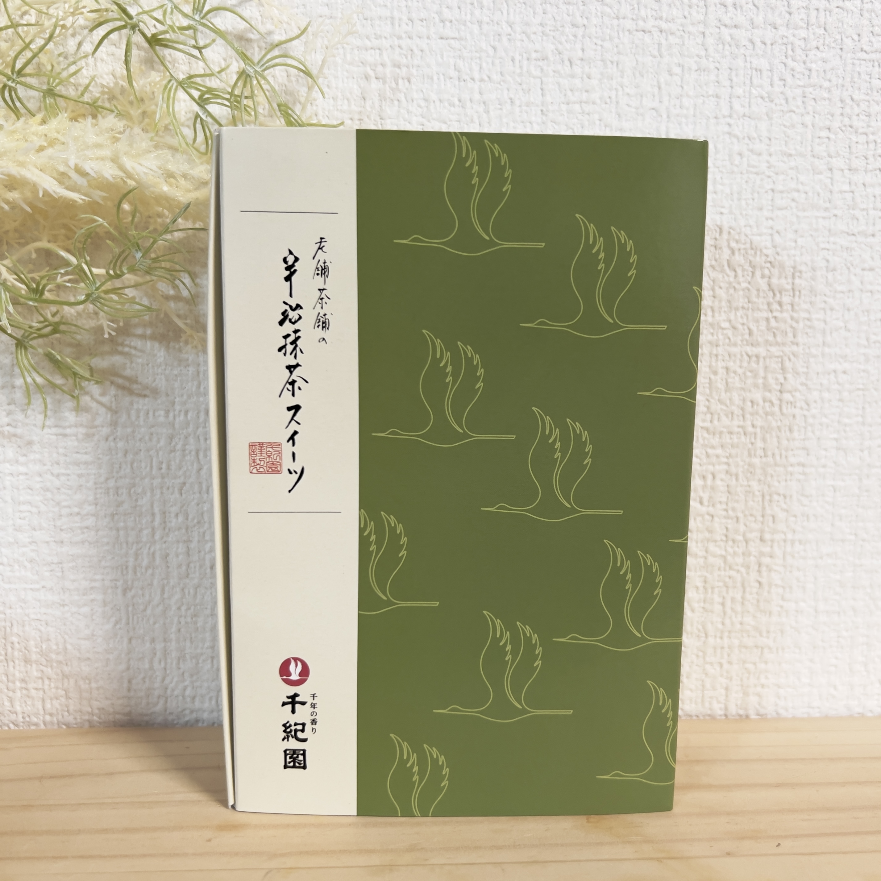 抹茶をイメージした緑を基調とし、千紀園のマークでもある鶴が飛ぶ姿が描かれた箱に入っています。