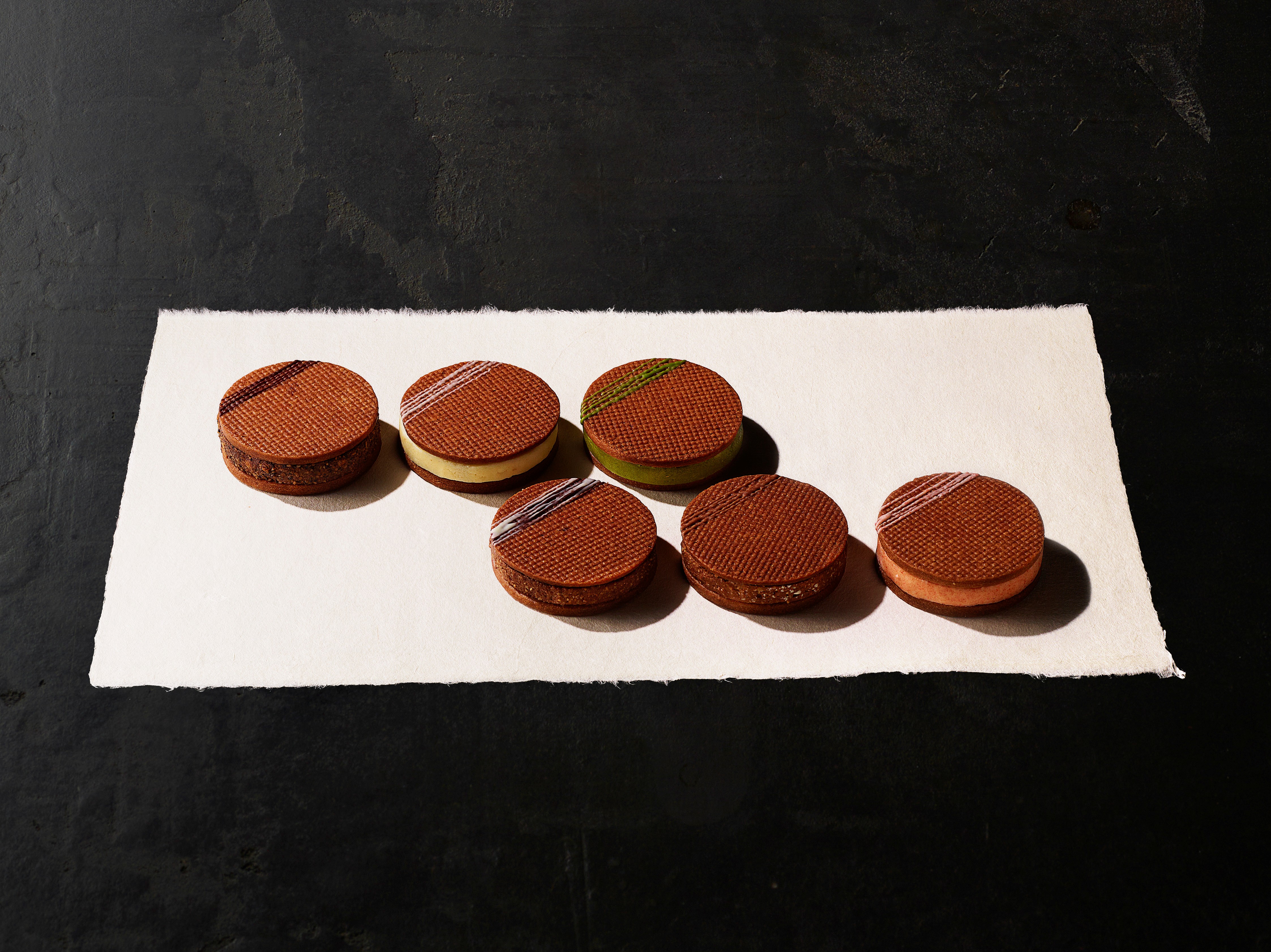 チョコレートと6種の素材を掛け合わせたサクサク食感の「サンドクッキー」です。有機ココナッツや八女抹茶、五島産の天日干し塩など、厳選した素材とオーガニック・フェアトレードのチョコレートを合わせ、サクサクのクッキーでサンドしました。クッキーと甘すぎないフレーバーチョコレートの食感の違いを楽しめます。「アーモンド、ココナッツ、苺、抹茶、ホワイトチョコ、コーヒー」の6種。カラフルな色合いのクッキーなので手土産スイーツとしてもおすすめです。