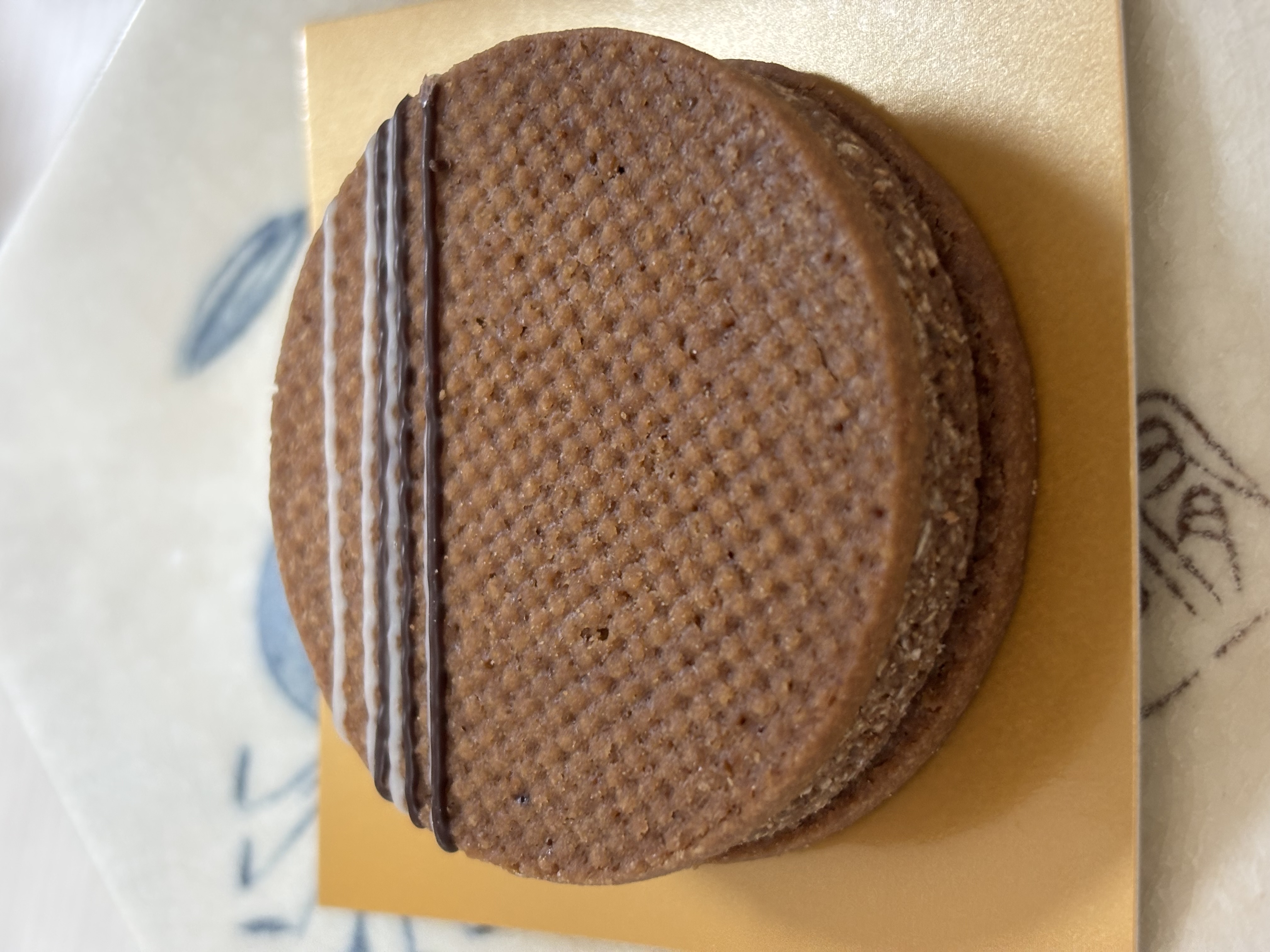 パッケージを開けると、金色の正方形の台紙がルナサンドクッキーに敷いてあります。ちょっと過保護すぎやしないか…と思いましたが、美しいラインの入ったクッキーのビジュアルに過保護にもしたくなるよね、と妙に納得感があります。