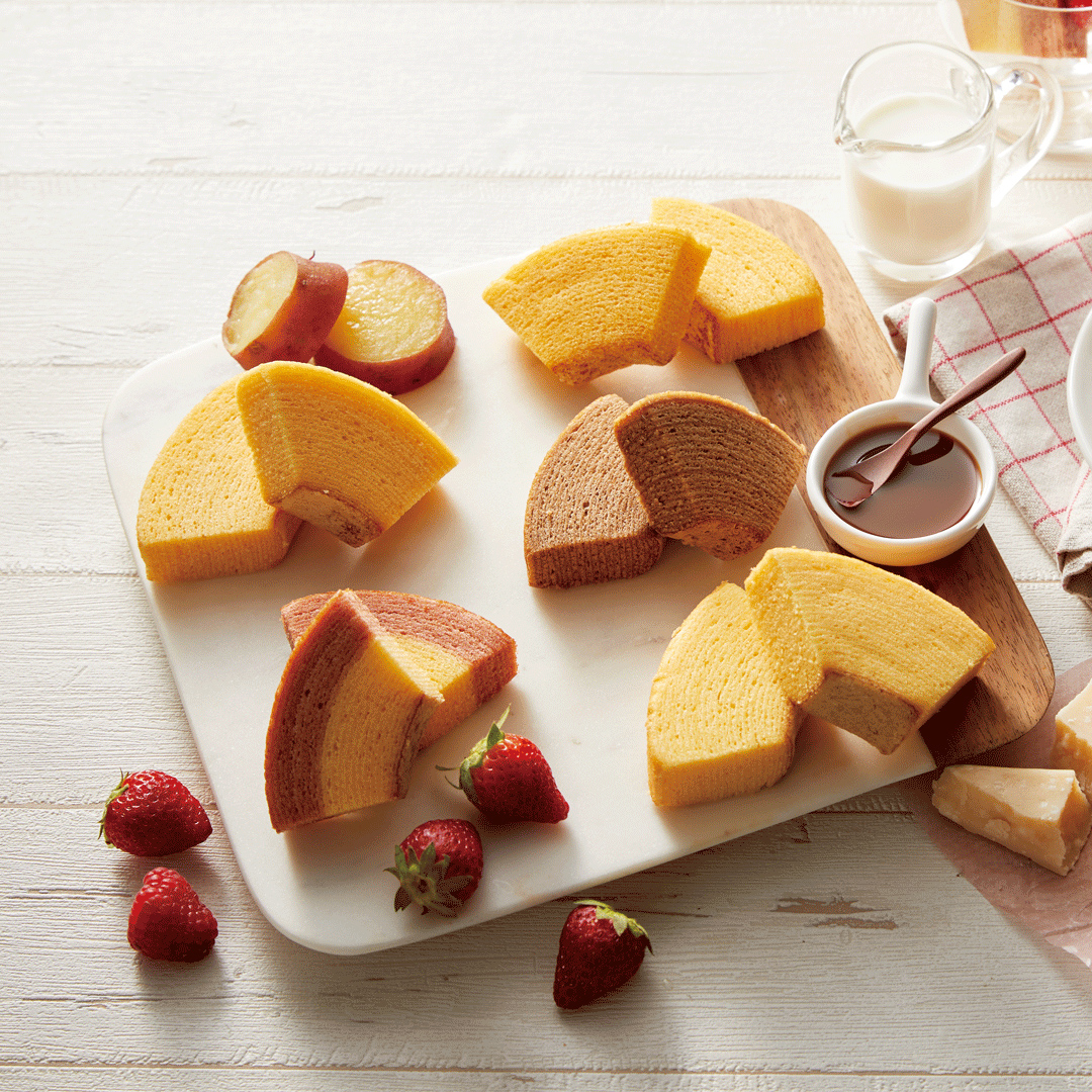 苺ミルク、チーズ、さつまいも、ミルク、キャラメルと5種類の味わいが楽しる大人気の商品。中には食べやすいサイズにカットされたバームクーヘンが可愛く並びます!