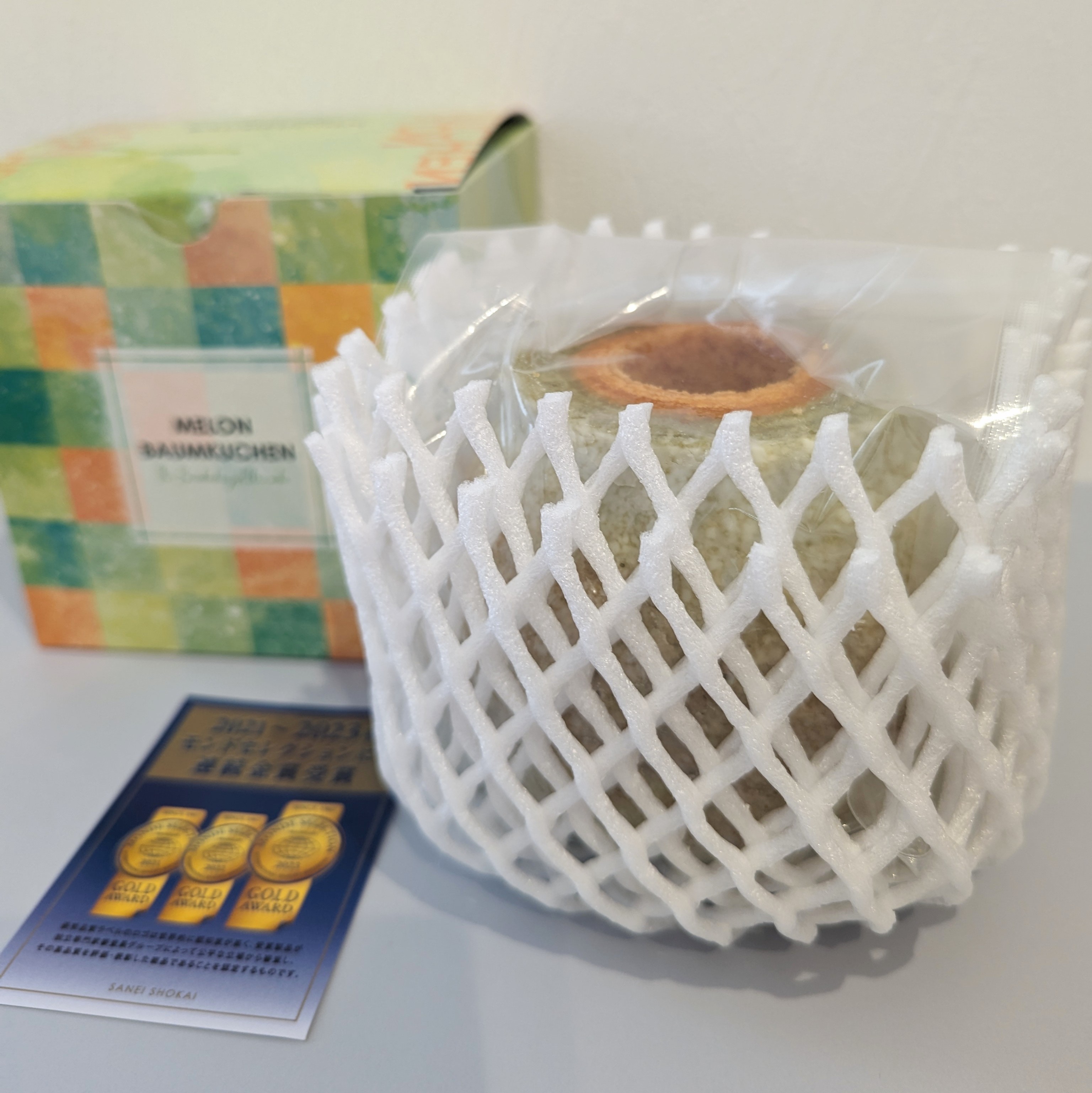 メロンの形を模したバウムクーヘンを、高級メロンのような白い保護ネットで包み、さらにメロンらしさを演出しました。