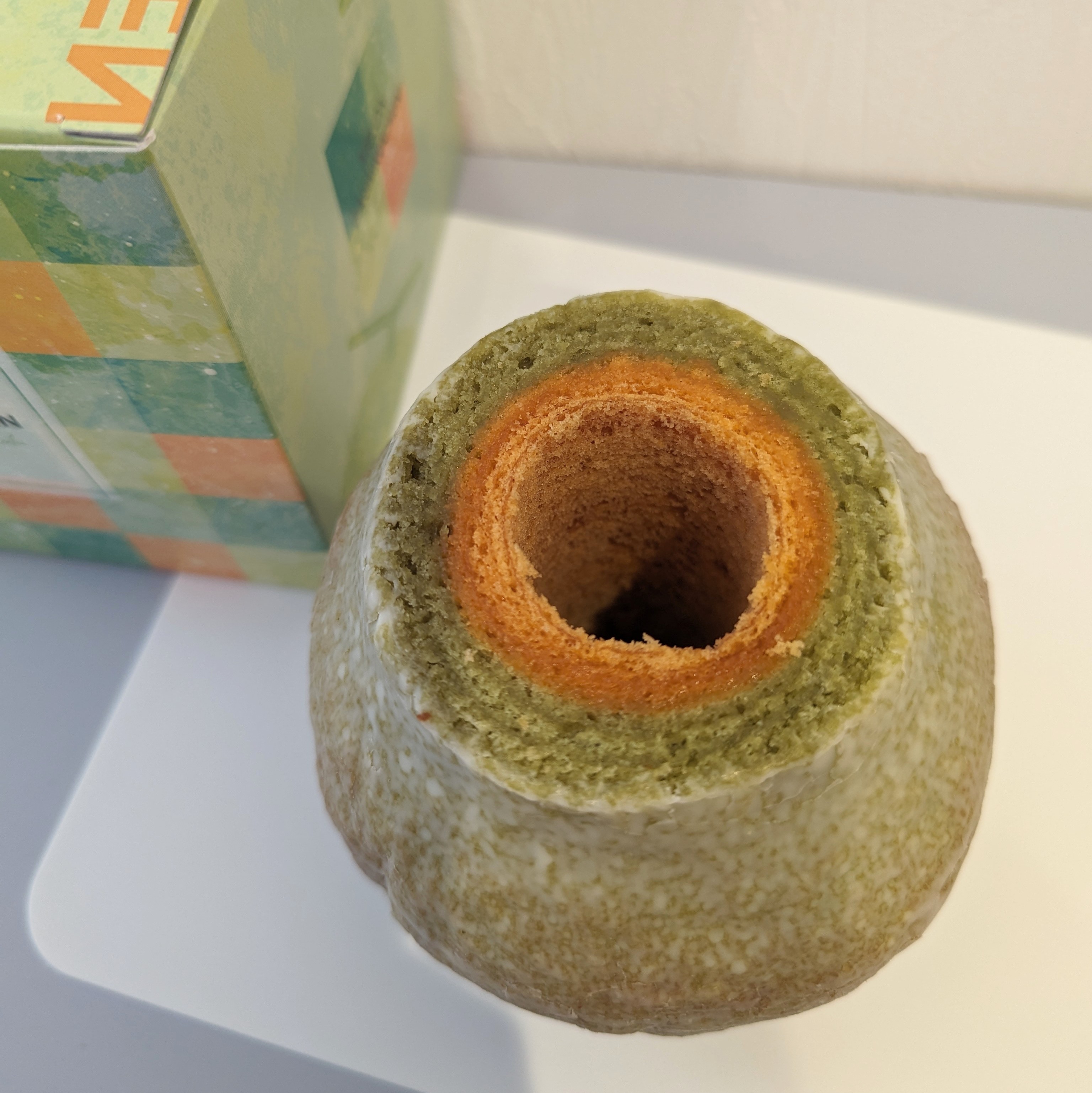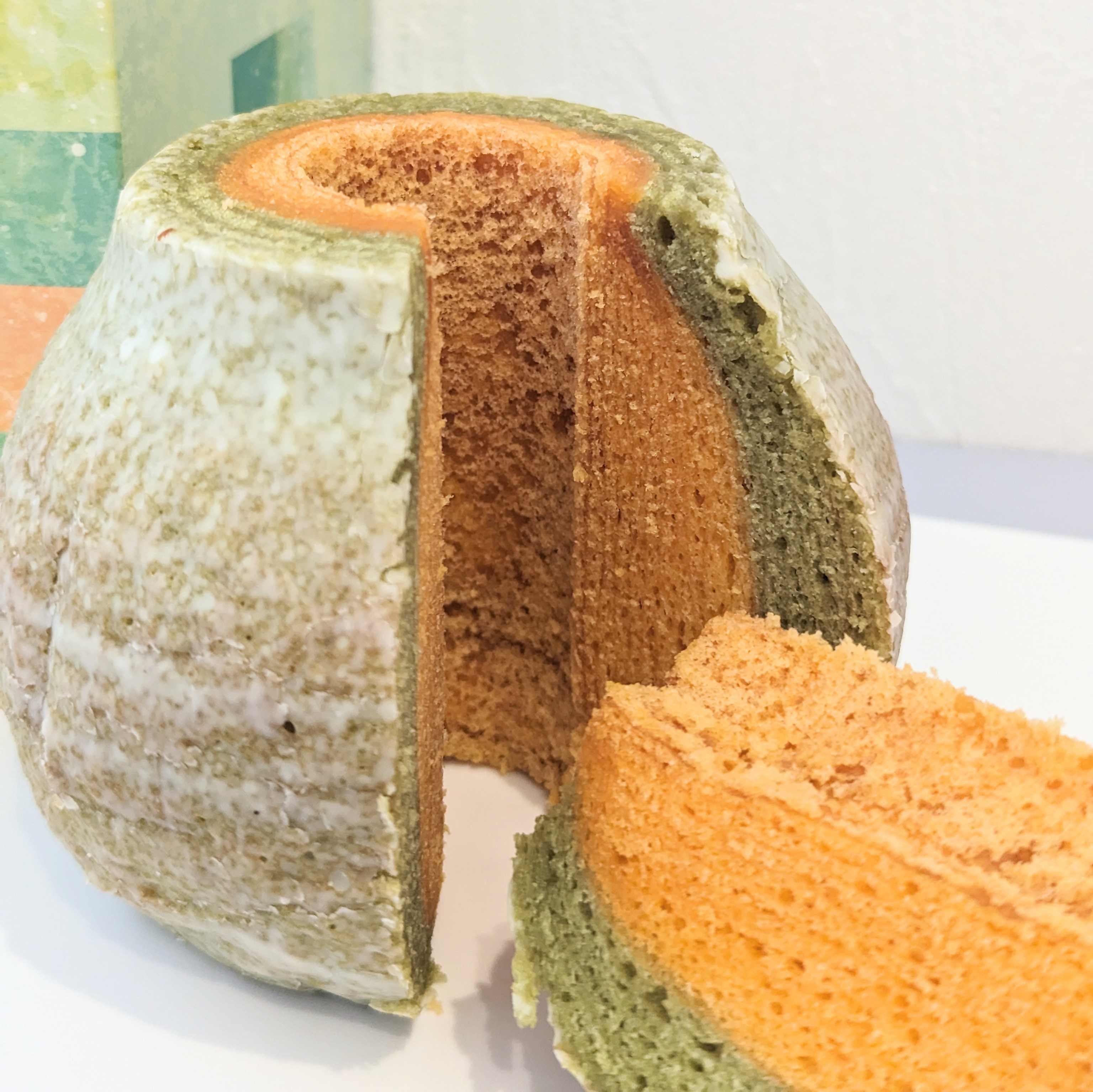 切ってみるとバウムクーヘンならではの層に綺麗な2色のメロンカラー。