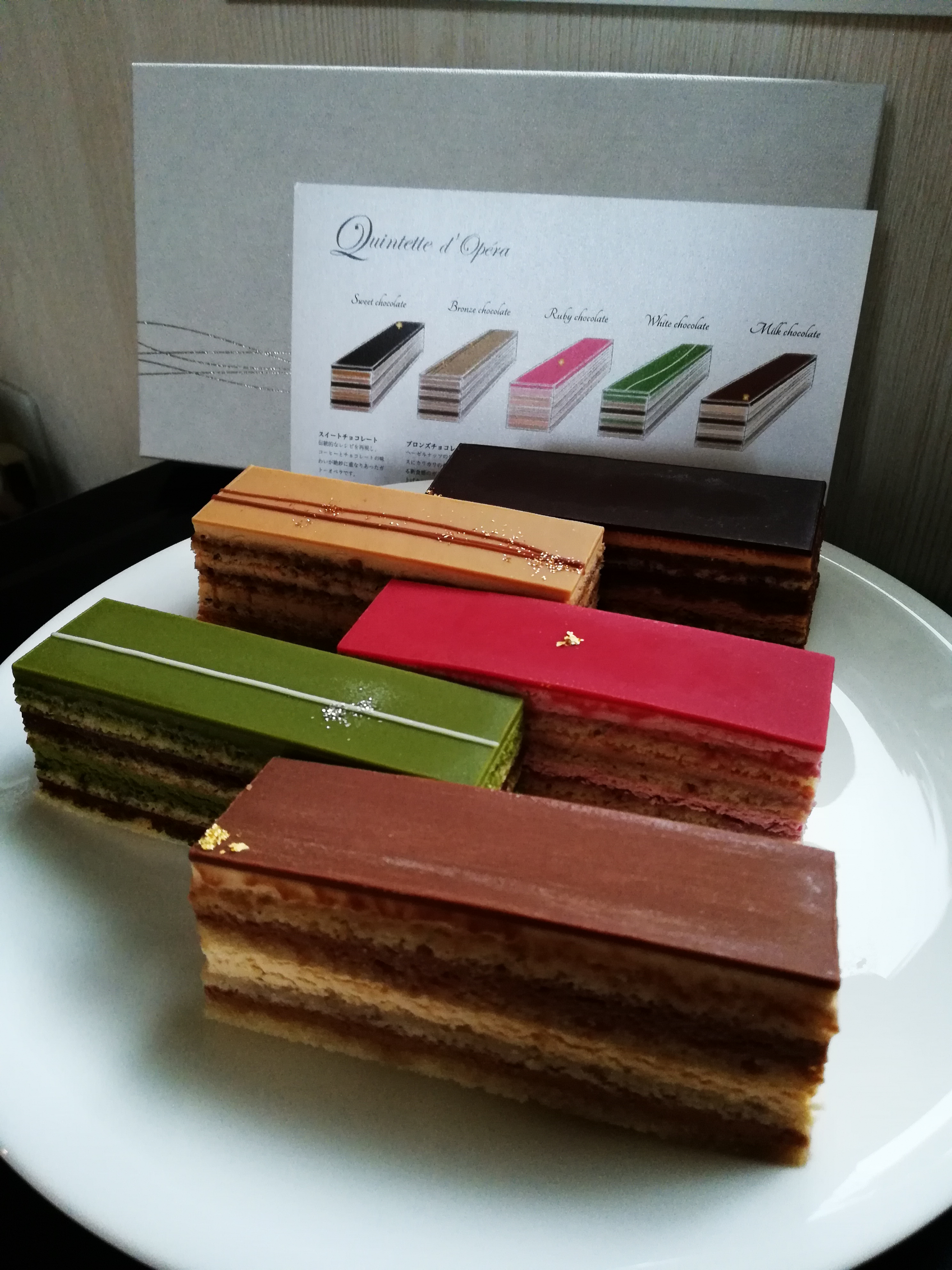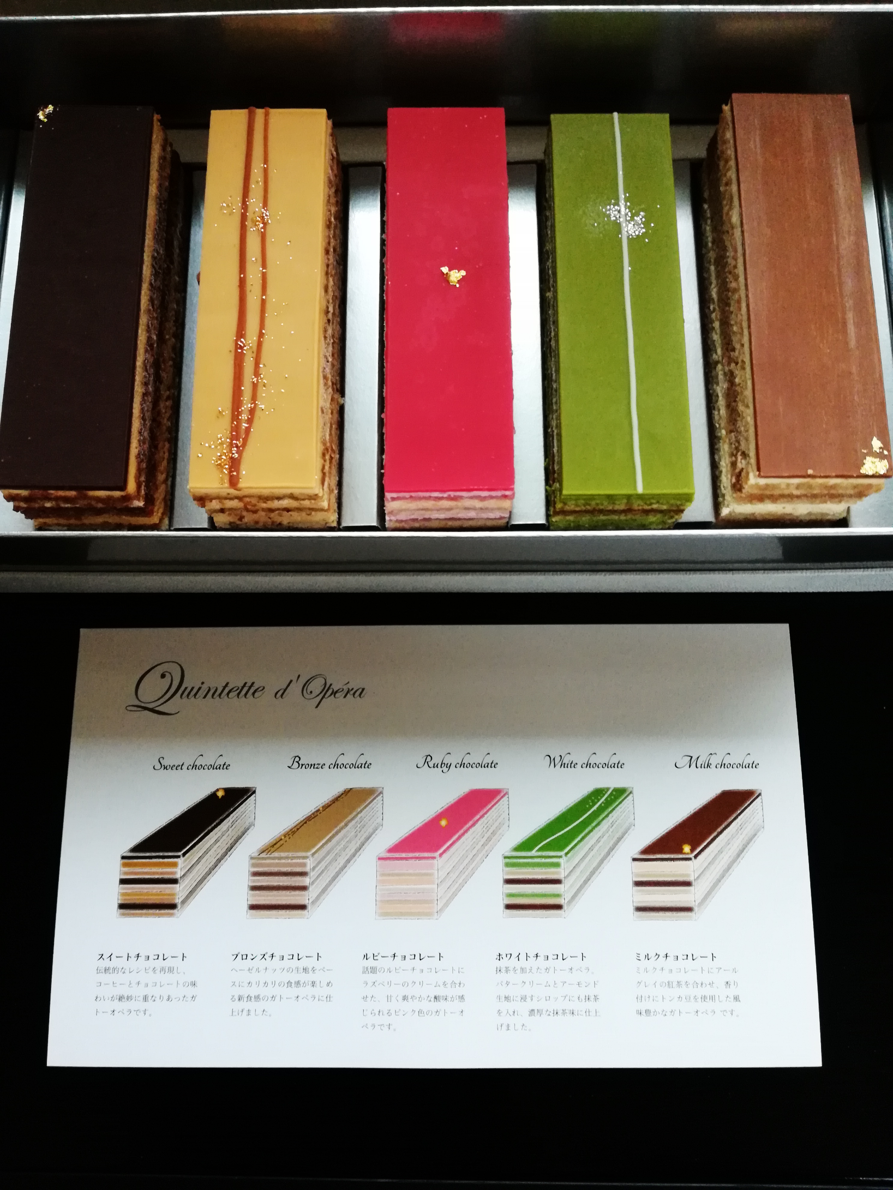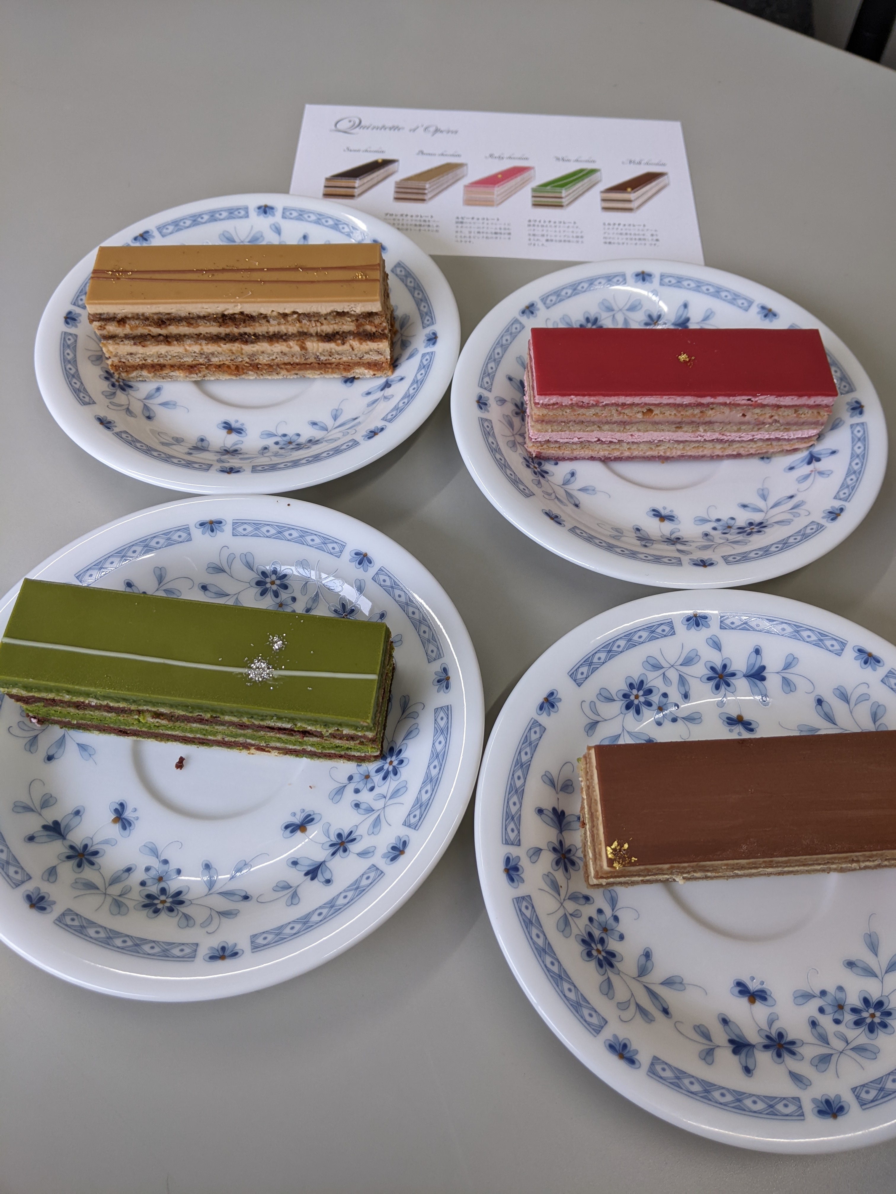 当店では、伝統的なガトーオペラに加え、紅茶のフレーバーをきかせたミルクチョコレートのガトーオペラ、抹茶を入れたホワイトチョコレートのガトーオペラ、ラズベリー味のルビーチョコレートのガトーオペラ、サクサクの食感が楽しめるブロンズチョコレートのガトーオペラをお楽しみいただけます。