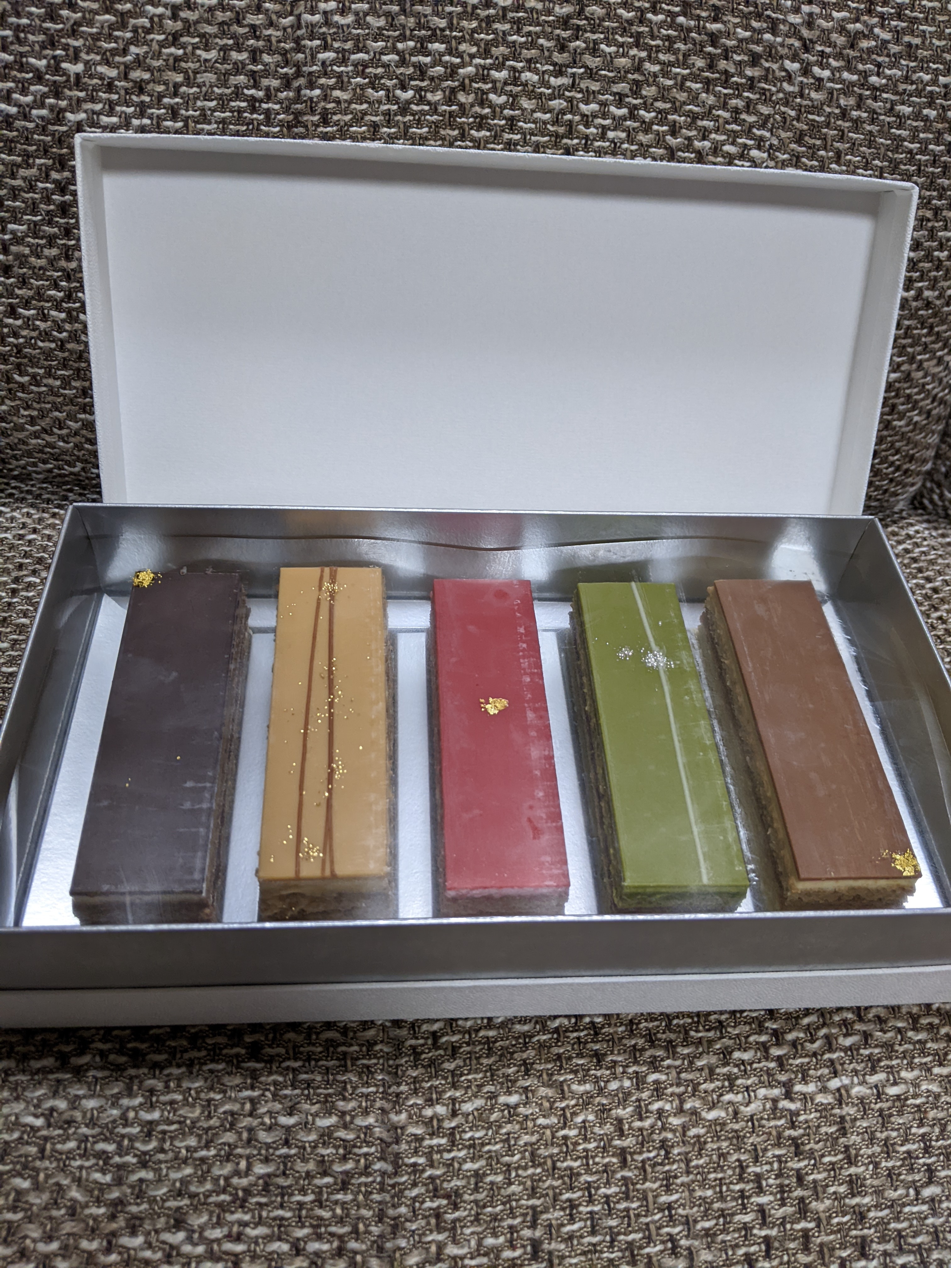 フランスの伝統菓子「ガトーオペラ」です。5種類のチョコレートを使用した5色のアソートセット。フレーバーにあわせてを変えた、ジョコンド(生地)、ガナッシュ、バタークリーム、グラサージュを7層に組み合わせ。それぞれの素材の風味を堪能できるバランスで仕上げました。伝統的なガトーオペラ「スイート」は、アーモンド生地ジョコンドに、ブランデーをきかせたコーヒーシロップをたっぷり染み込ませています。ルビーチョコレートの酸味を相性の良いラズベリーをバタークリームと合わせた「ルビー」など、計5種セット。1カットずつ楽しめるオリジナルボックスに入って届きます。
