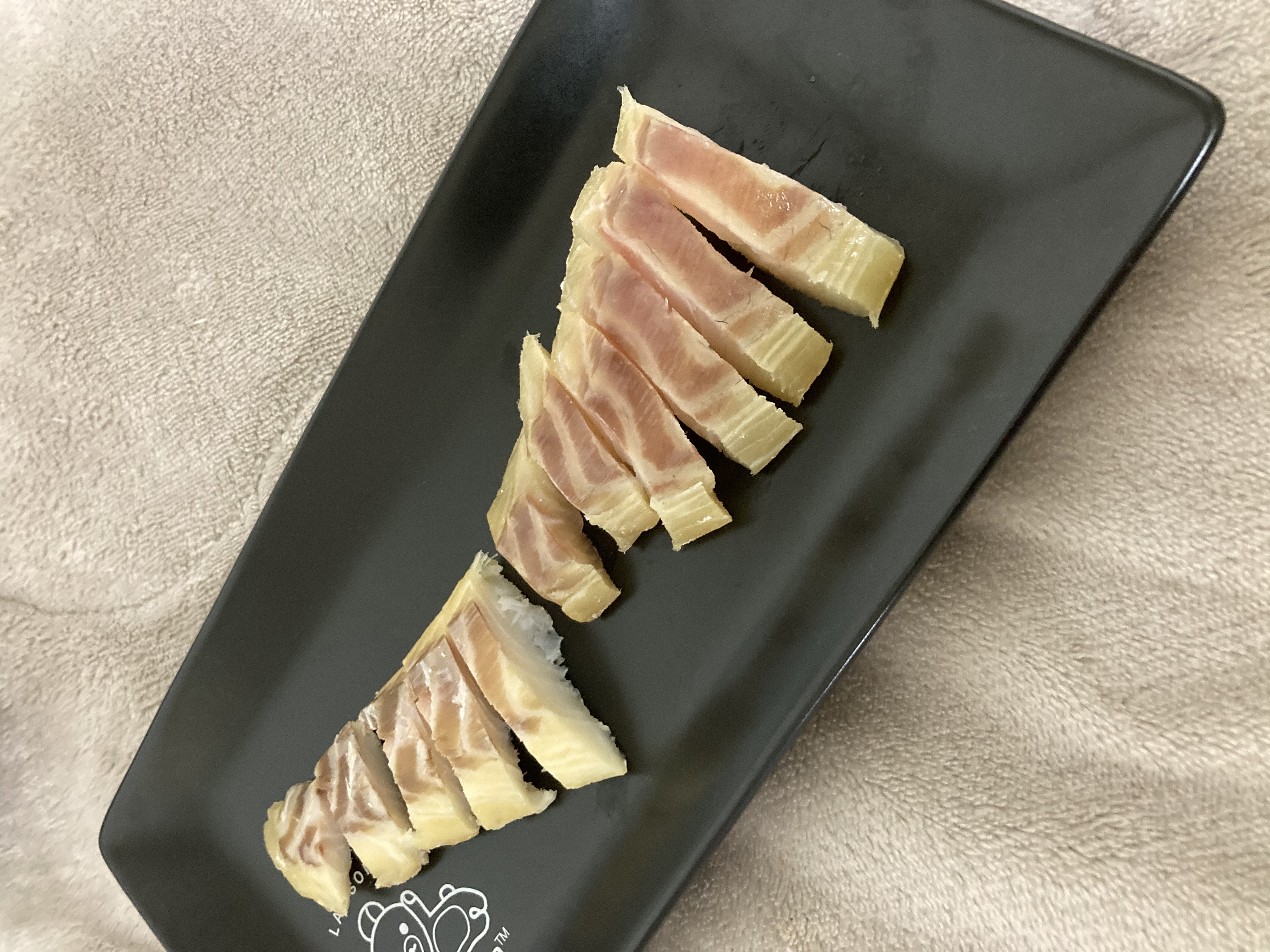 燻製よりも少しスモーク香は抑え目。食感もお刺身に近い感じ。こちらも塩気がちょうどよく、燻製よりも優しい味わい。同封されてい食べ方にあったように、カルパッチョにとても良いと思いました。