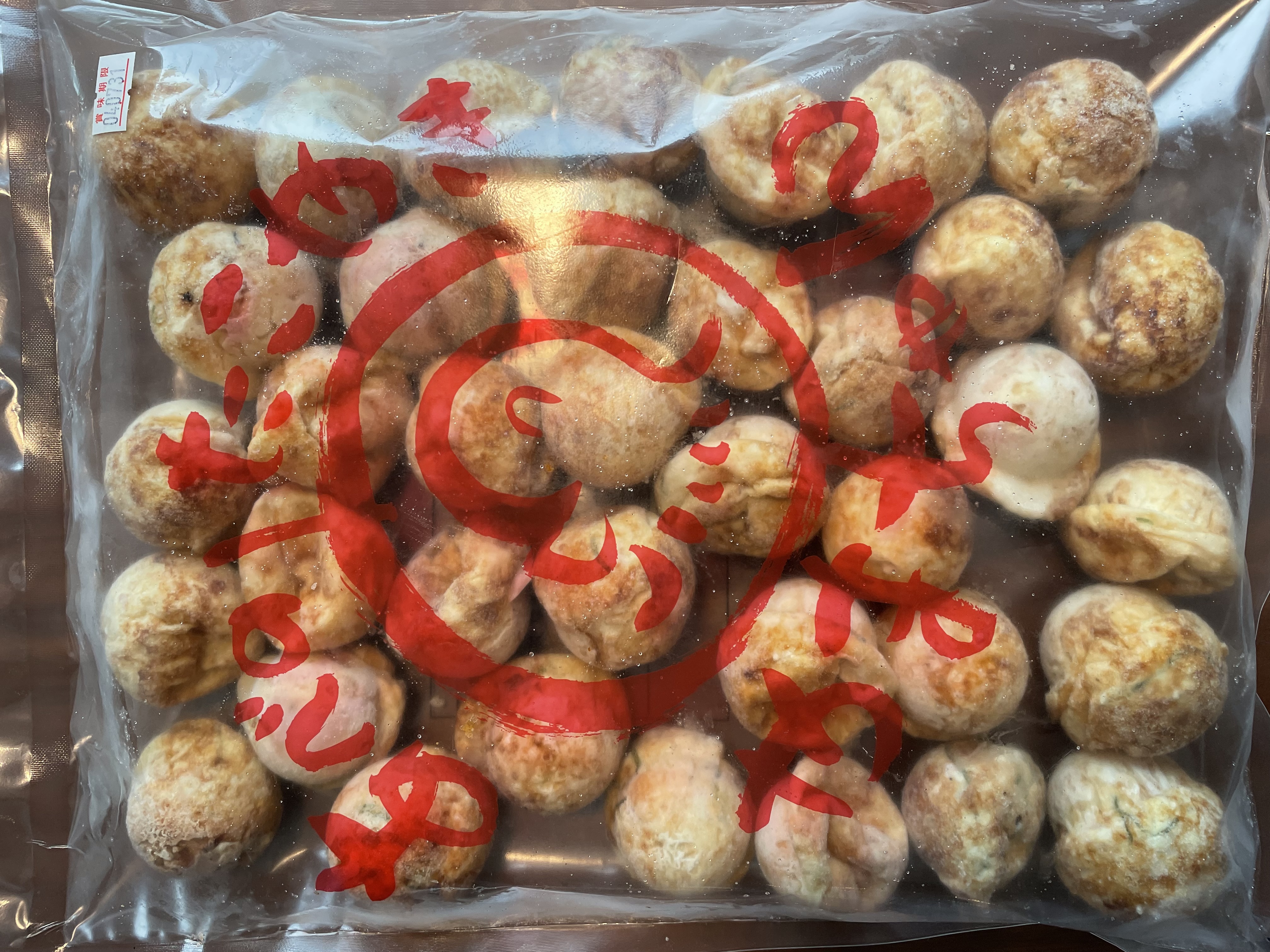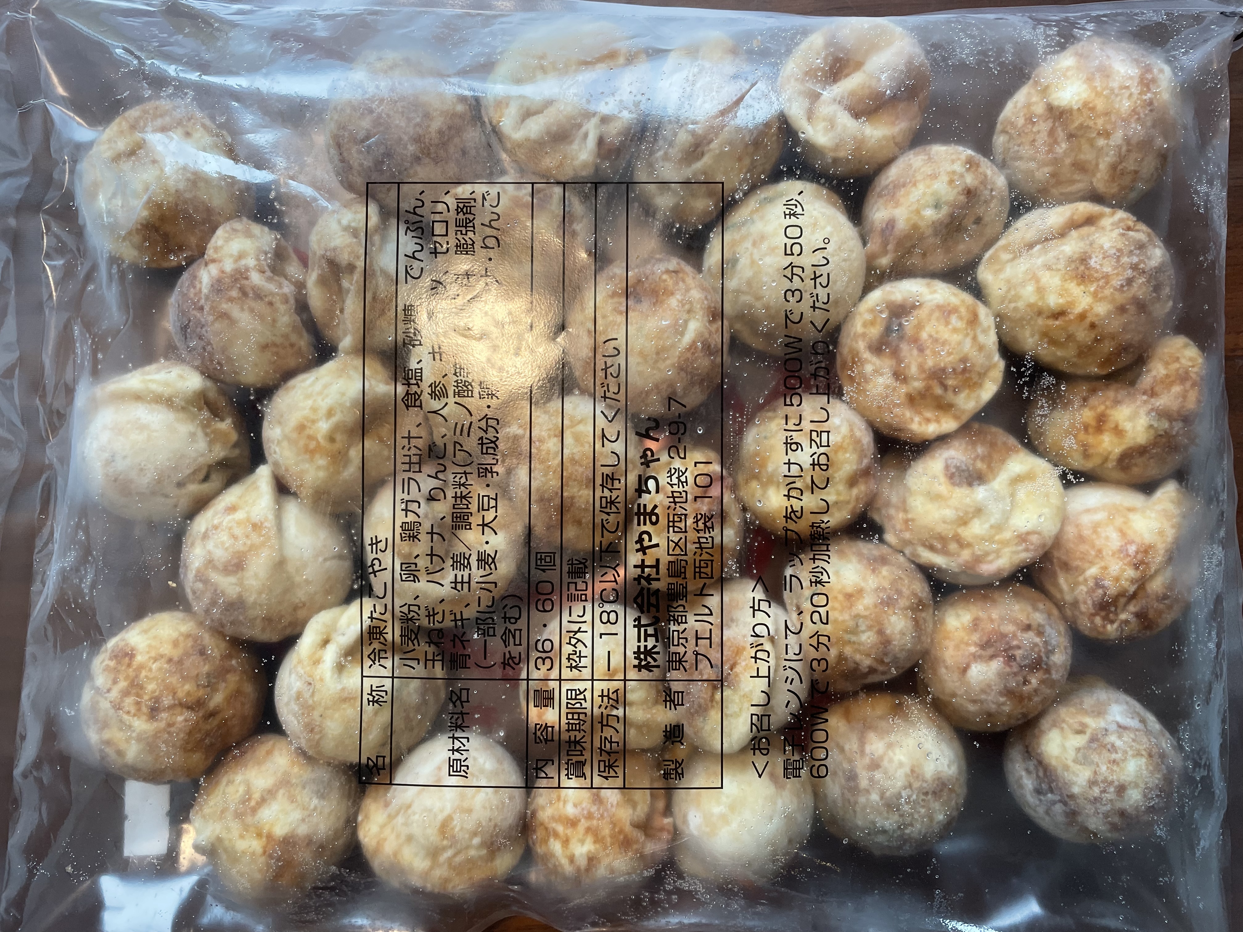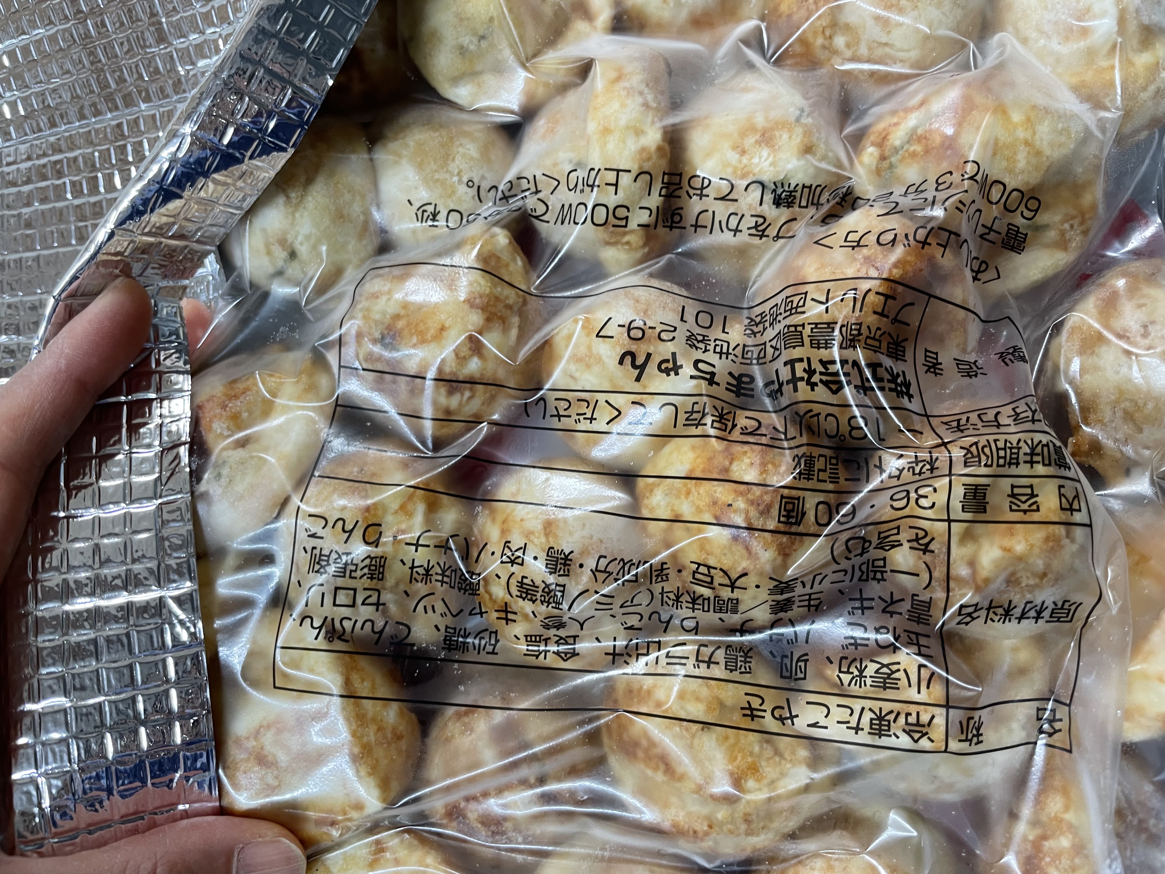 クール宅急便で指定時間に届きました。シルバーの宅配用保冷袋の中には、真空パックになったたこ焼き。シンプルでエコな包装に好感をもちました。たこ焼きは手軽におやつのように食べるものだから、これくらいのカジュアルさがちょうどいいです。36個の大きなたこ焼きが袋いっぱいにゴロゴロ入っているさまは、圧巻です!