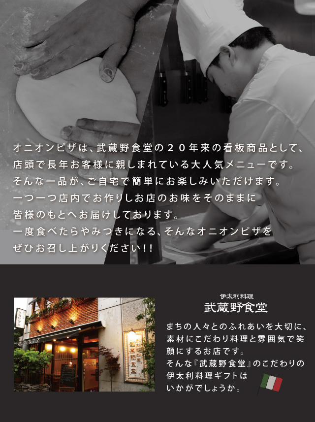 丁寧に時間をかけた秘伝のオニオンソースと、たっぷりチーズを生地にのせ焼き上げた武蔵野食堂20年来の看板商品。