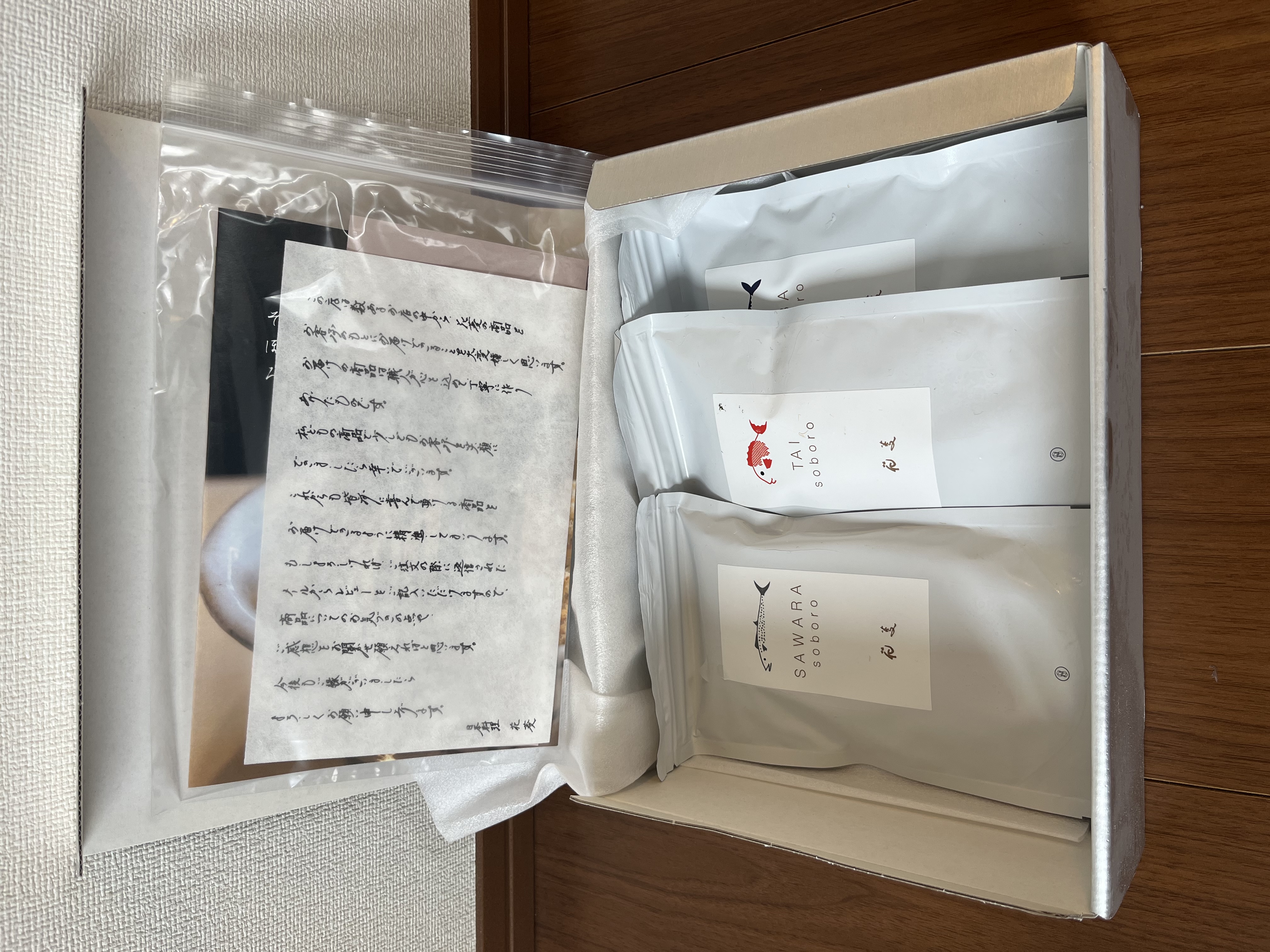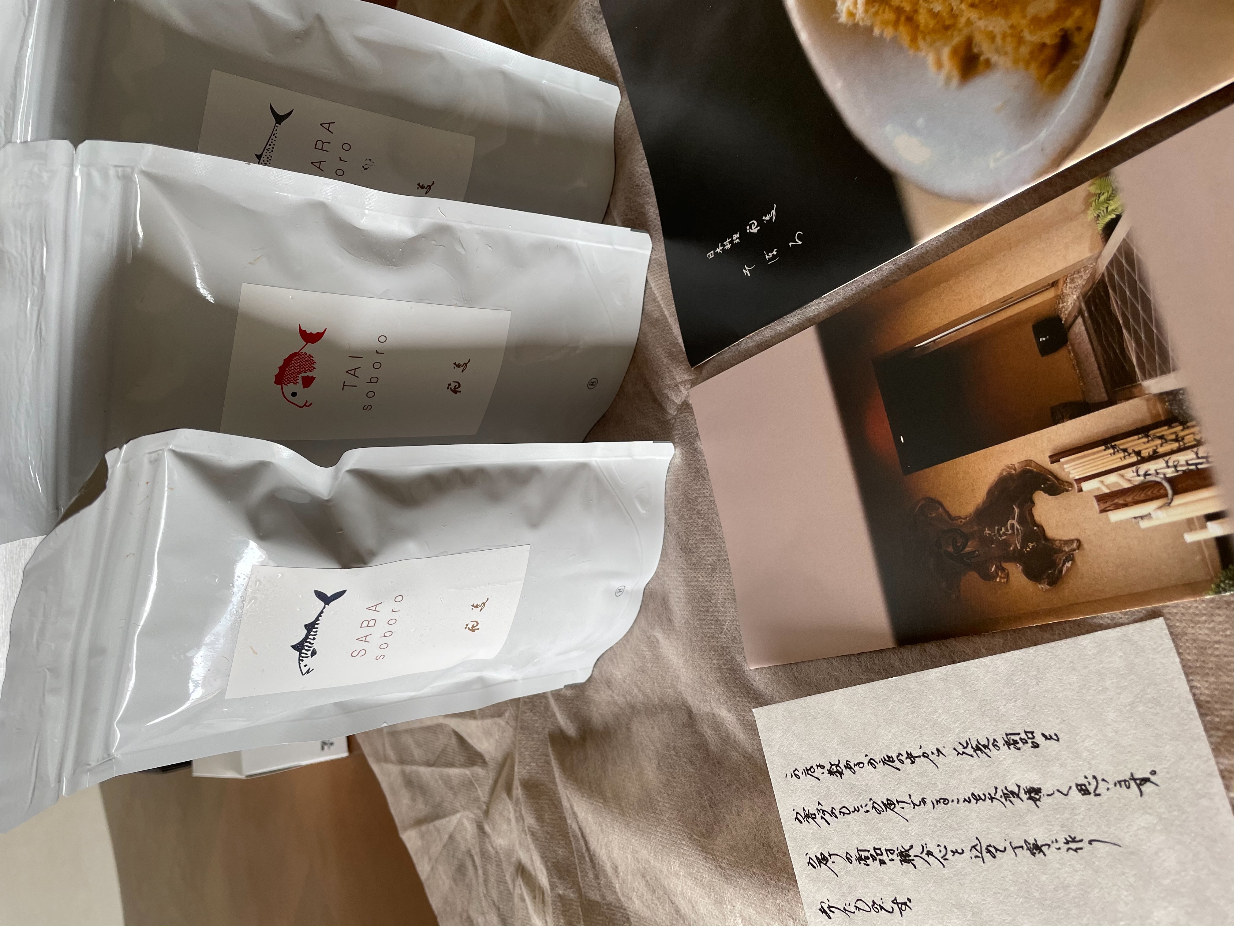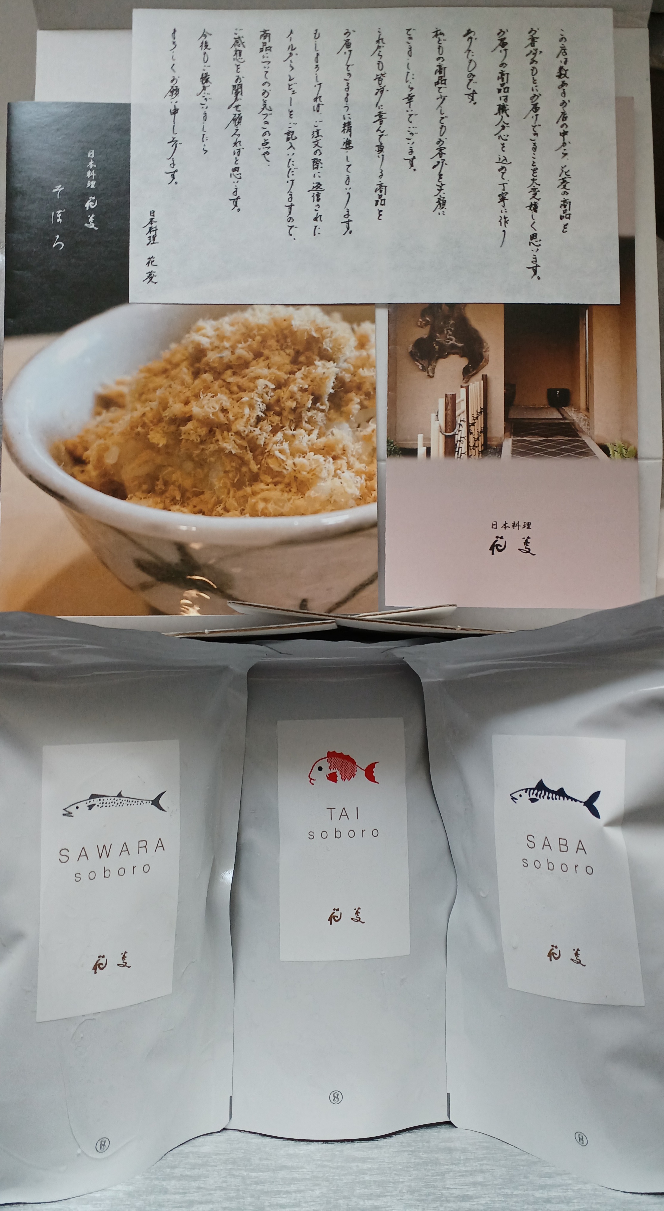 佐賀県唐津市にある創業50年以上の日本料理店が作る「鯛と鰆と鯖そぼろ」です。口に入れた瞬間から、あつあつの白米を包みこむような非常に柔らかい「ふわふわ」な食感を感じ、魚の旨味を引き出すために調味料は最小限で「あっさり」とした口当たりです。2回ほど噛むと徐々に「魚の深い旨味」が舌の上でひろがっていき、白ごはんの甘味と合わさり味が掛け算されていきます。「鯛そぼろ」は上品で気品のある旨味、「鰆そぼろ」は優しい旨味、「鯖そぼろ」は深いコクのある旨味を感じ三種三様の味わいを堪能できます。忙しい朝、熱々ごはんに振りかけるだけで充実した朝食になります。1袋で5~6膳のご飯に振りかけられる量の商品です。
