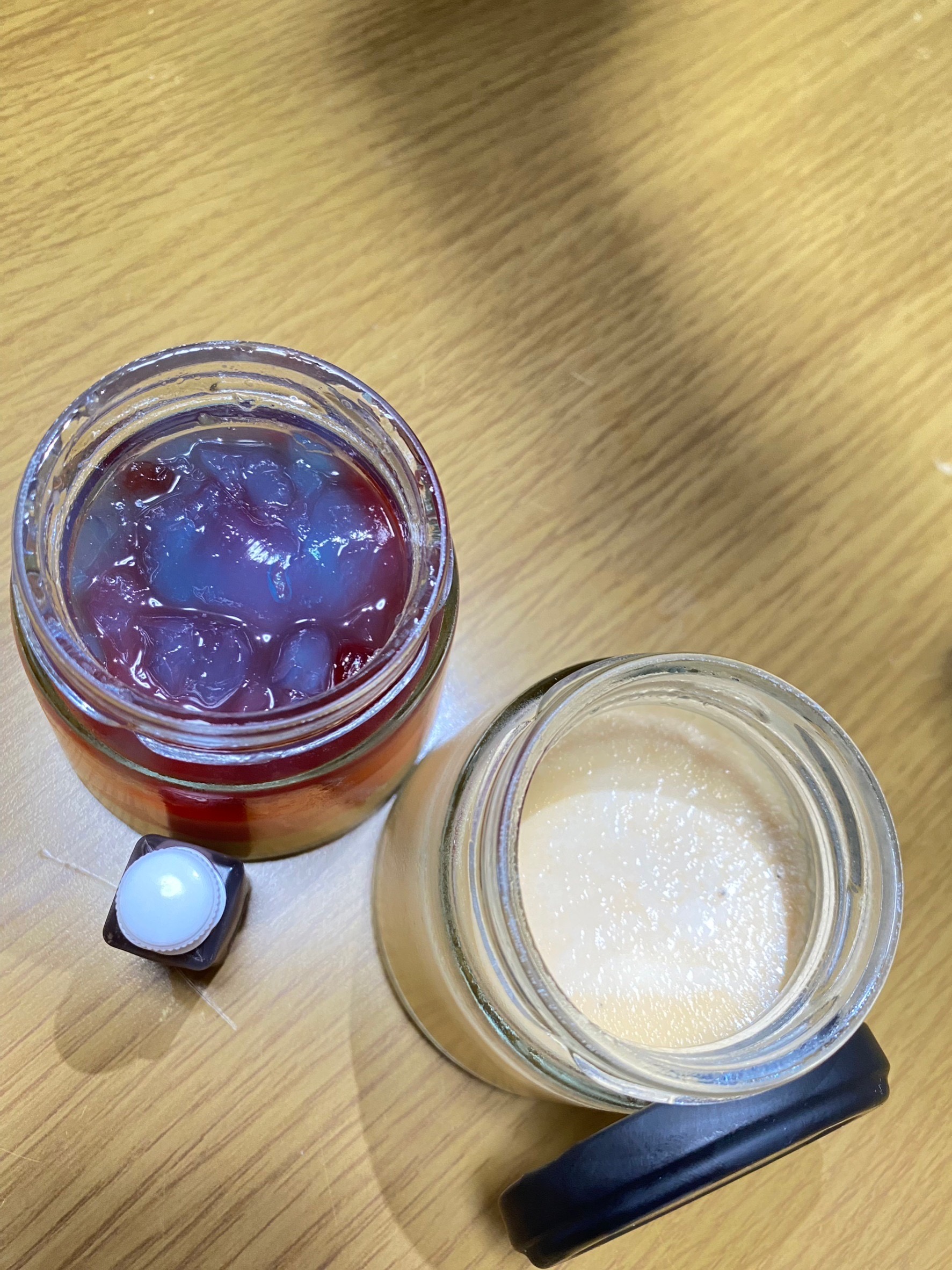 みっくすジュースプリンは3層にいちご味パンナコッタとゼリーとキャラメル味より少し硬めのプリンこちらは混ぜてると硬めむかしのプリン風の食感に単体で食べるとなめらかさが徐々にいちご風味豊かになっていていく混ぜてもそれぞれ楽しめる3用途あるような食感や味が本当に楽しめるとワクワクドキドキさせてくれるプリンデザートでした!!こんなスイーツありません楽しい嬉しかったです!!パッケージデザインおしゃれなのでアクセサリー入れたいです!!