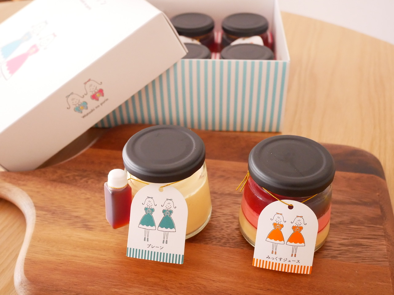 カラフルな色合いが印象的な「プリン」セットです。大阪名物みっくすジュースをイメージした「大阪みっくすジュースプリン」は、下から桃果汁入りプリン、苺のプリン、そして1番上にはキャラクターのイメージカラーに合わせたブルーと赤の色鮮やかなジュレをトッピングしています。ベーシックな口当たりなめらかなプリン「プレーンプリン」は、クオリティにとことんこだわった、とろ~りなめらかな食感が特長です。マダガスカル産の高級天然バニラビーンズを使用しているのでバニラの風味が口いっぱいに広がります。他の材料は全国産素材を使用。老若男女問わず幅広く楽しめます。可愛らしいイラスト入りのボックスに入って届くので、手土産スイーツとしてもおすすめです。